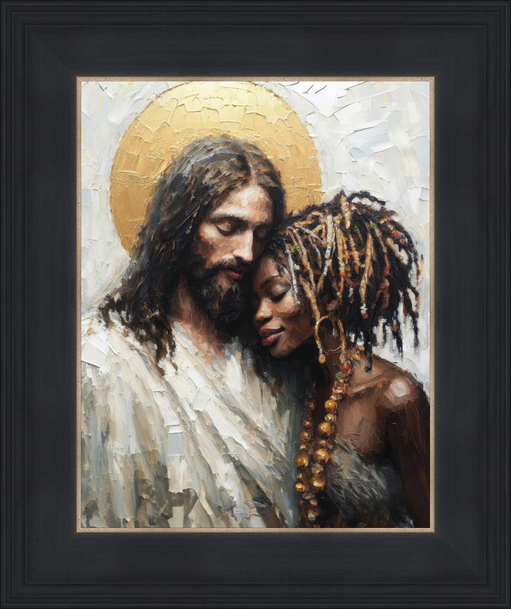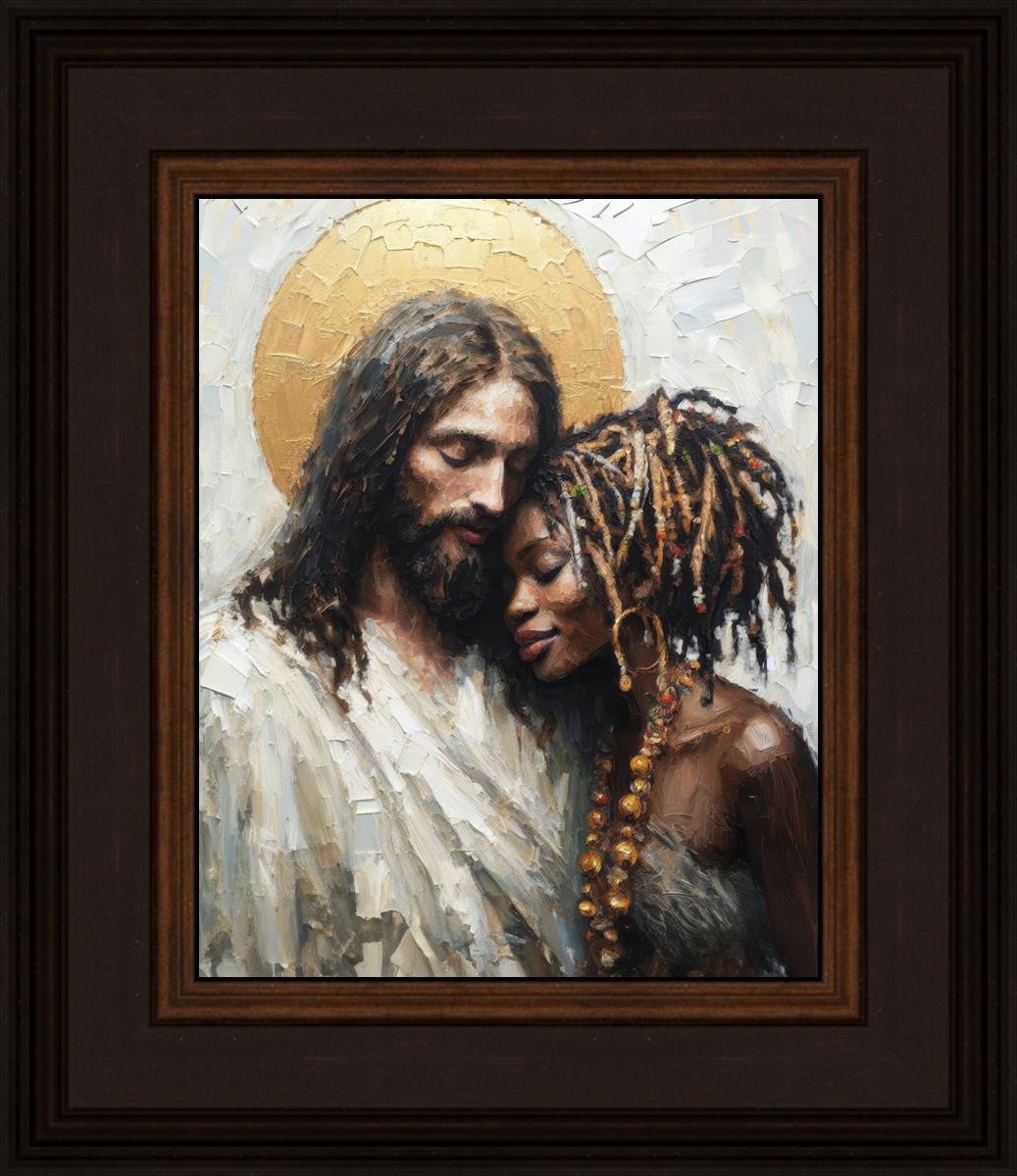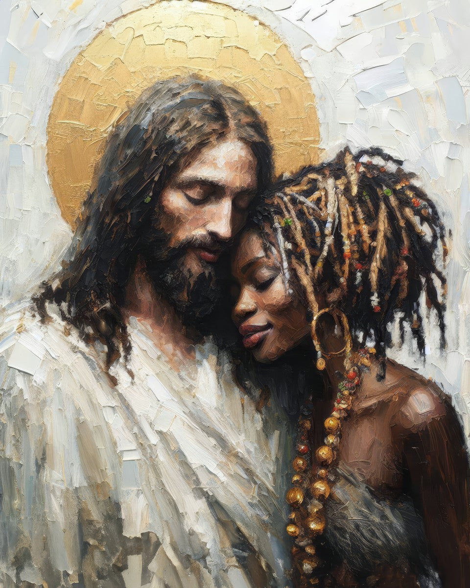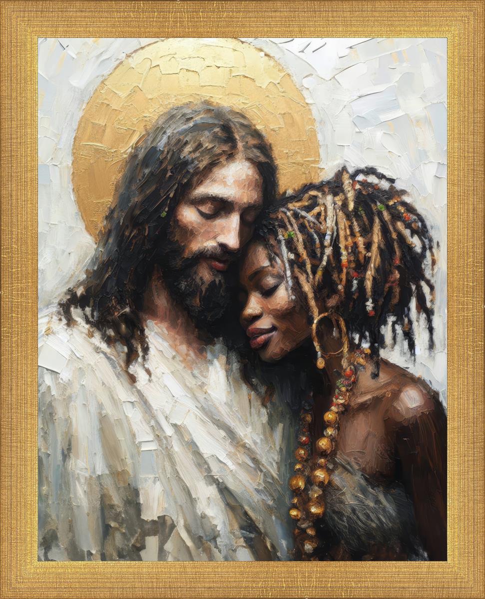 In this tender portrait, we capture a moment of connection between the woman and her Savior, illustrating the timeless promise of rest and renewal found in Christ, regardless of who you are. In a world filled with turmoil and uncertainty, this painting serves as a reminder that true peace can be found in the arms of Jesus, where burdens are lifted and rest is offered to weary souls.
