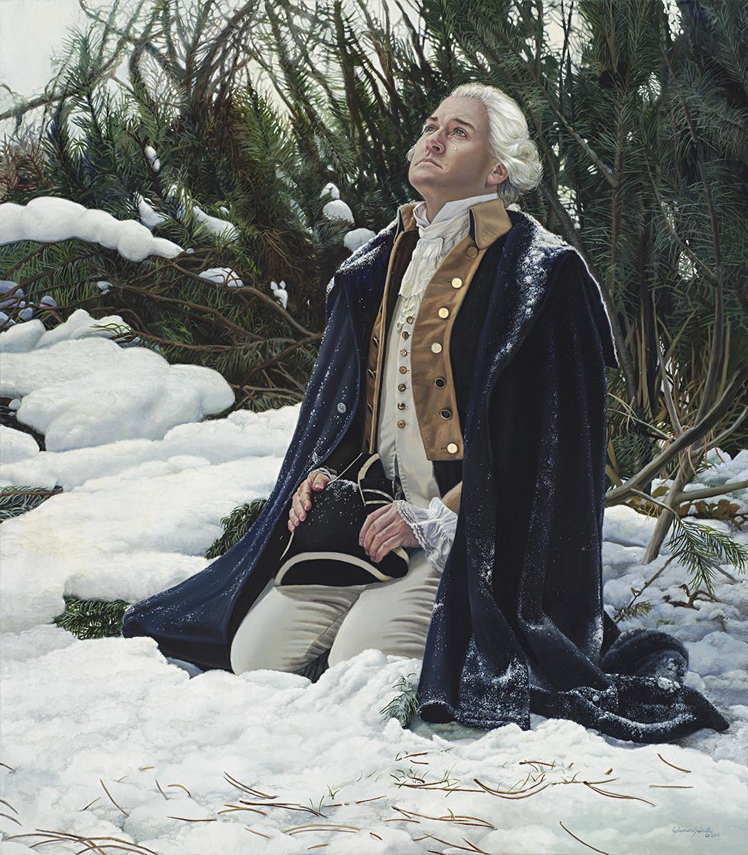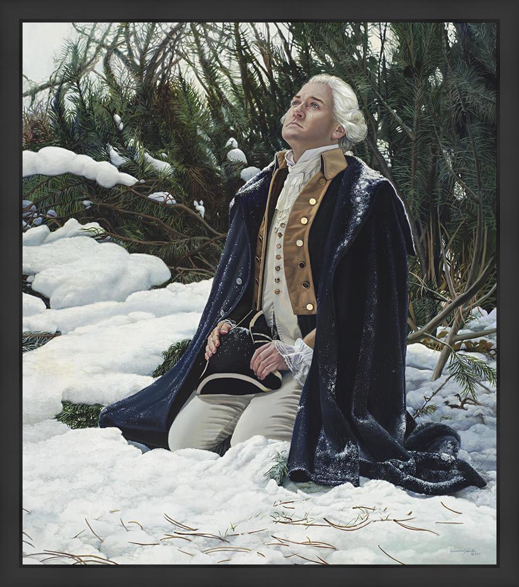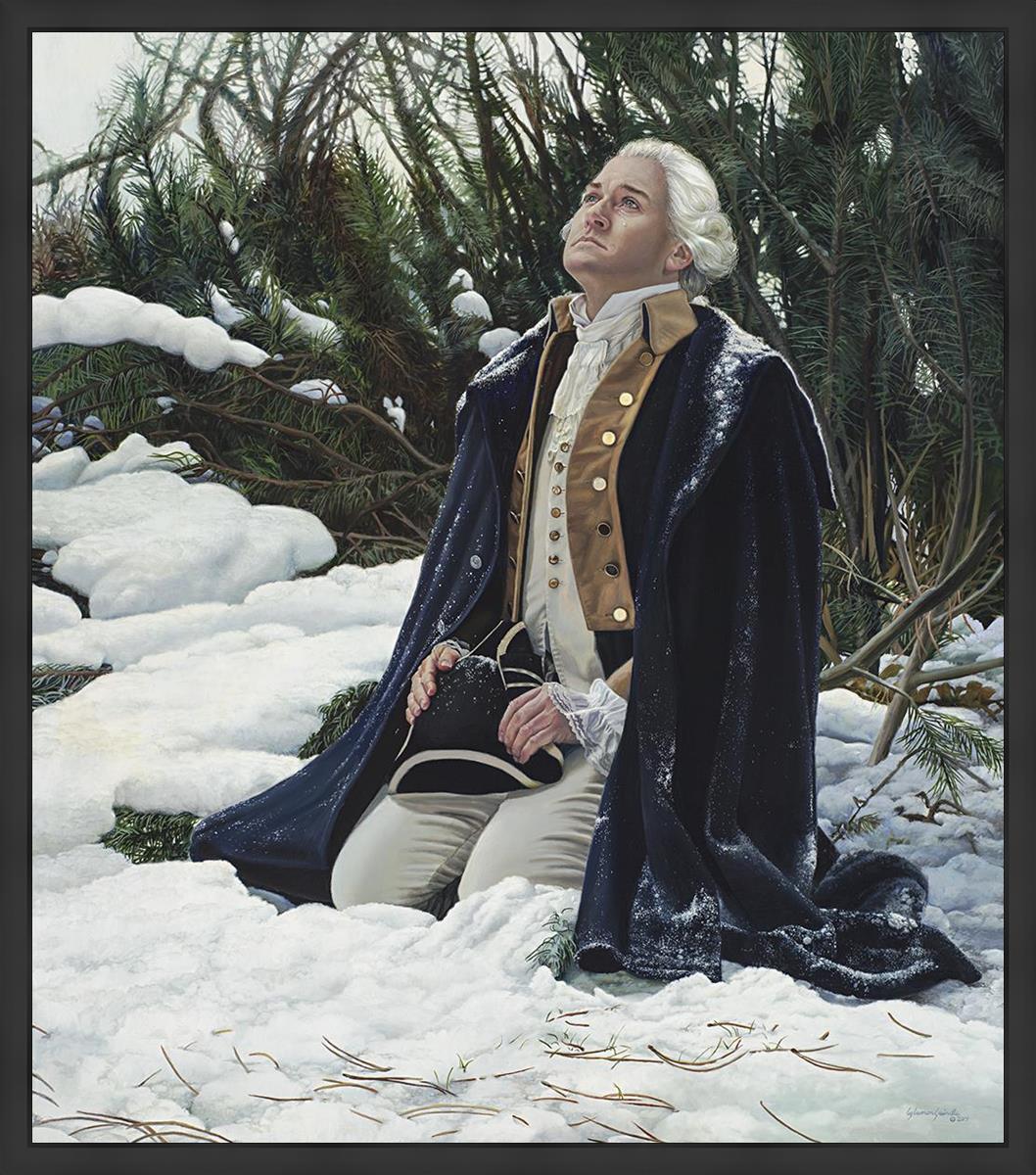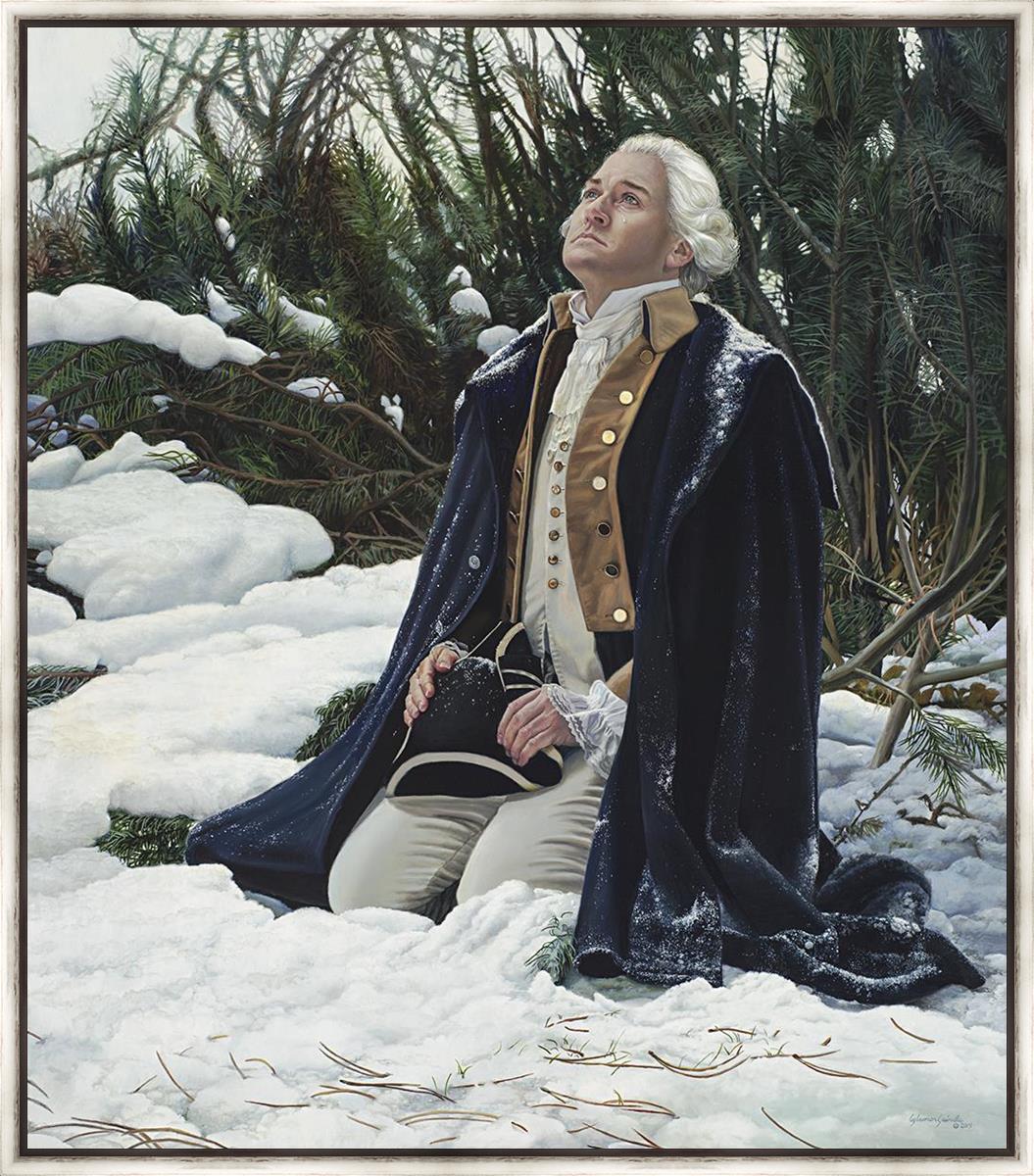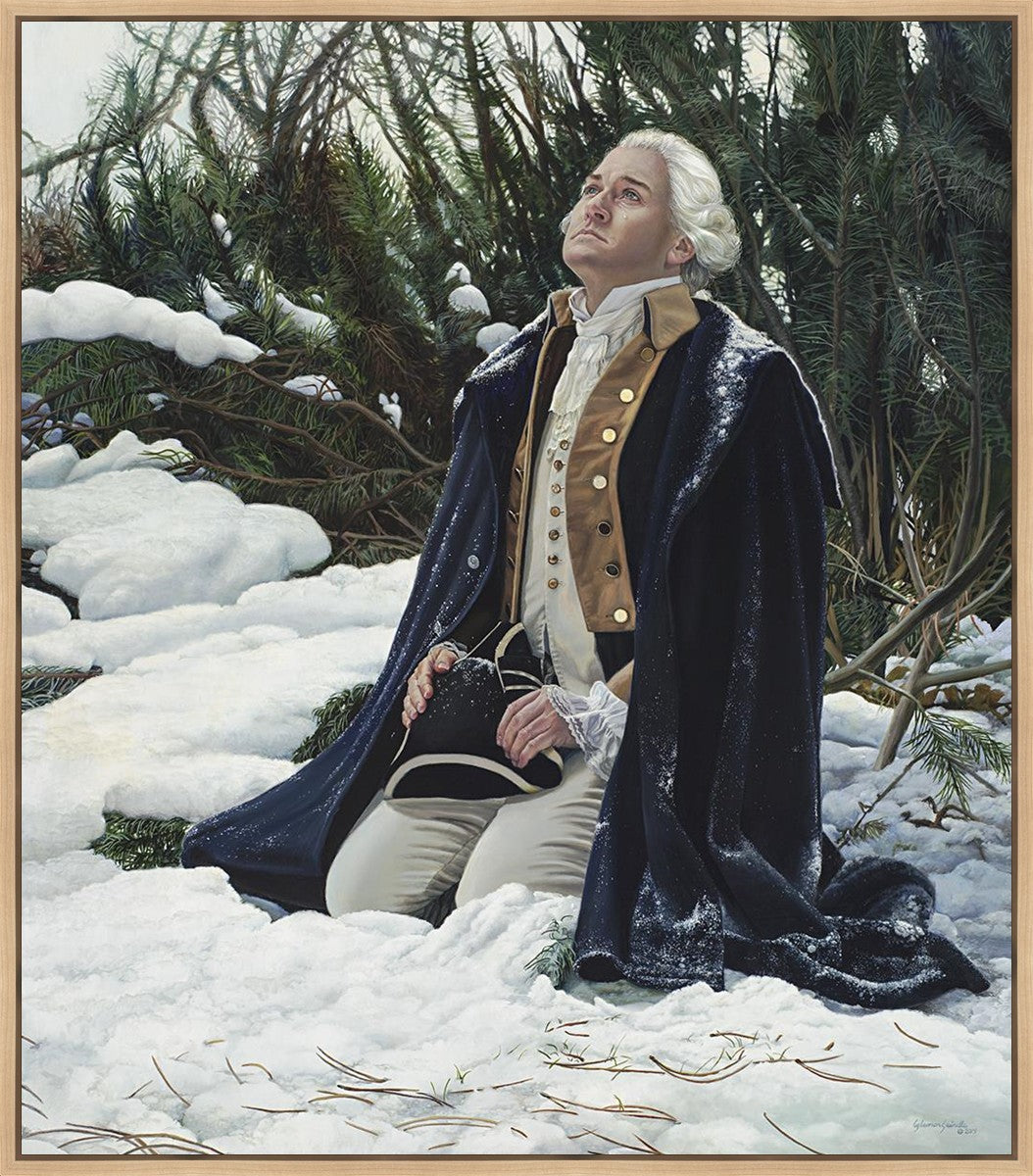 The seed for Liz Lemon Swindle’s painting In God We Trust was planted by none other than political commentator Glenn Beck, author of the book Being George Washington. A conversation between the two had evolved around to Liz’s love for Arnold Friberg’s Prayer at Valley Forge. Beck too loved the painting. He then off-handedly remarked it was too bad Friberg had not depicted the moment with Washington on the ground on both knees, as that was how he was known to pray. The idea blossomed.