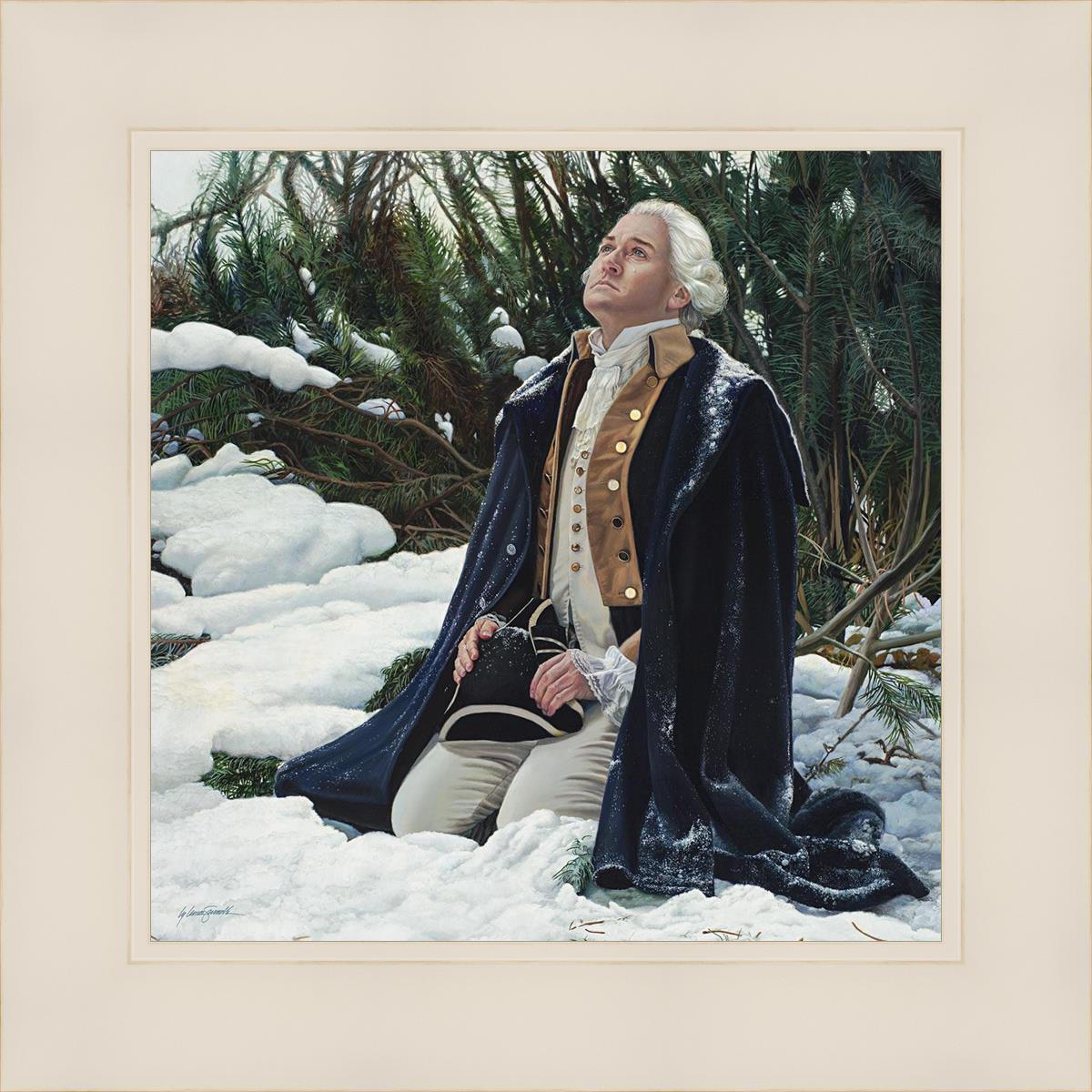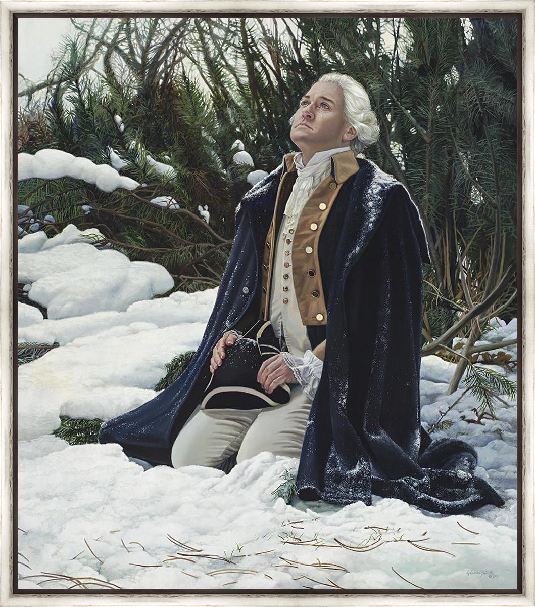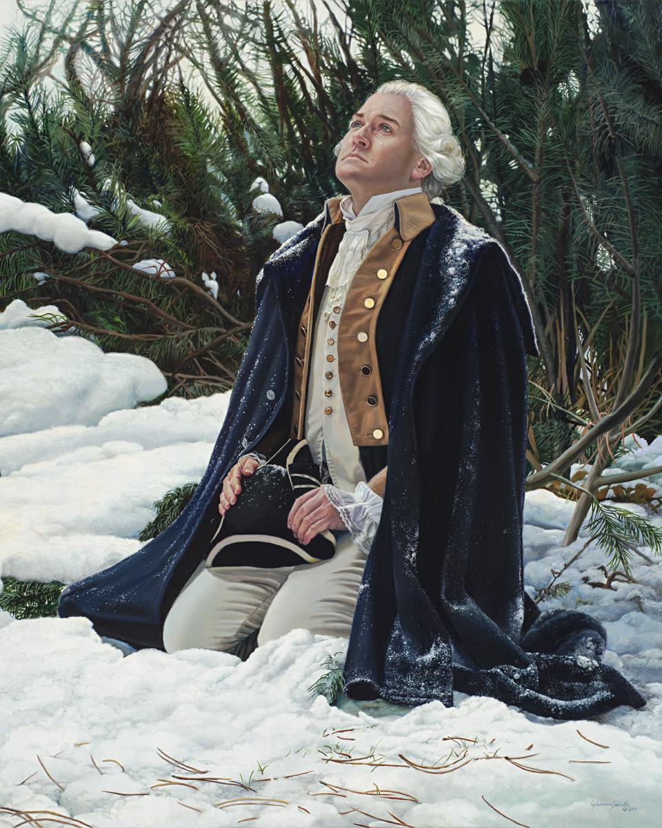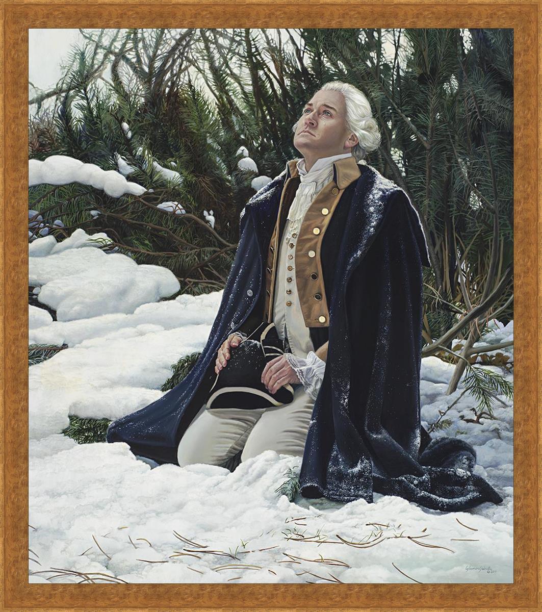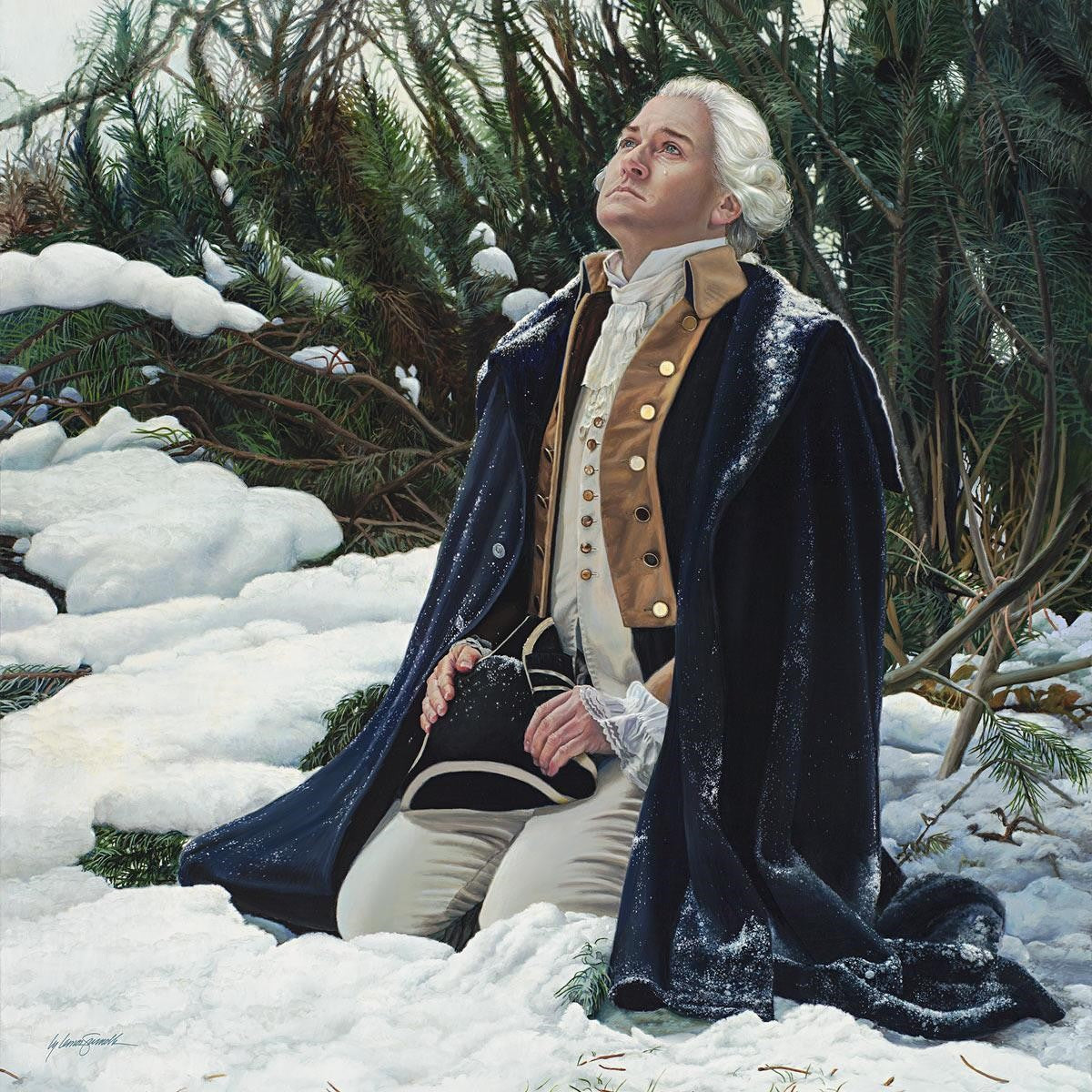 The seed for Liz Lemon Swindle’s painting In God We Trust was planted by none other than political commentator Glenn Beck, author of the book Being George Washington. A conversation between the two had evolved around to Liz’s love for Arnold Friberg’s Prayer at Valley Forge. Beck too loved the painting. He then off-handedly remarked it was too bad Friberg had not depicted the moment with Washington on the ground on both knees, as that was how he was known to pray. The idea blossomed.