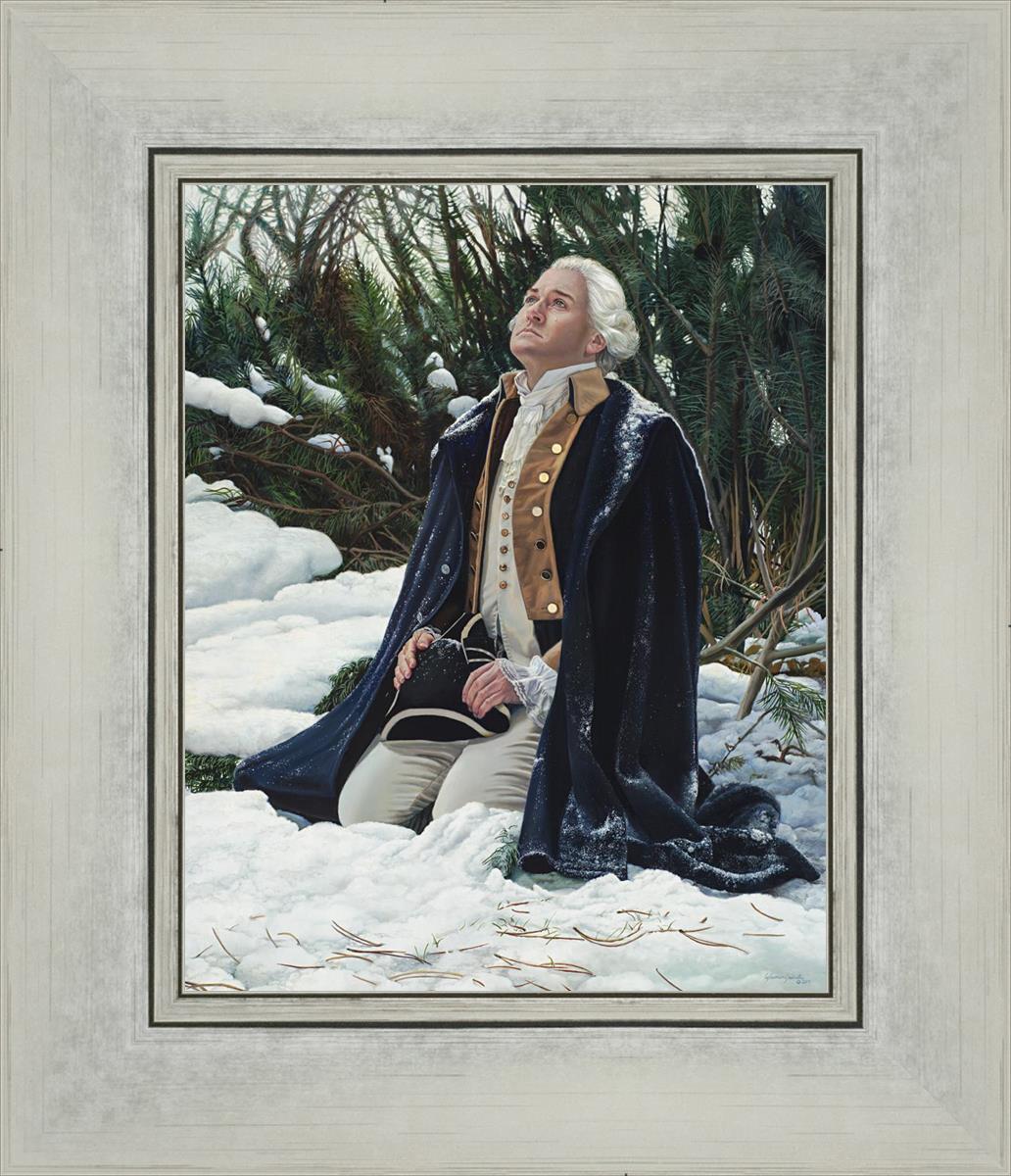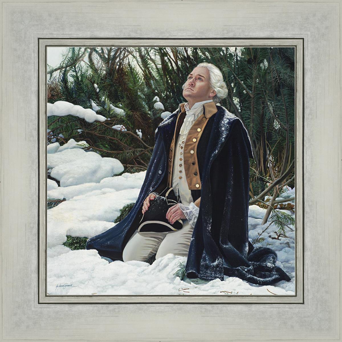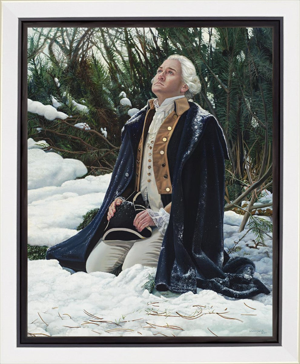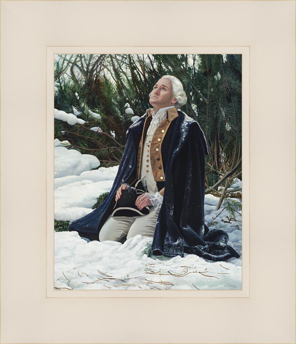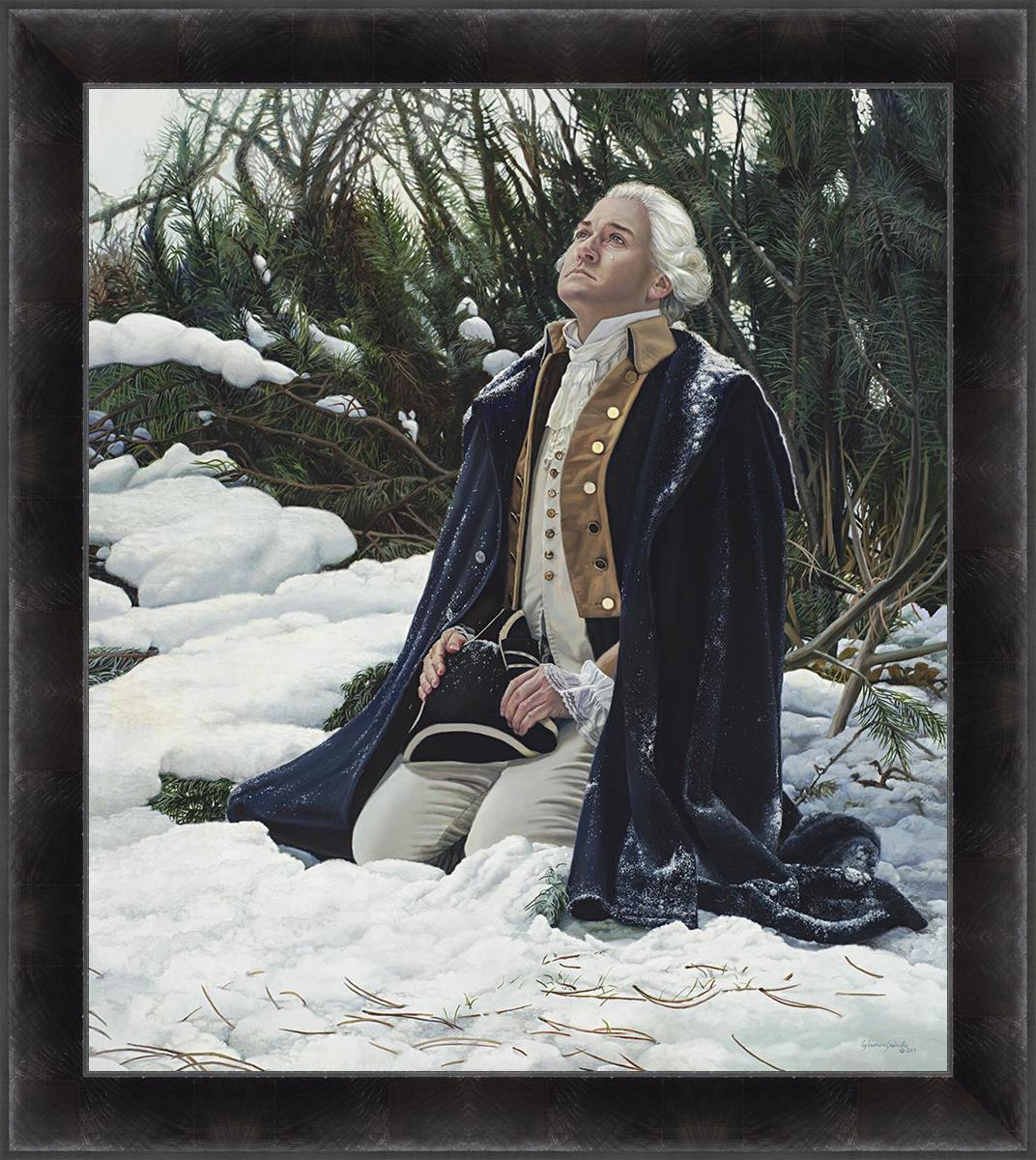 The seed for Liz Lemon Swindle’s painting In God We Trust was planted by none other than political commentator Glenn Beck, author of the book Being George Washington. A conversation between the two had evolved around to Liz’s love for Arnold Friberg’s Prayer at Valley Forge. Beck too loved the painting. He then off-handedly remarked it was too bad Friberg had not depicted the moment with Washington on the ground on both knees, as that was how he was known to pray. The idea blossomed.
