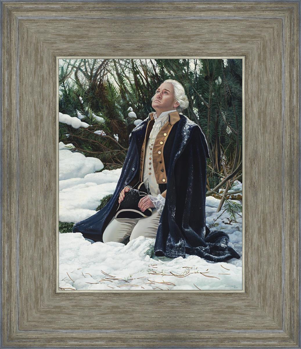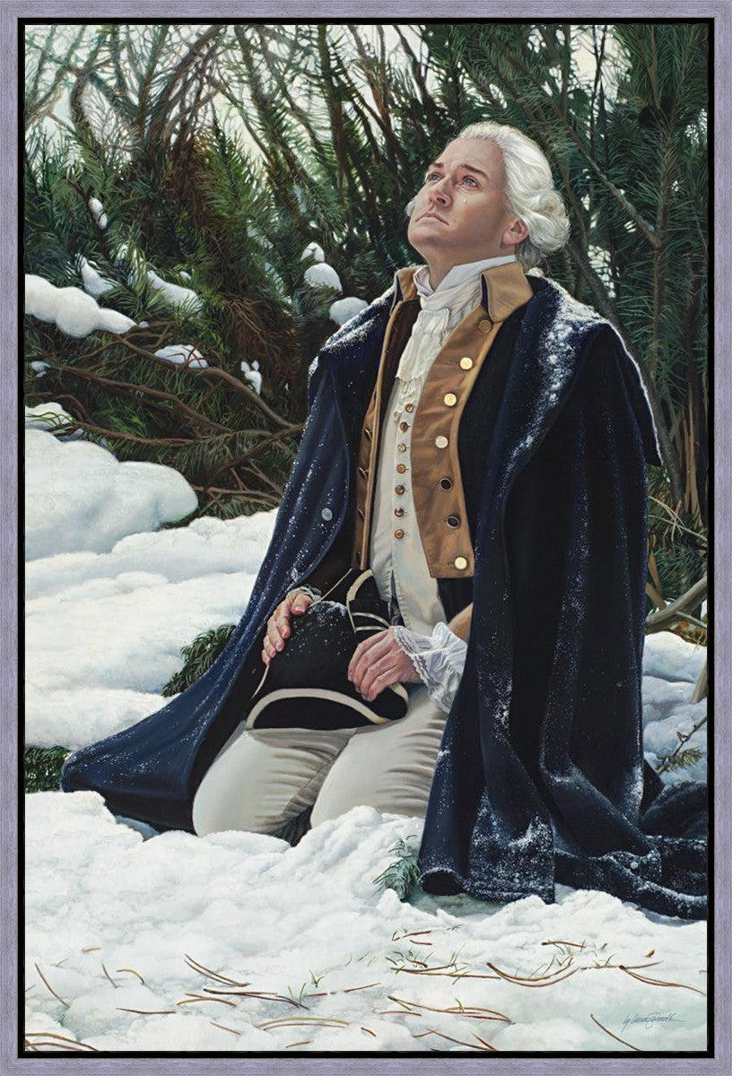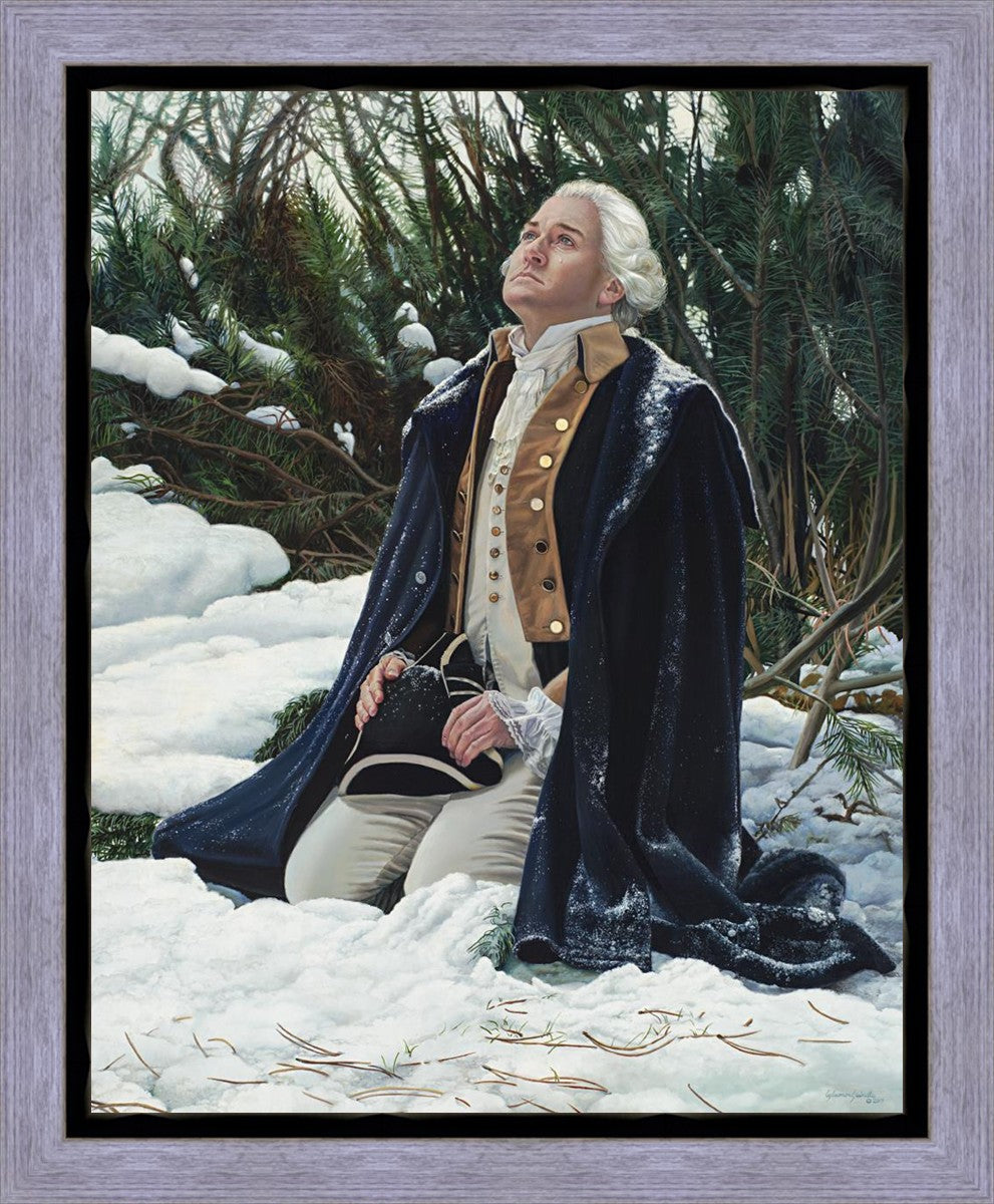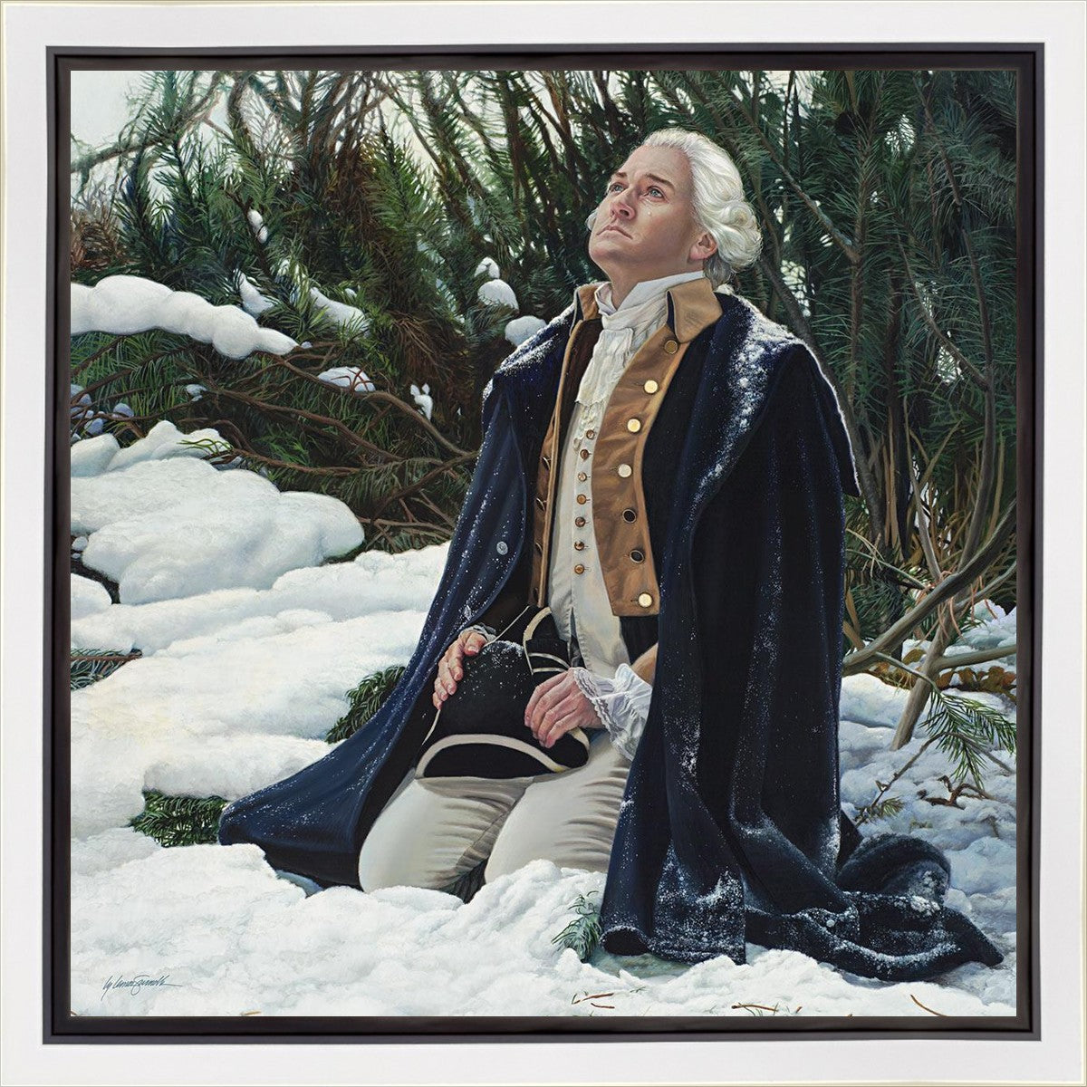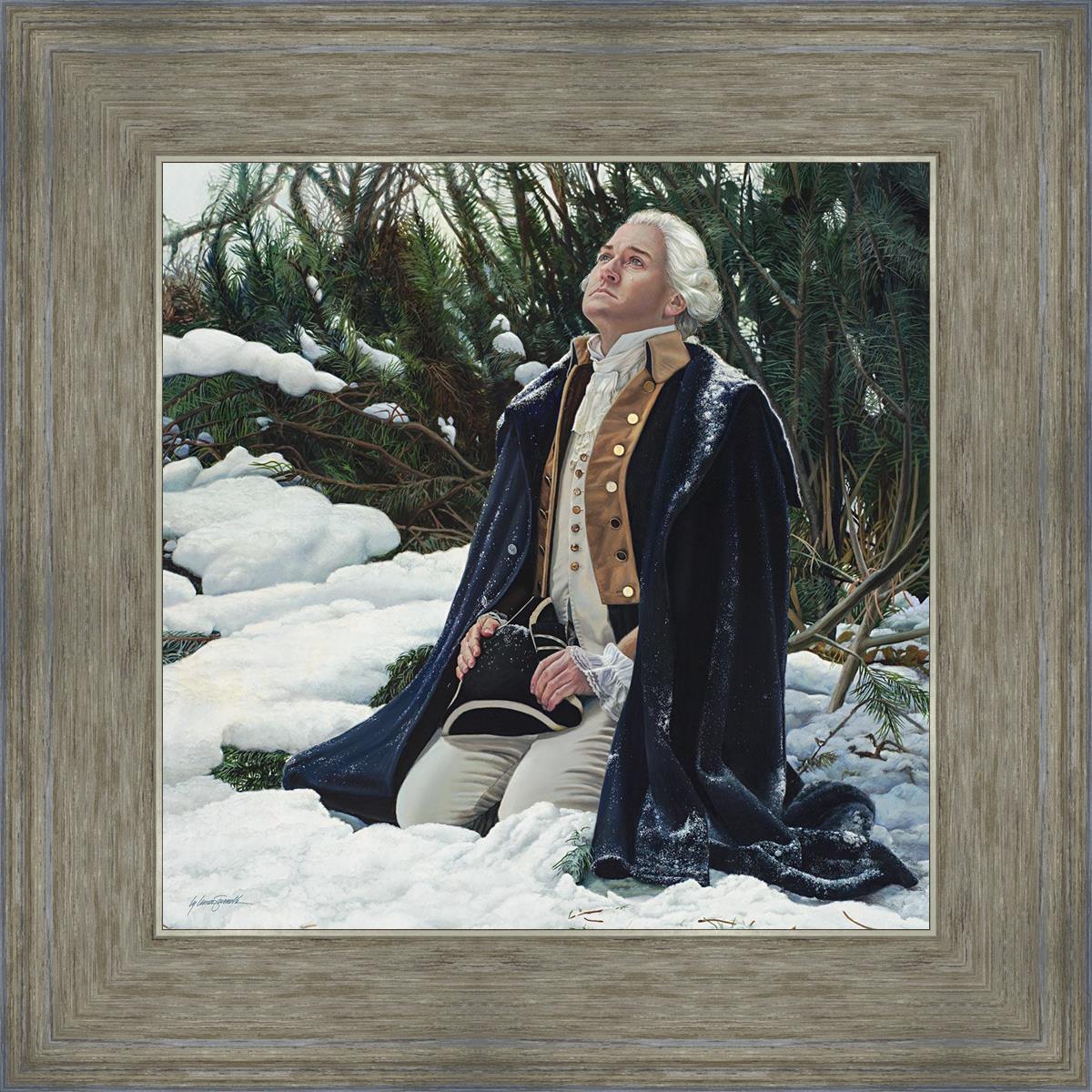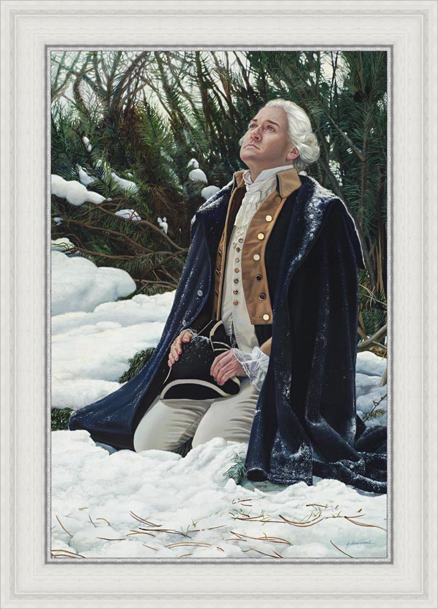 The seed for Liz Lemon Swindle’s painting In God We Trust was planted by none other than political commentator Glenn Beck, author of the book Being George Washington. A conversation between the two had evolved around to Liz’s love for Arnold Friberg’s Prayer at Valley Forge. Beck too loved the painting. He then off-handedly remarked it was too bad Friberg had not depicted the moment with Washington on the ground on both knees, as that was how he was known to pray. The idea blossomed.