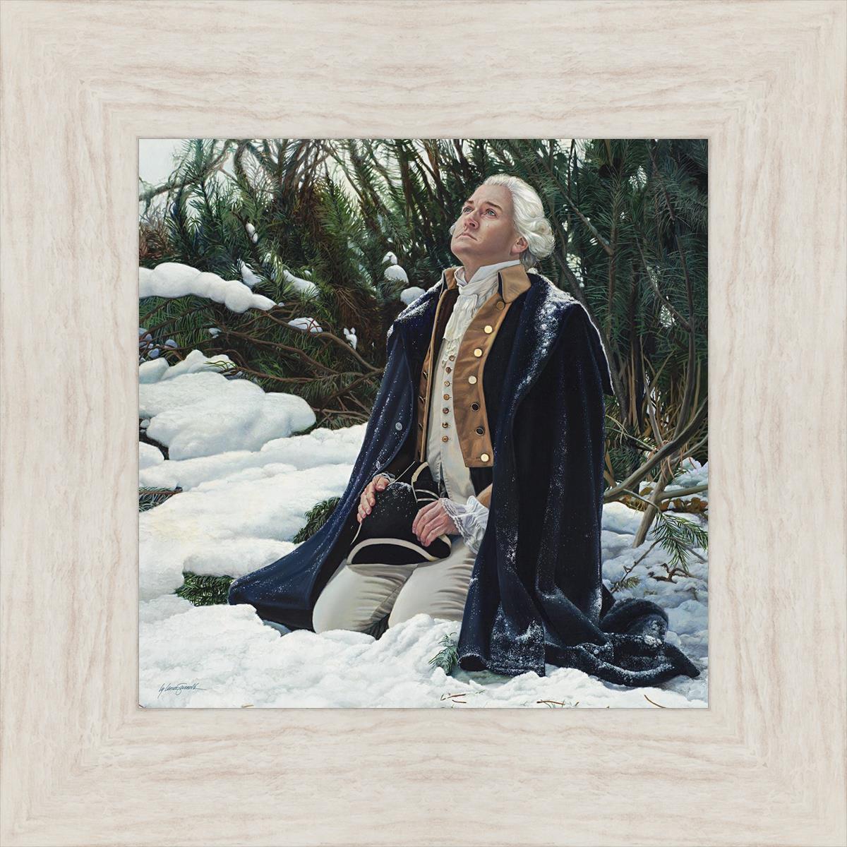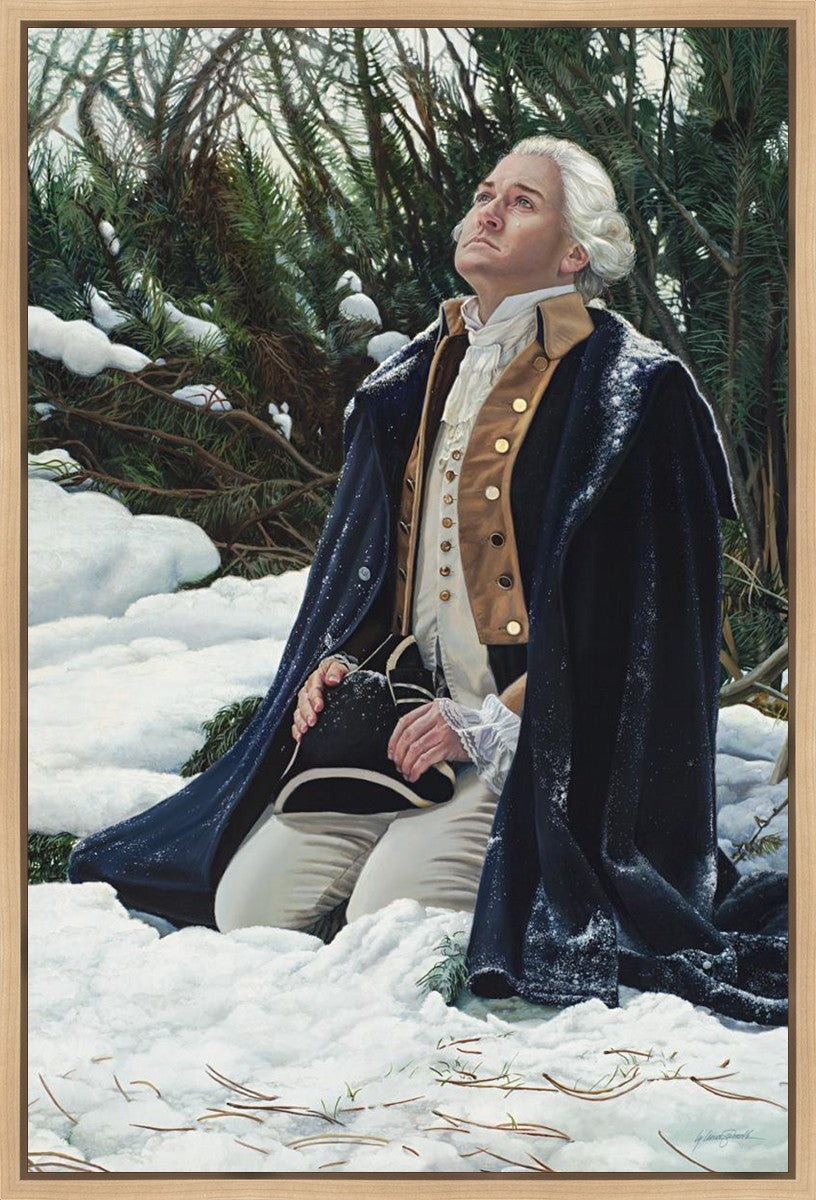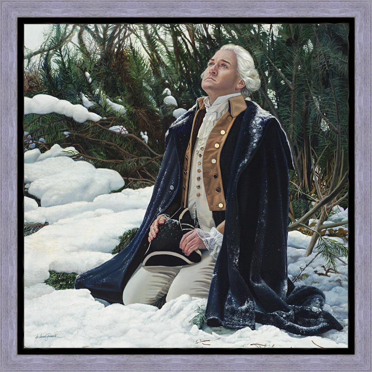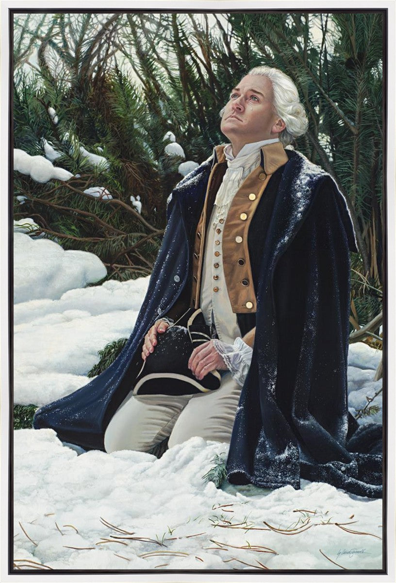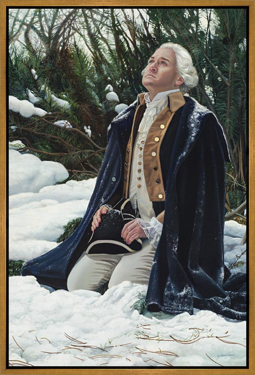 The seed for Liz Lemon Swindle’s painting In God We Trust was planted by none other than political commentator Glenn Beck, author of the book Being George Washington. A conversation between the two had evolved around to Liz’s love for Arnold Friberg’s Prayer at Valley Forge. Beck too loved the painting. He then off-handedly remarked it was too bad Friberg had not depicted the moment with Washington on the ground on both knees, as that was how he was known to pray. The idea blossomed.