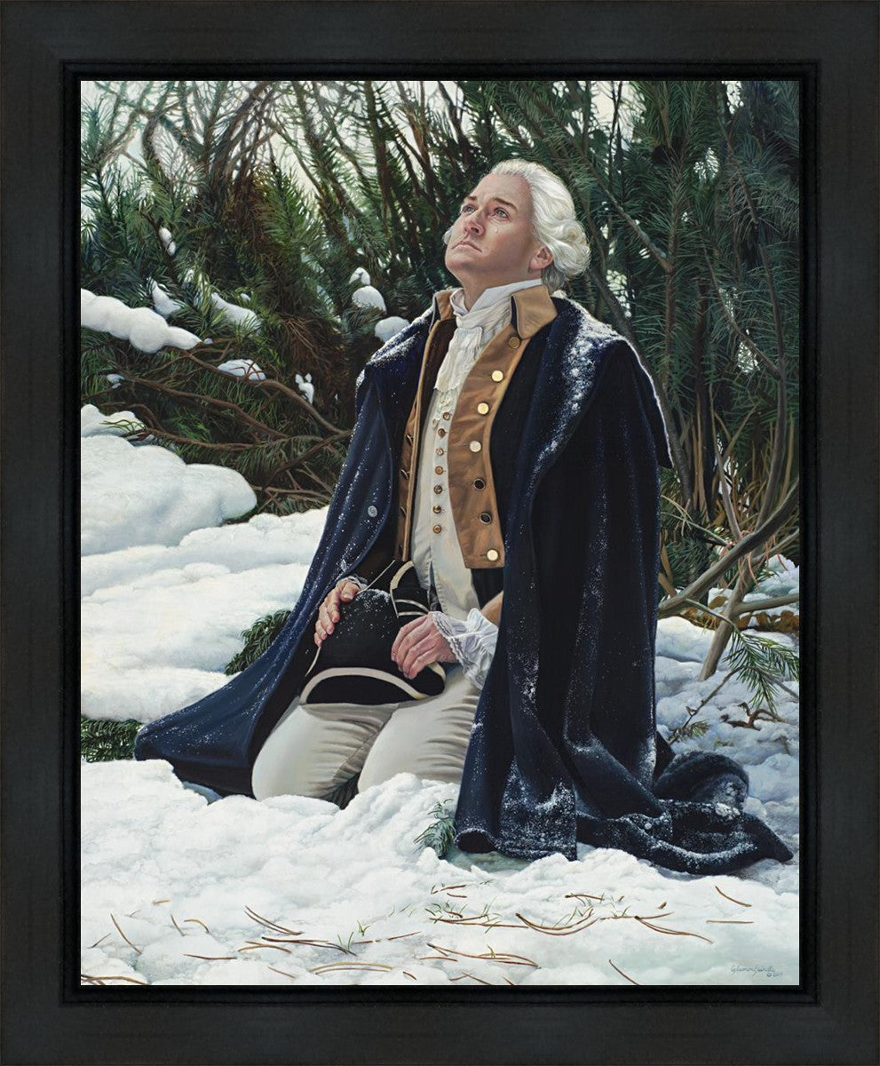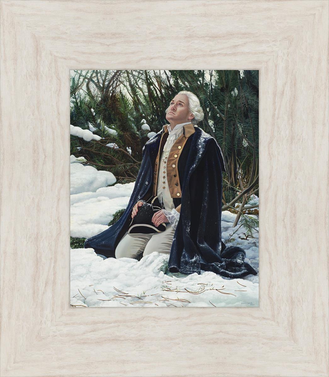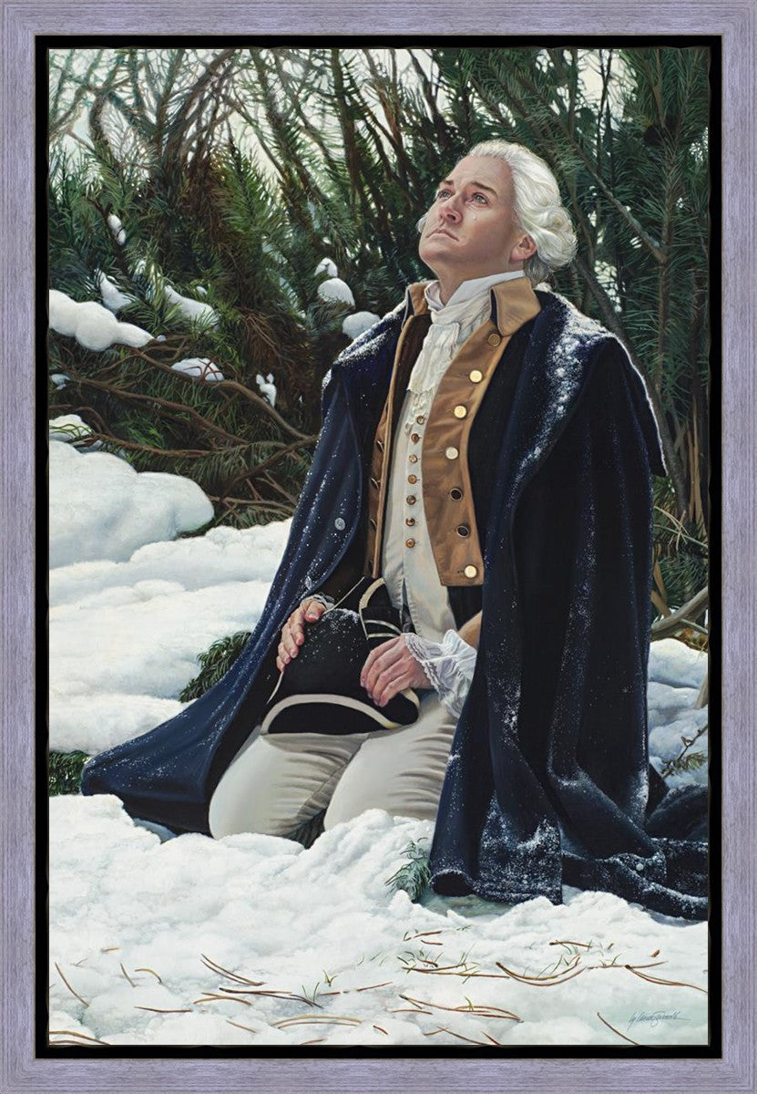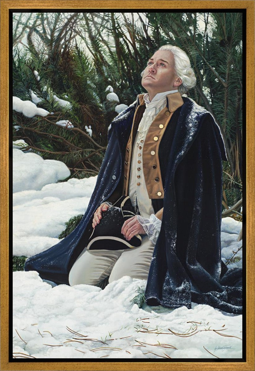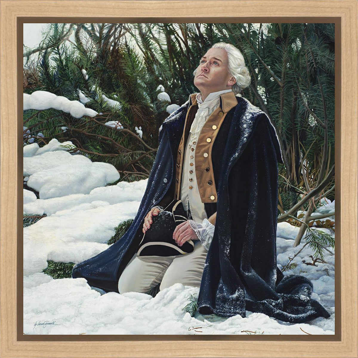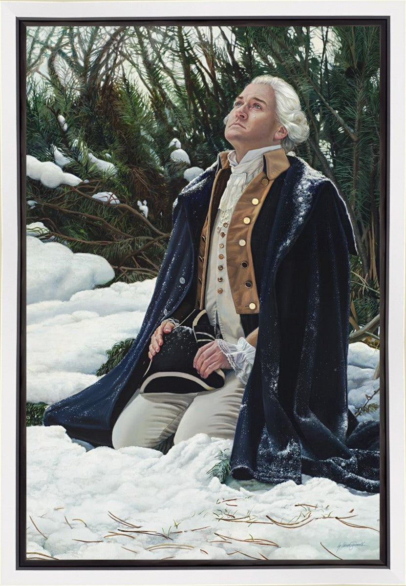 The seed for Liz Lemon Swindle’s painting In God We Trust was planted by none other than political commentator Glenn Beck, author of the book Being George Washington. A conversation between the two had evolved around to Liz’s love for Arnold Friberg’s Prayer at Valley Forge. Beck too loved the painting. He then off-handedly remarked it was too bad Friberg had not depicted the moment with Washington on the ground on both knees, as that was how he was known to pray. The idea blossomed.