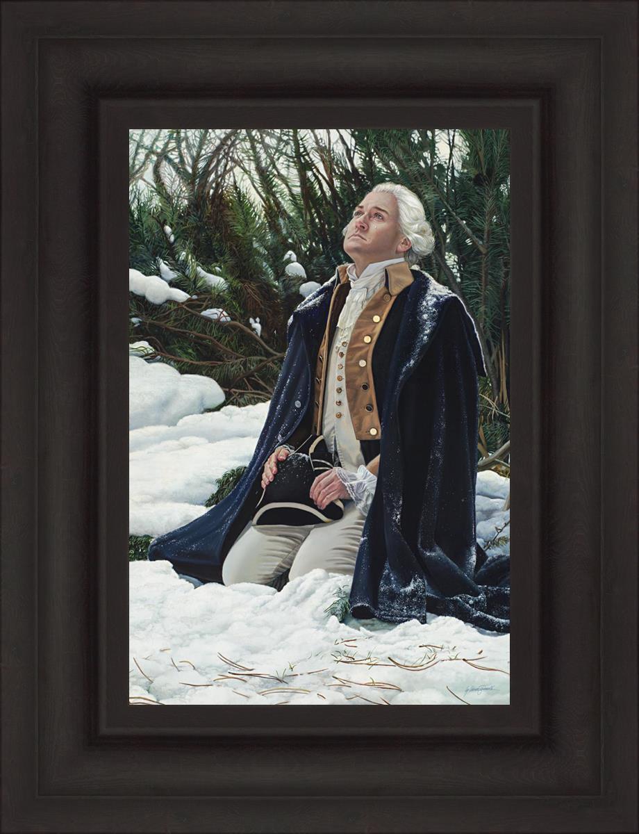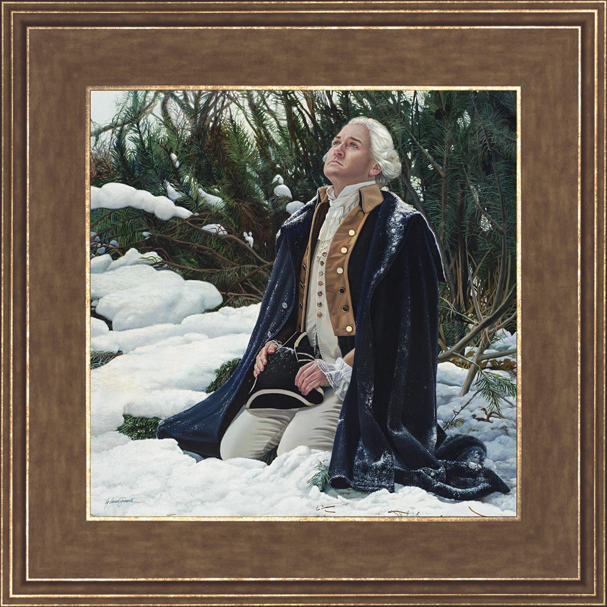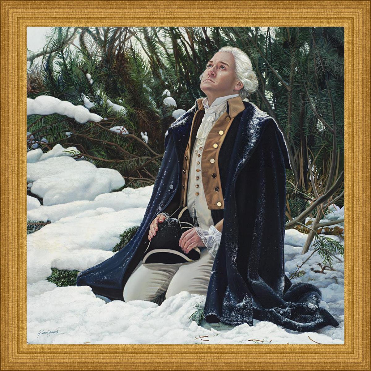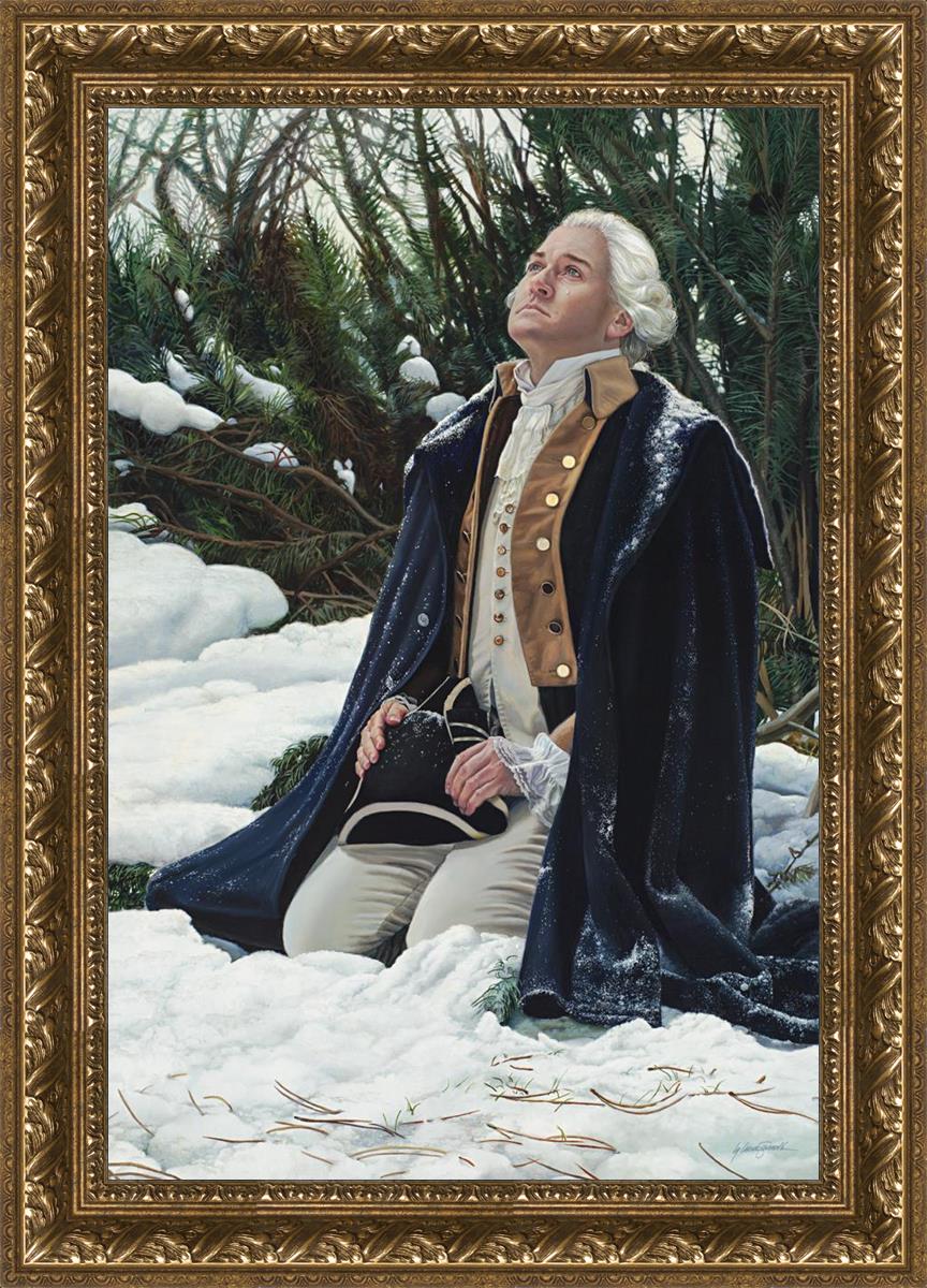 In God We Trust is a painting by Liz Lemon Swindle. This painting depicts George Washingon praying and looking up to God while kneeling on the snow covered ground.