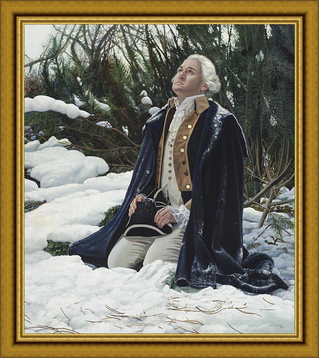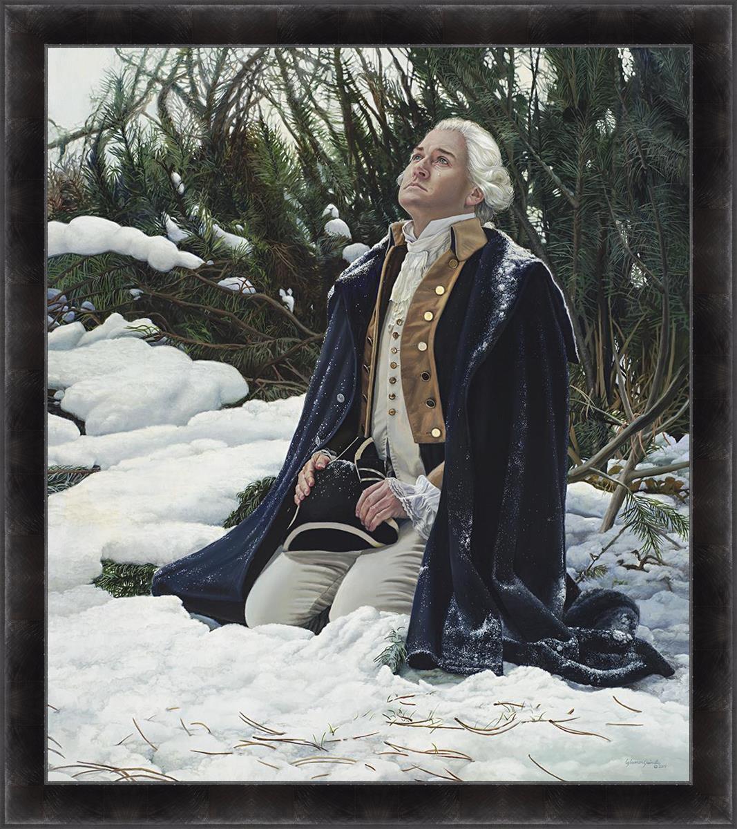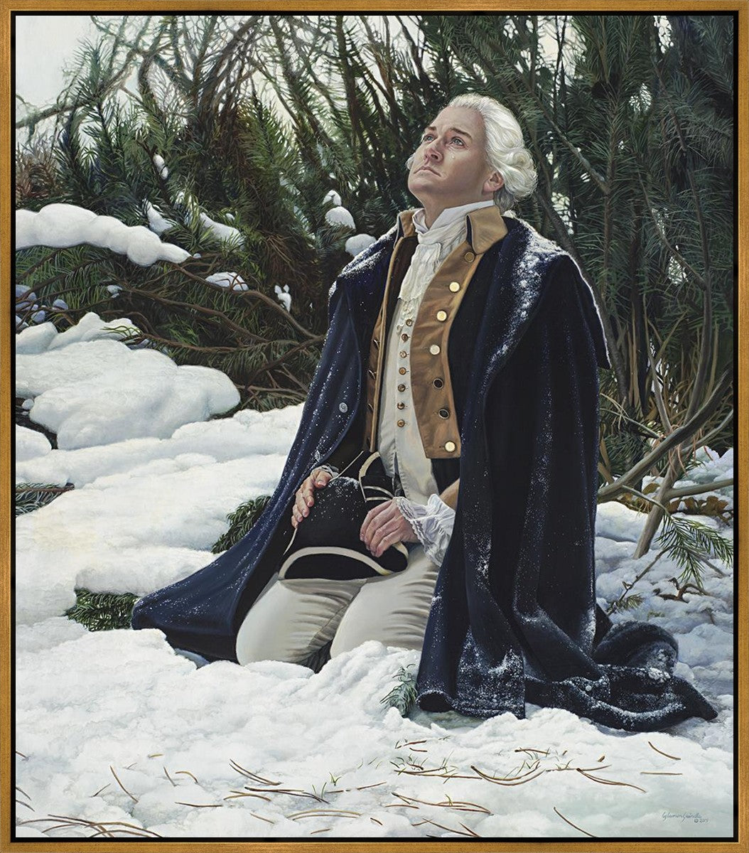 But in her painting it is not that we encounter Washington on his knees that is so captivating, but rather the strength of his conviction we see in his eyes. We see in him the eyes of faith. That he carries the burden of his imperiled country is abundantly clear. He gazes towards heaven, petitioning Providence for personal guidance and for the eternal might to strengthen freedom’s righteous cause. Yet, neither is he panicked, nor is he lost. In God We Trust captures, in an intimate moment of communion, the guiding light the Founding Fathers followed in creating this great nation. (Liz Lemon Swindle)