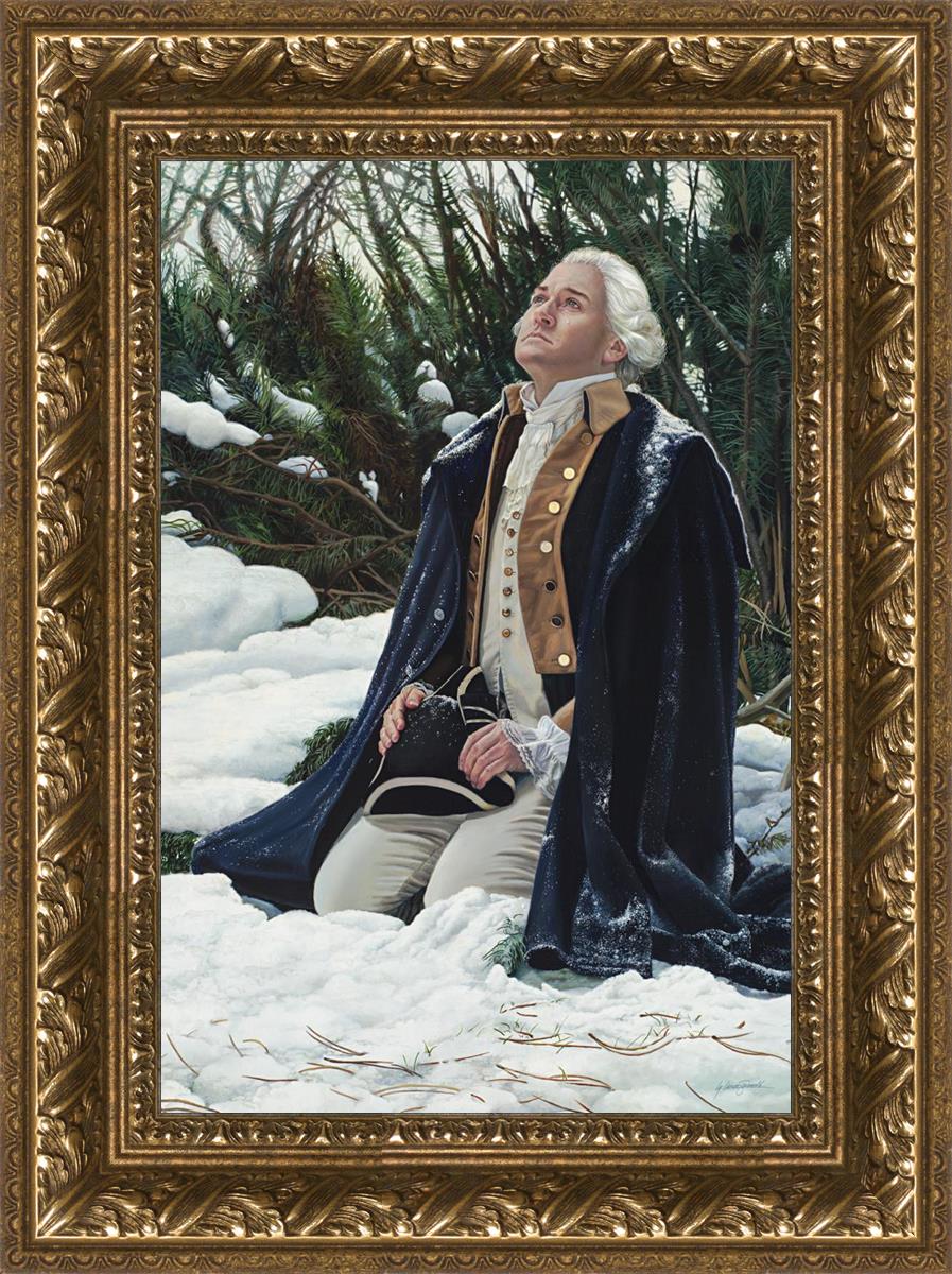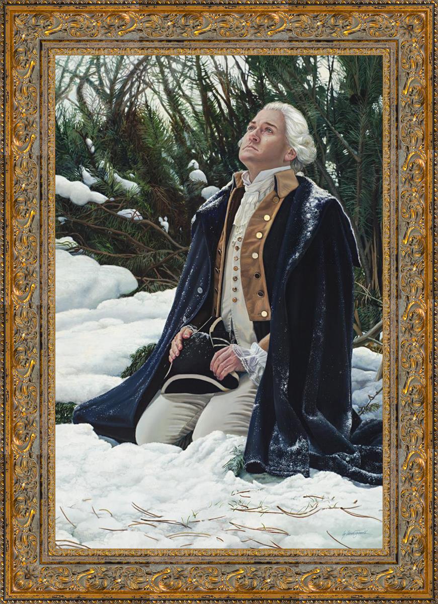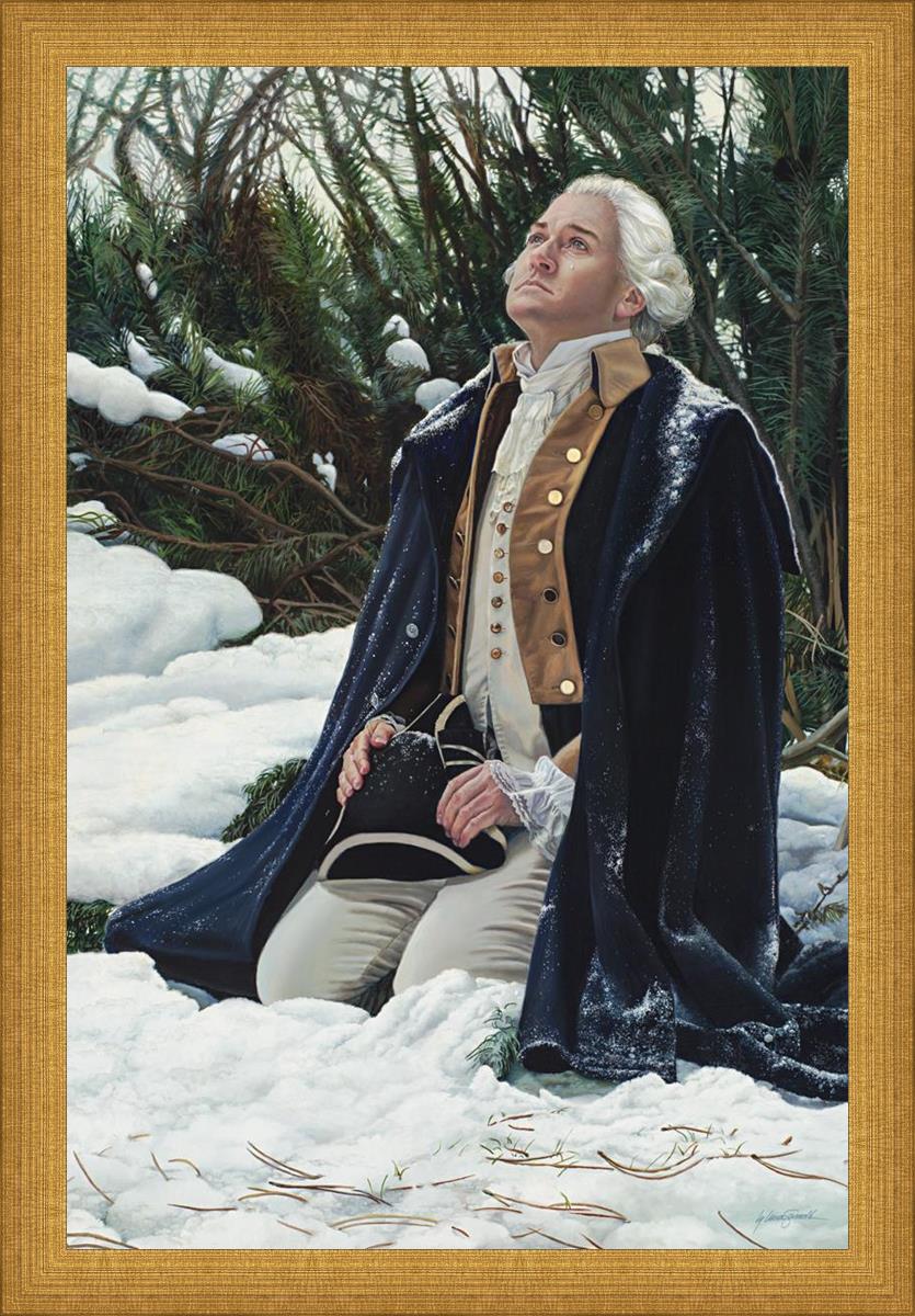 But in her painting it is not that we encounter Washington on his knees that is so captivating, but rather the strength of his conviction we see in his eyes. We see in him the eyes of faith. That he carries the burden of his imperiled country is abundantly clear. He gazes towards heaven, petitioning Providence for personal guidance and for the eternal might to strengthen freedom’s righteous cause. Yet, neither is he panicked, nor is he lost. In God We Trust captures, in an intimate moment of communion, the guiding light the Founding Fathers followed in creating this great nation. (Liz Lemon Swindle)
