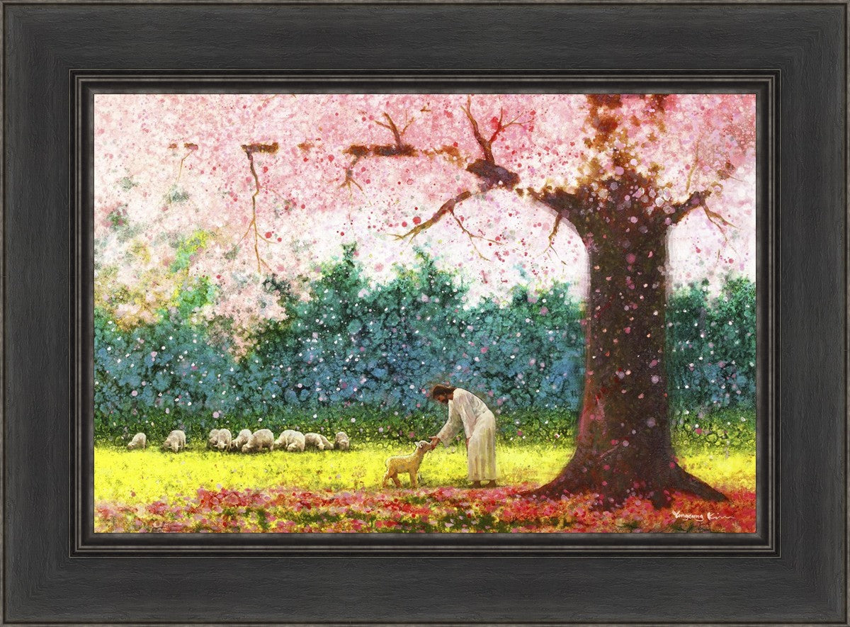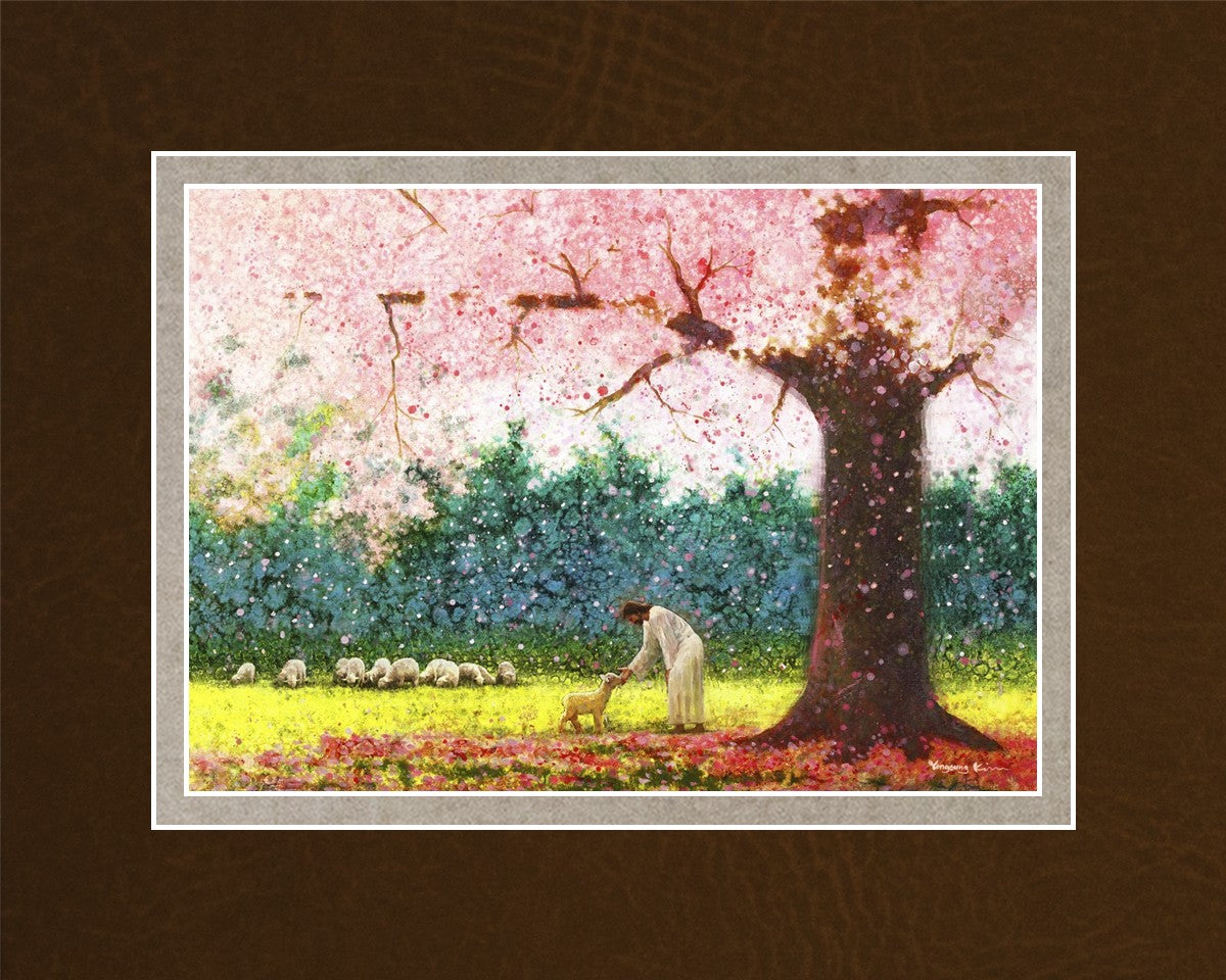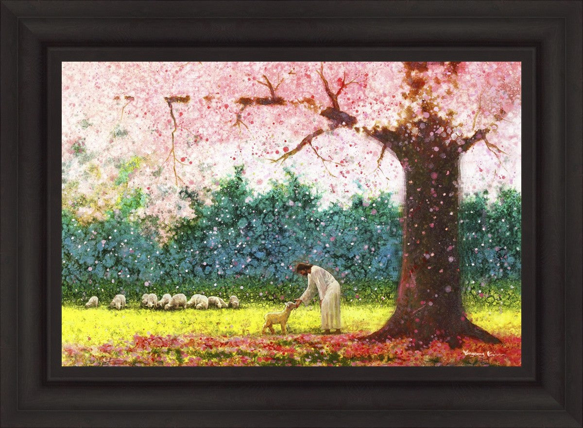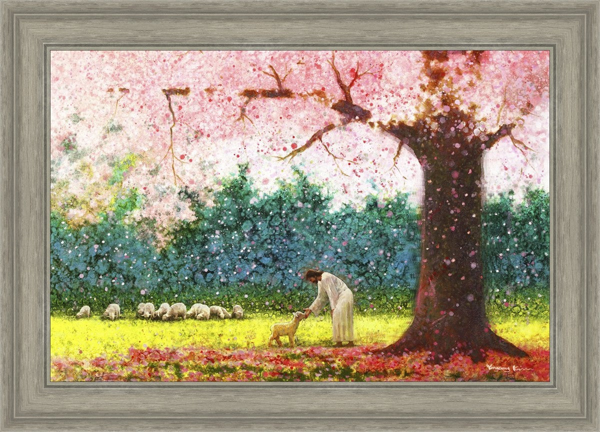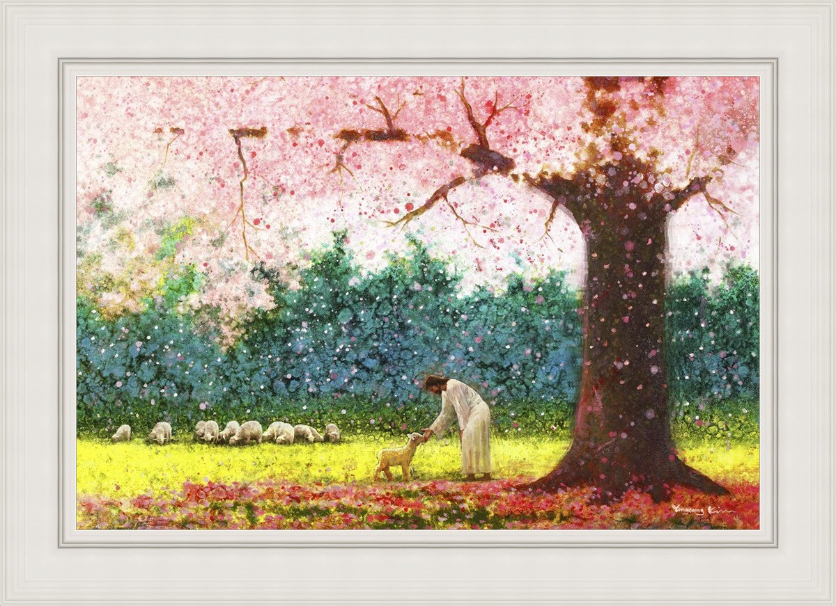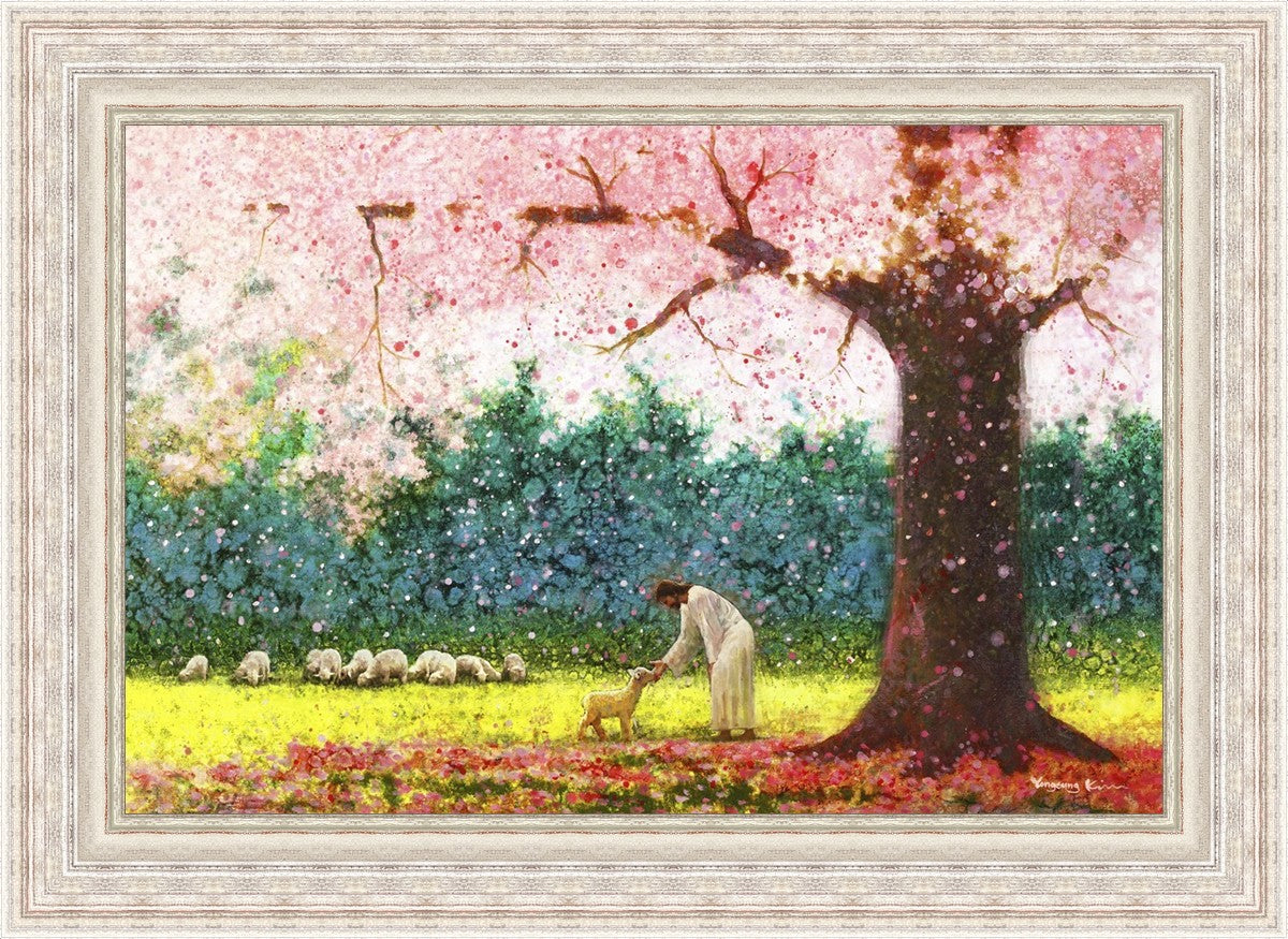In Green Pastures by Yongsung Kim portrays Jesus Christ tenderly caring for a lamb under a picturesque pink tree, in a green pasture. This artwork from Yongsung Kim resonates with viewers seeking a deeper connection to their faith journey.