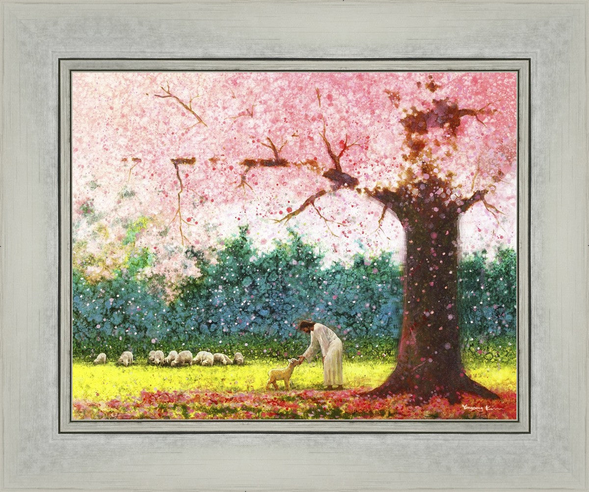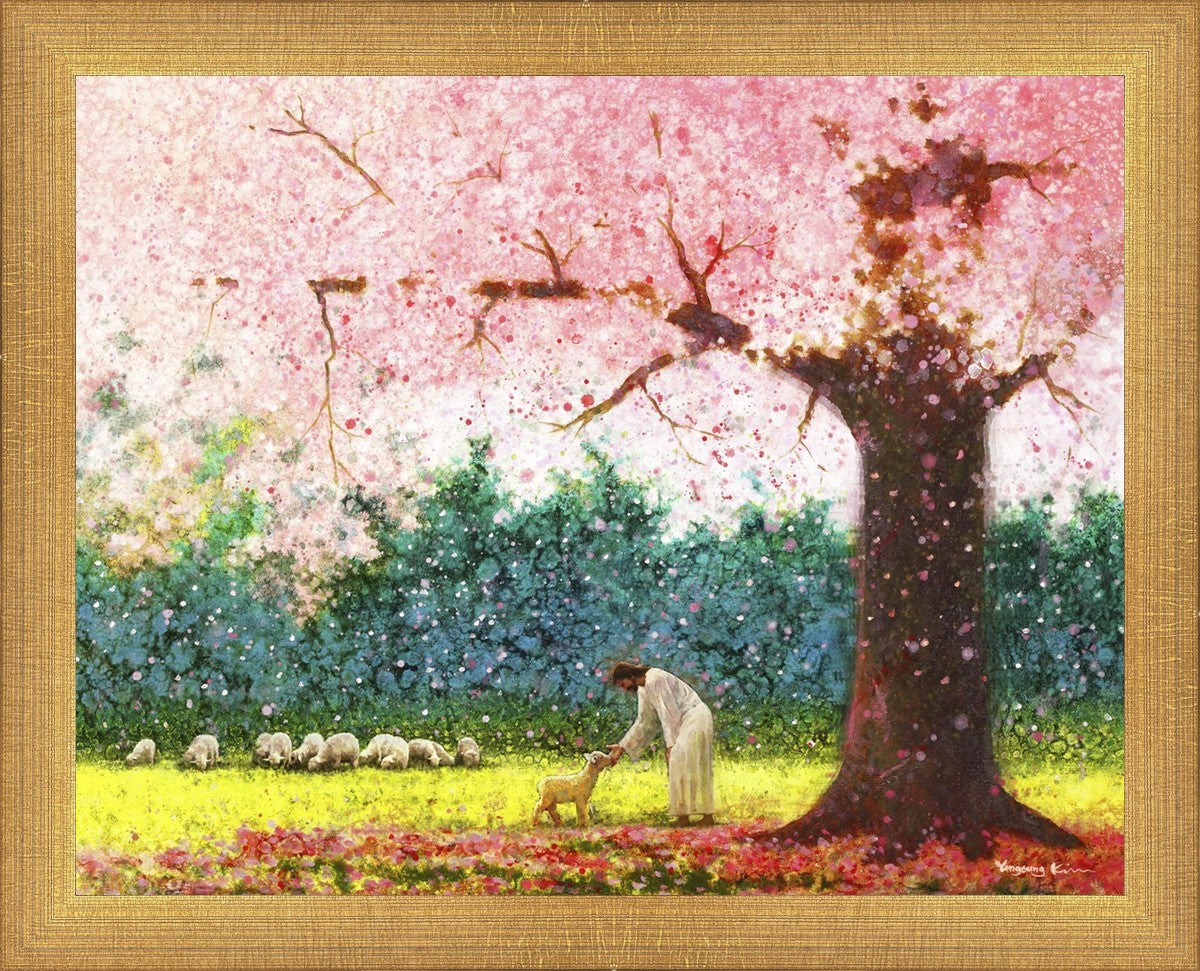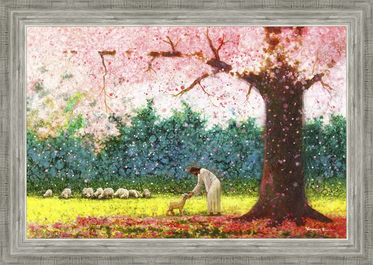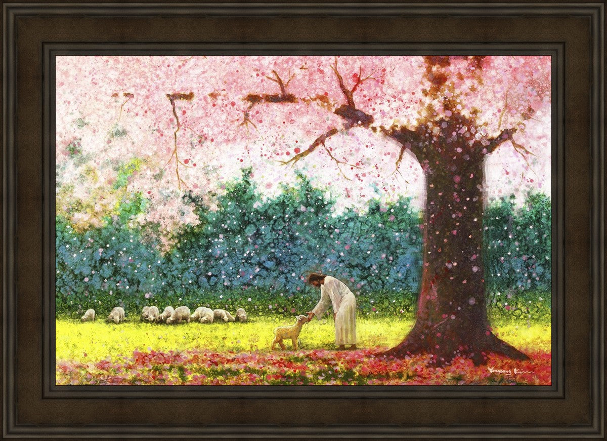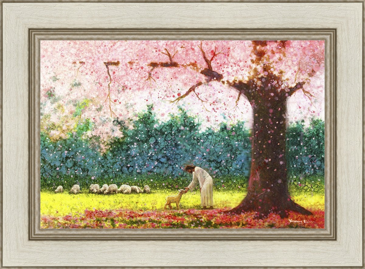 In Green Pastures by Yongsung Kim portrays Jesus Christ tenderly caring for a lamb under a picturesque pink tree, in a green pasture. This artwork from Yongsung Kim resonates with viewers seeking a deeper connection to their faith journey.