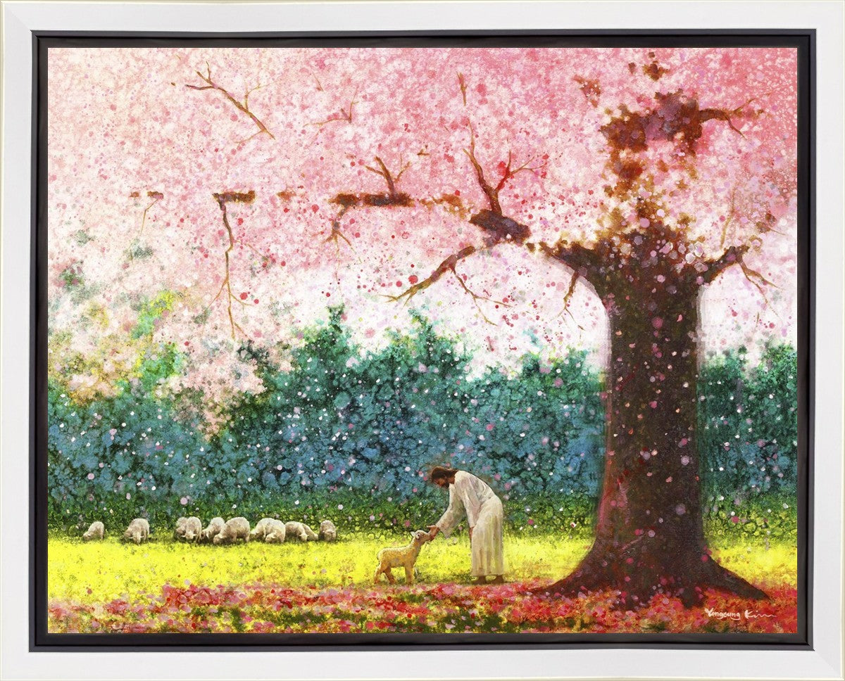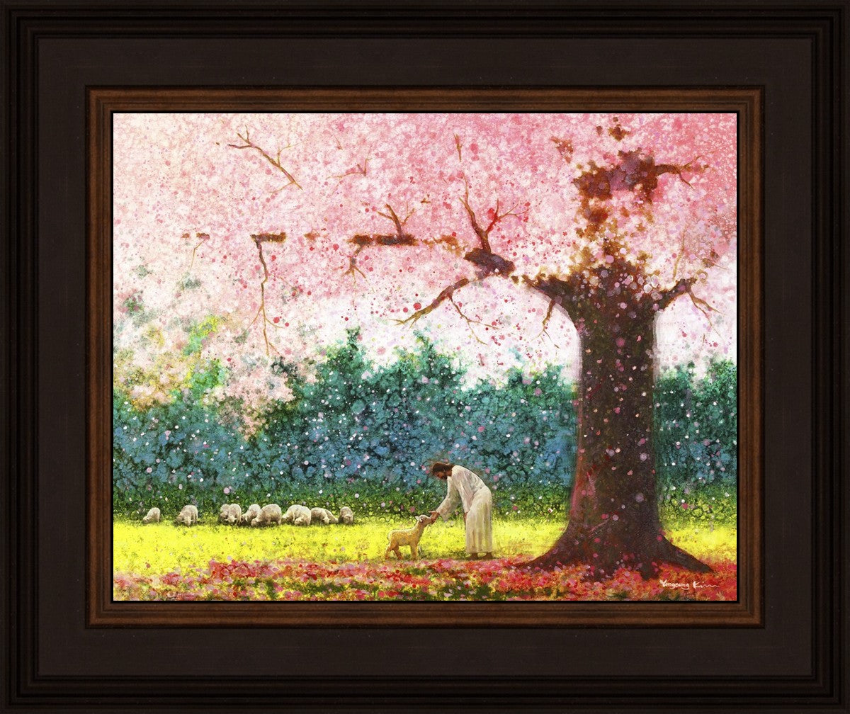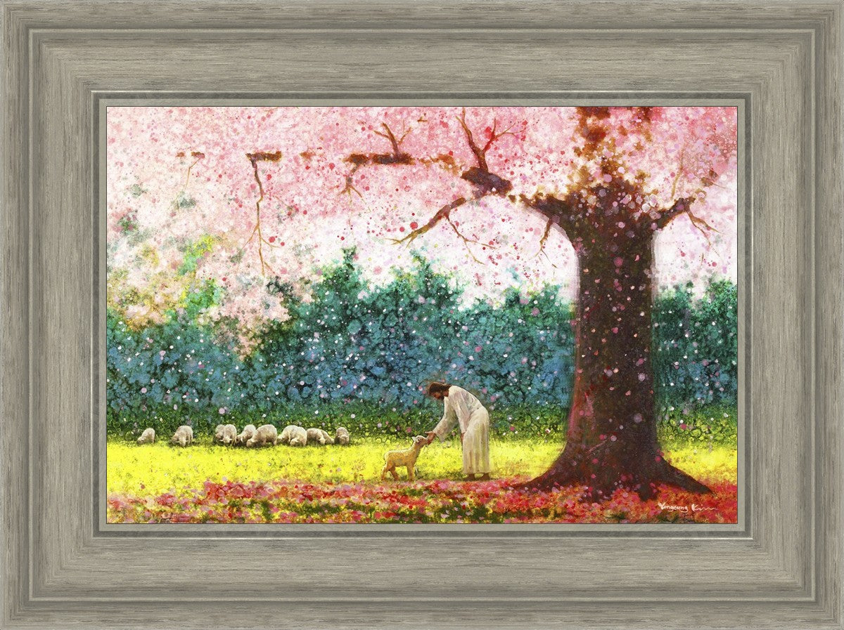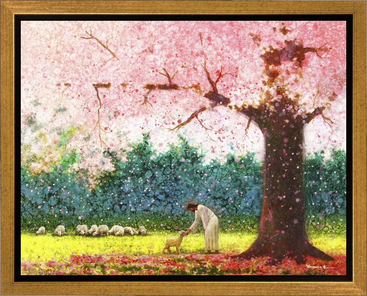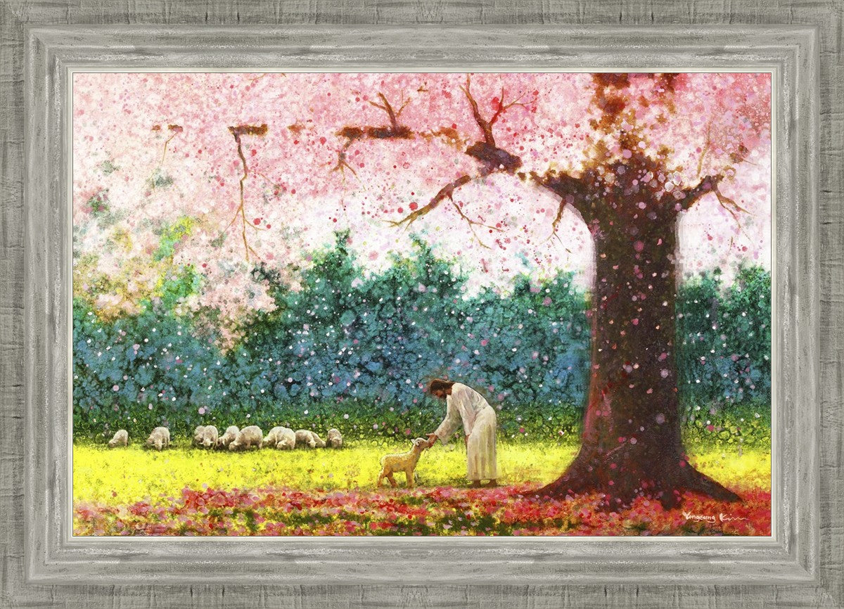 In Green Pastures by Yongsung Kim portrays Jesus Christ tenderly caring for a lamb under a picturesque pink tree, in a green pasture. This artwork from Yongsung Kim resonates with viewers seeking a deeper connection to their faith journey.