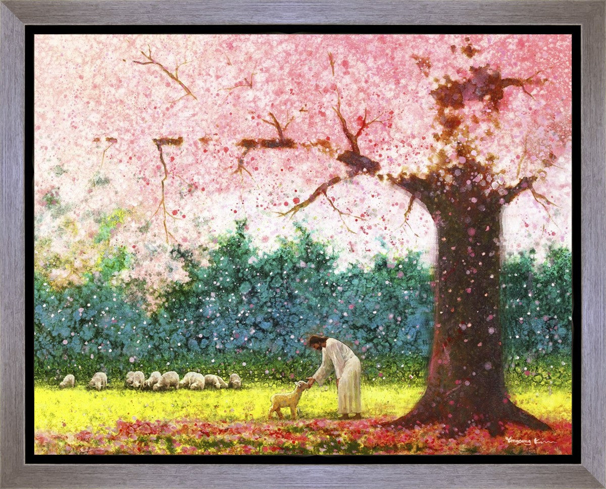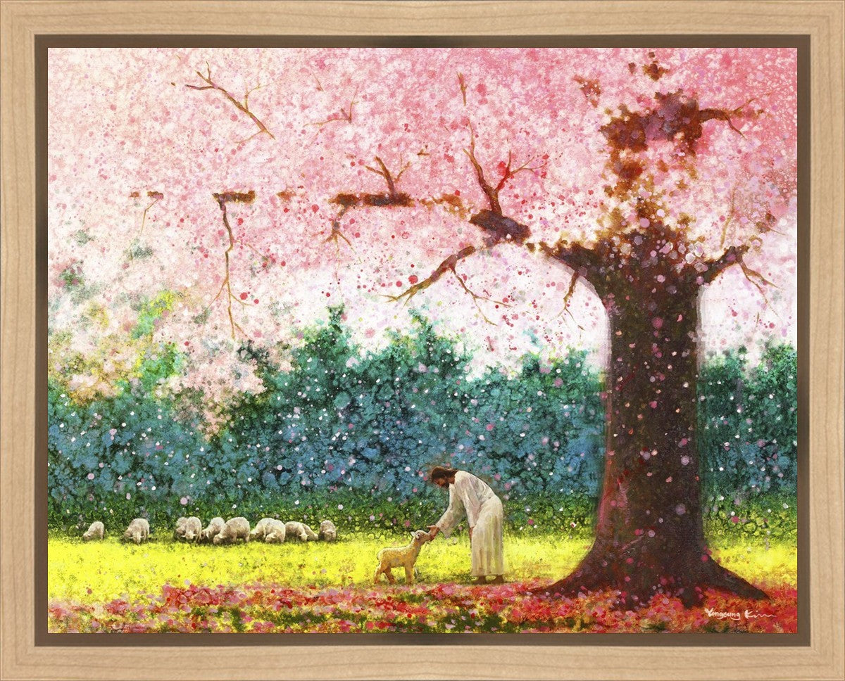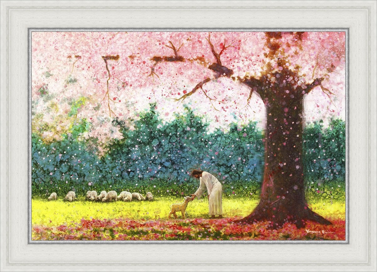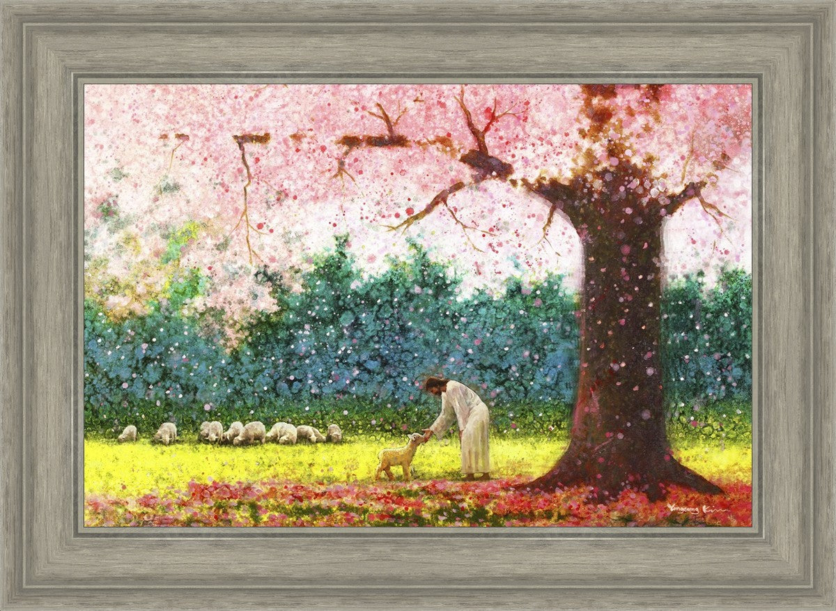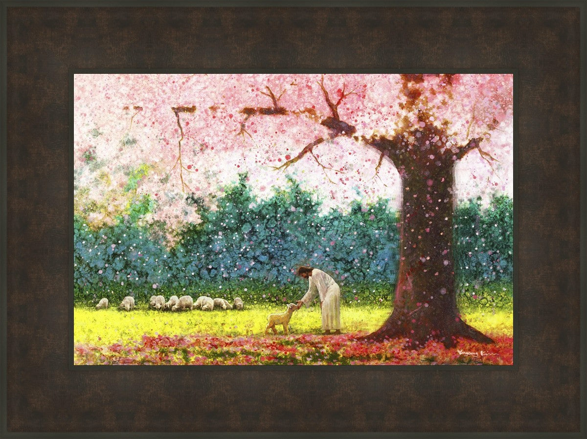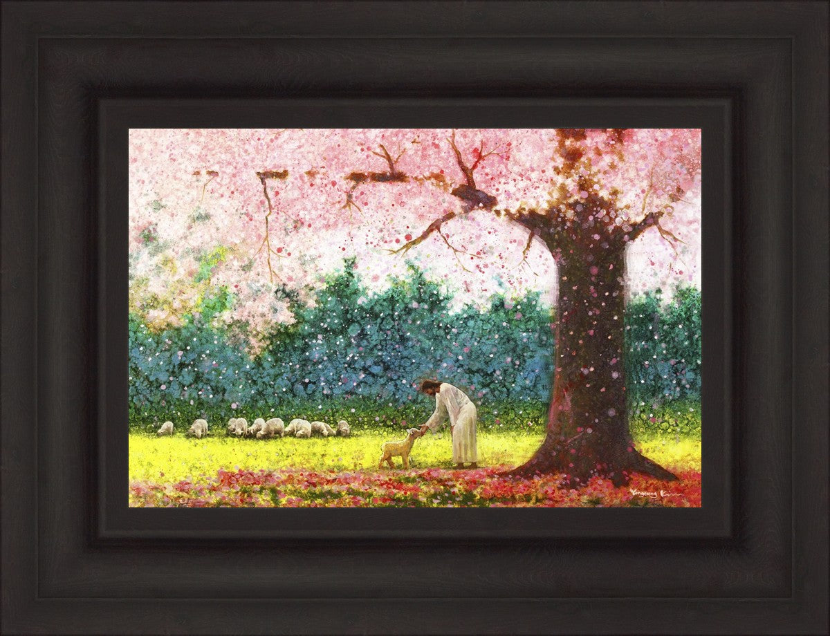 In Green Pastures by Yongsung Kim portrays Jesus Christ tenderly caring for a lamb under a picturesque pink tree, in a green pasture. This artwork from Yongsung Kim resonates with viewers seeking a deeper connection to their faith journey.