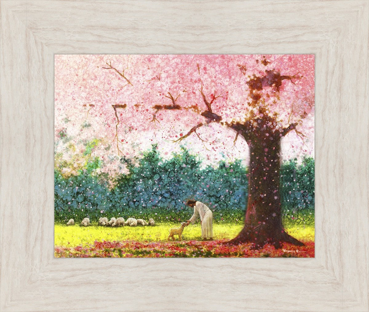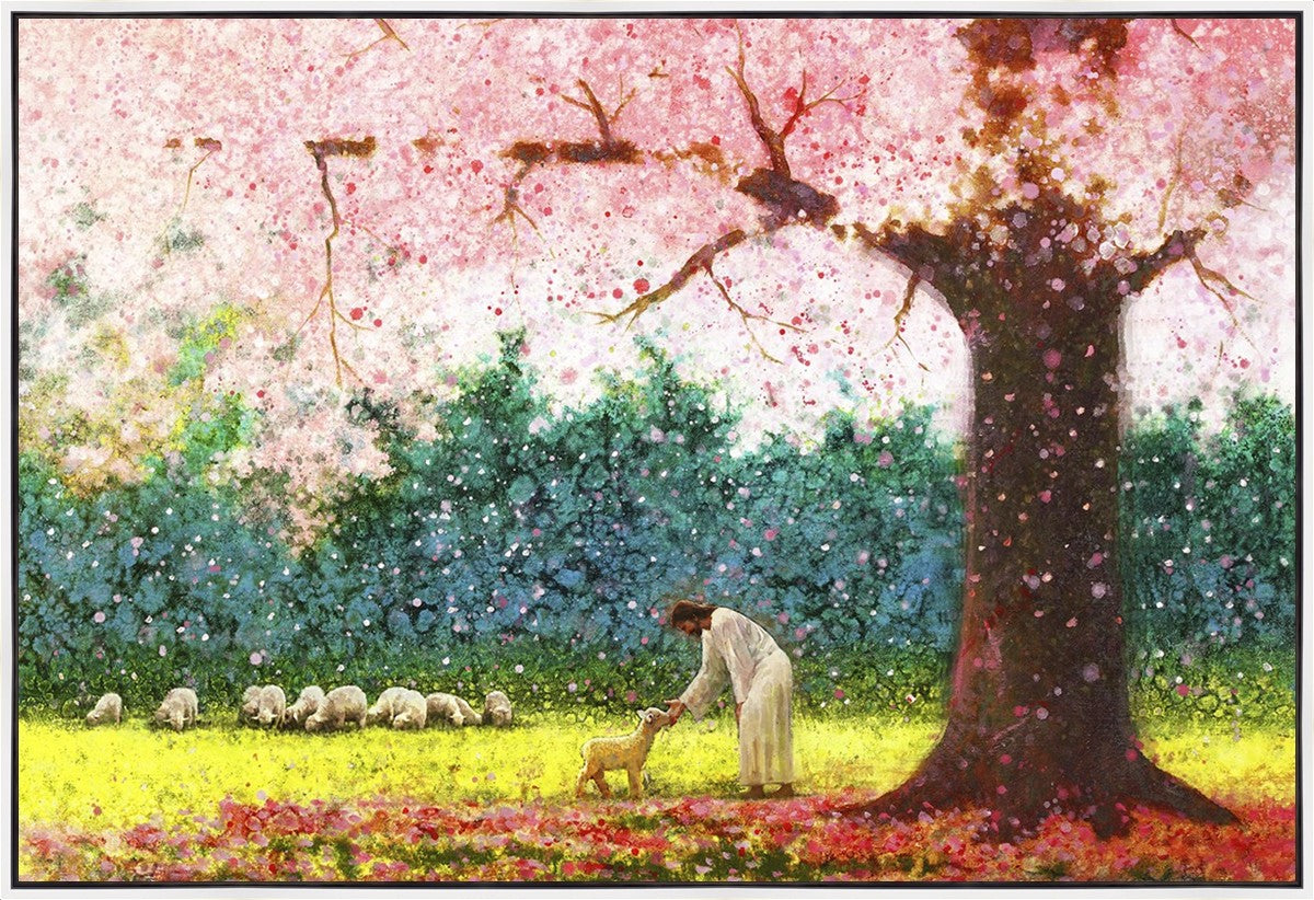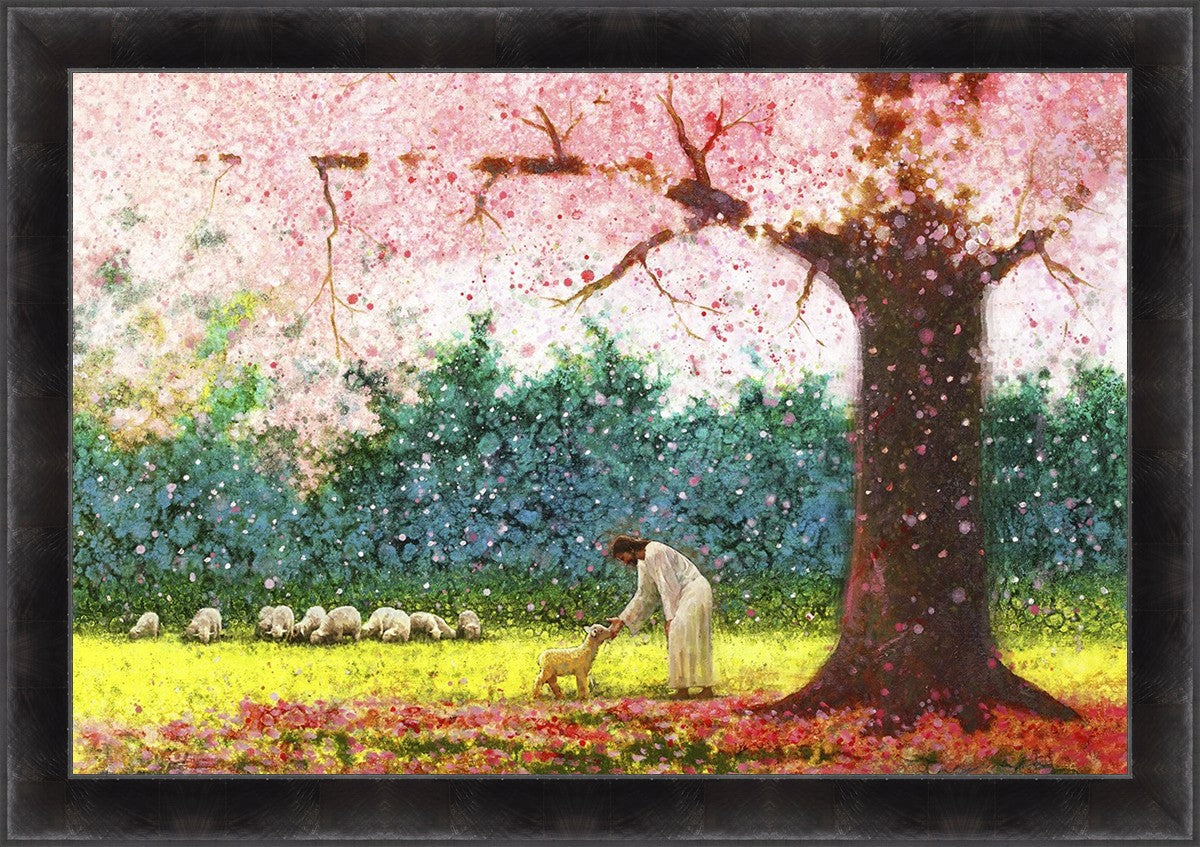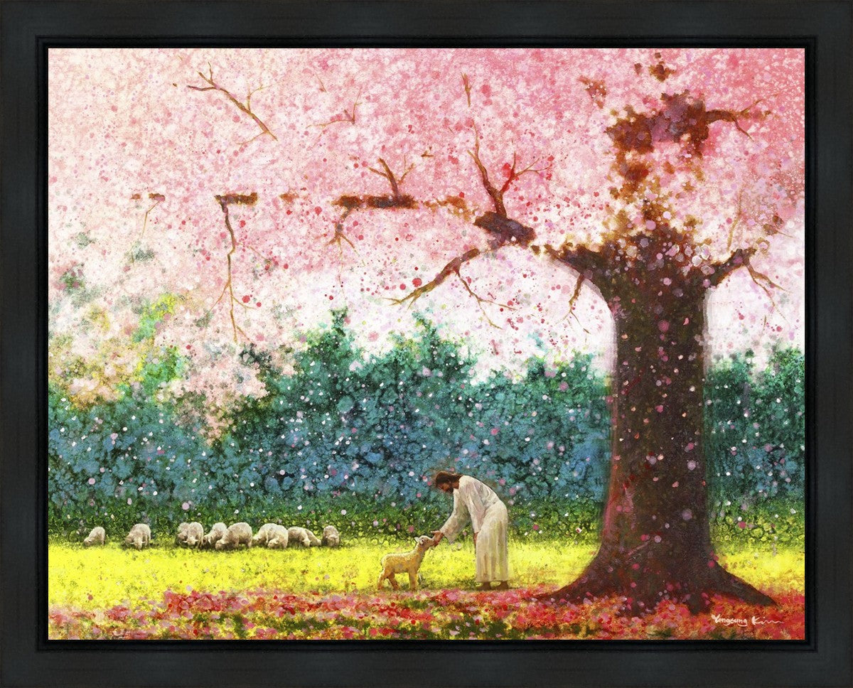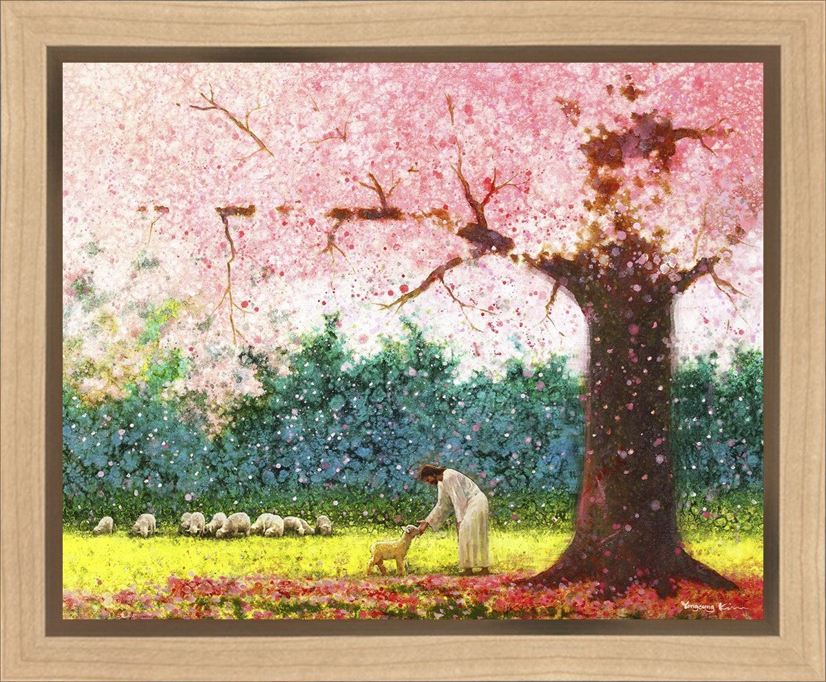 In Green Pastures by Yongsung Kim portrays Jesus Christ tenderly caring for a lamb under a picturesque pink tree, in a green pasture. This artwork from Yongsung Kim resonates with viewers seeking a deeper connection to their faith journey.