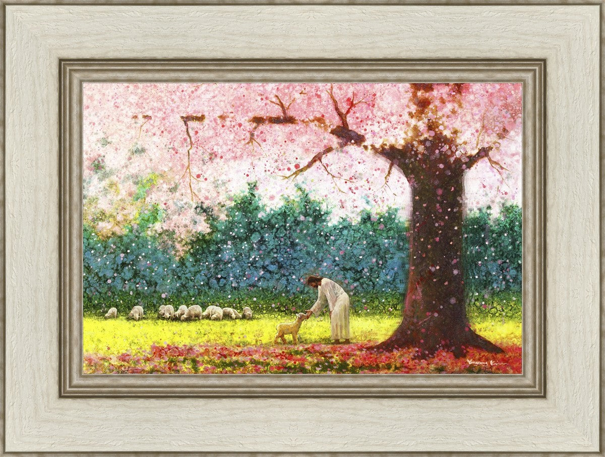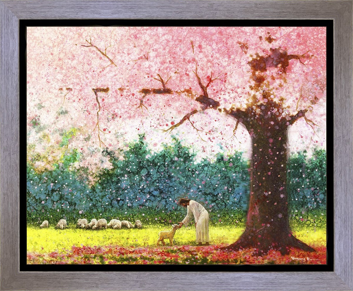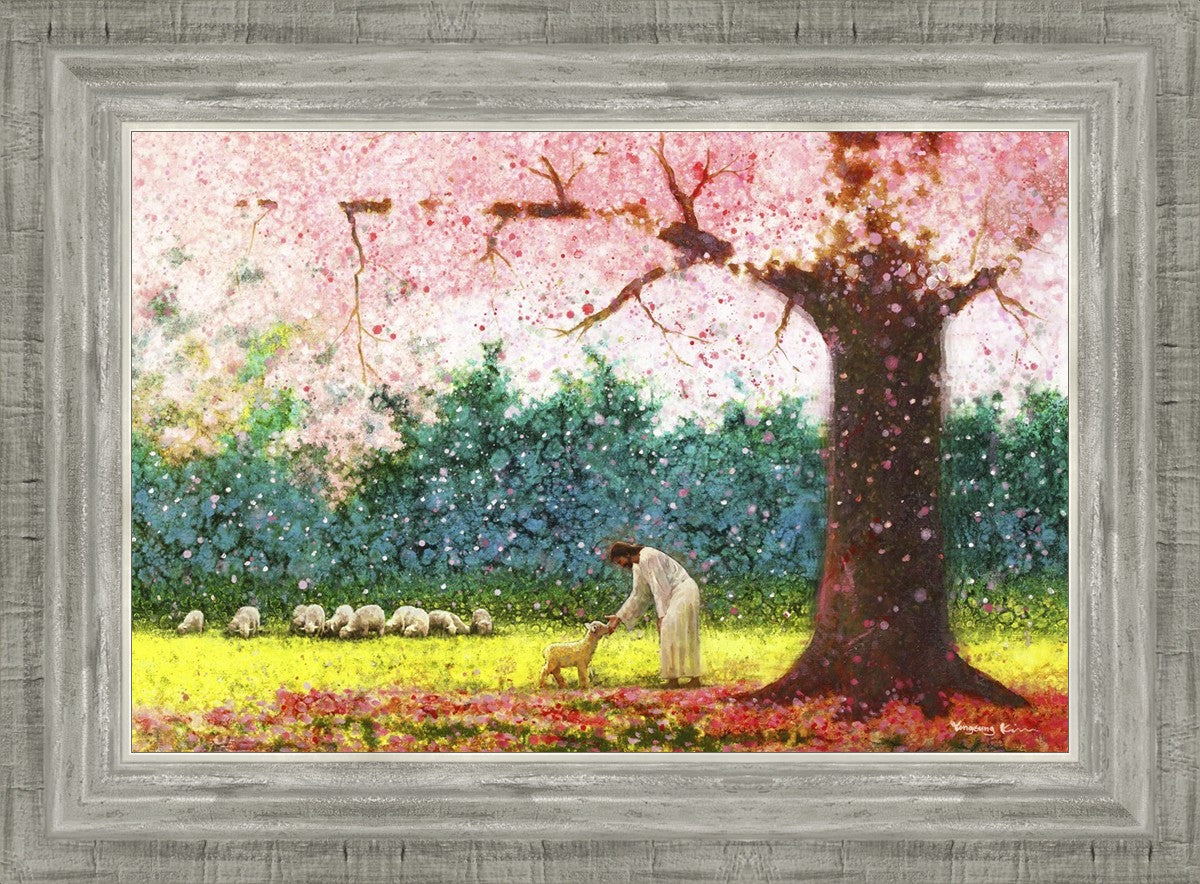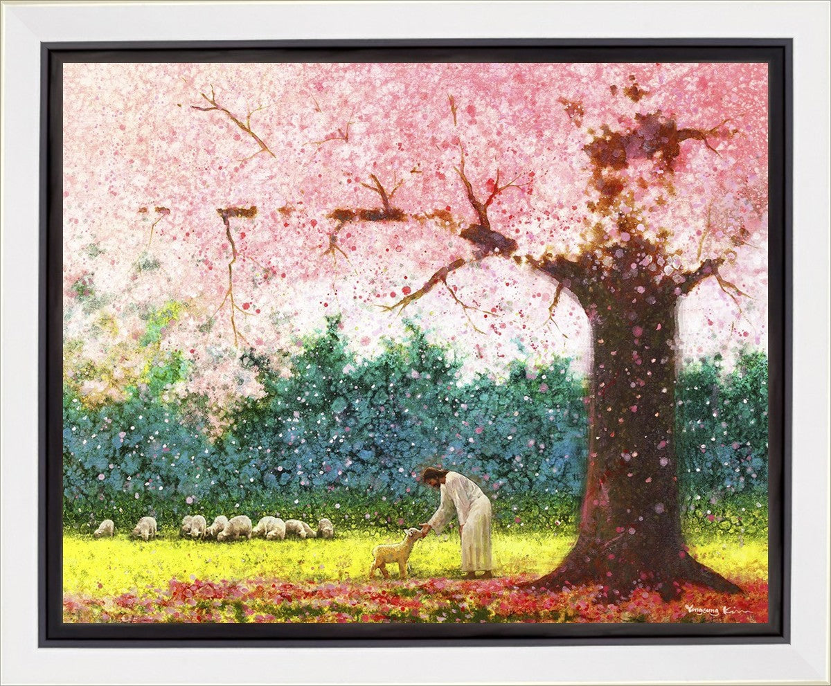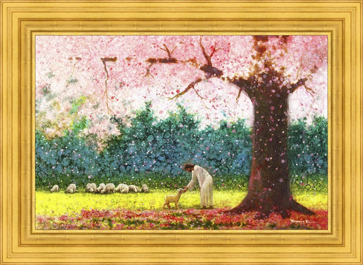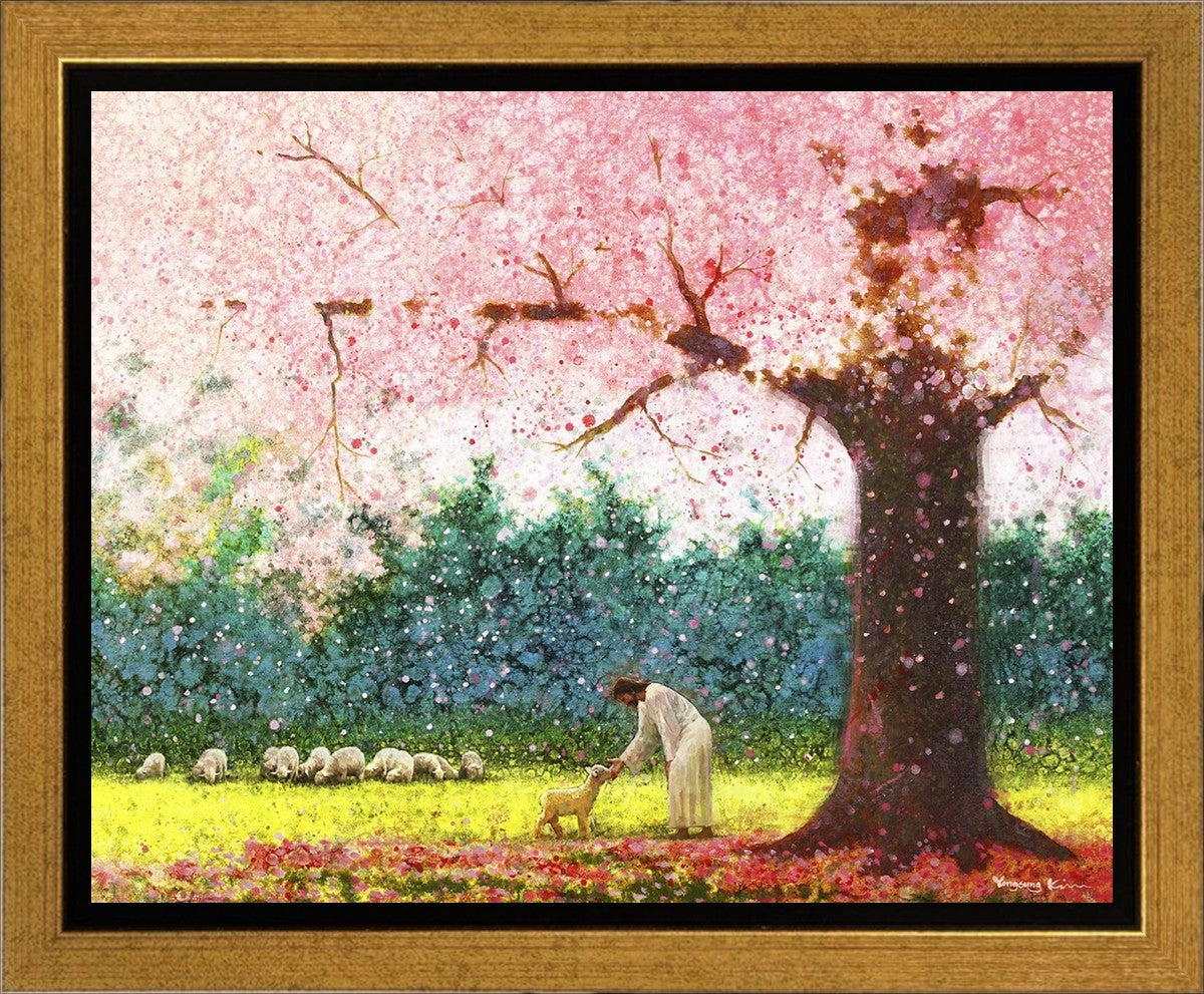 In Green Pastures by Yongsung Kim portrays Jesus Christ tenderly caring for a lamb under a picturesque pink tree, in a green pasture. This artwork from Yongsung Kim resonates with viewers seeking a deeper connection to their faith journey.