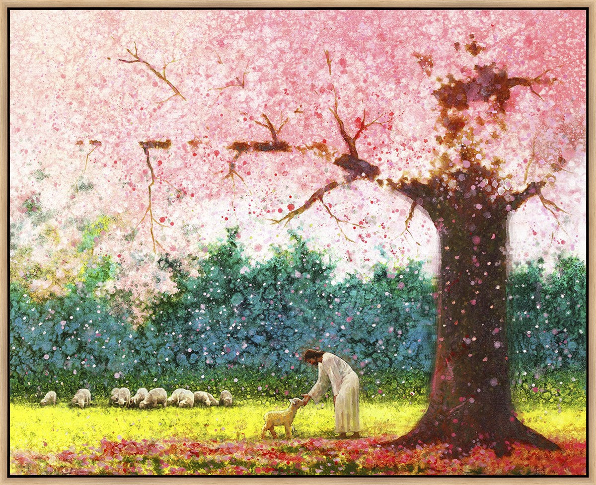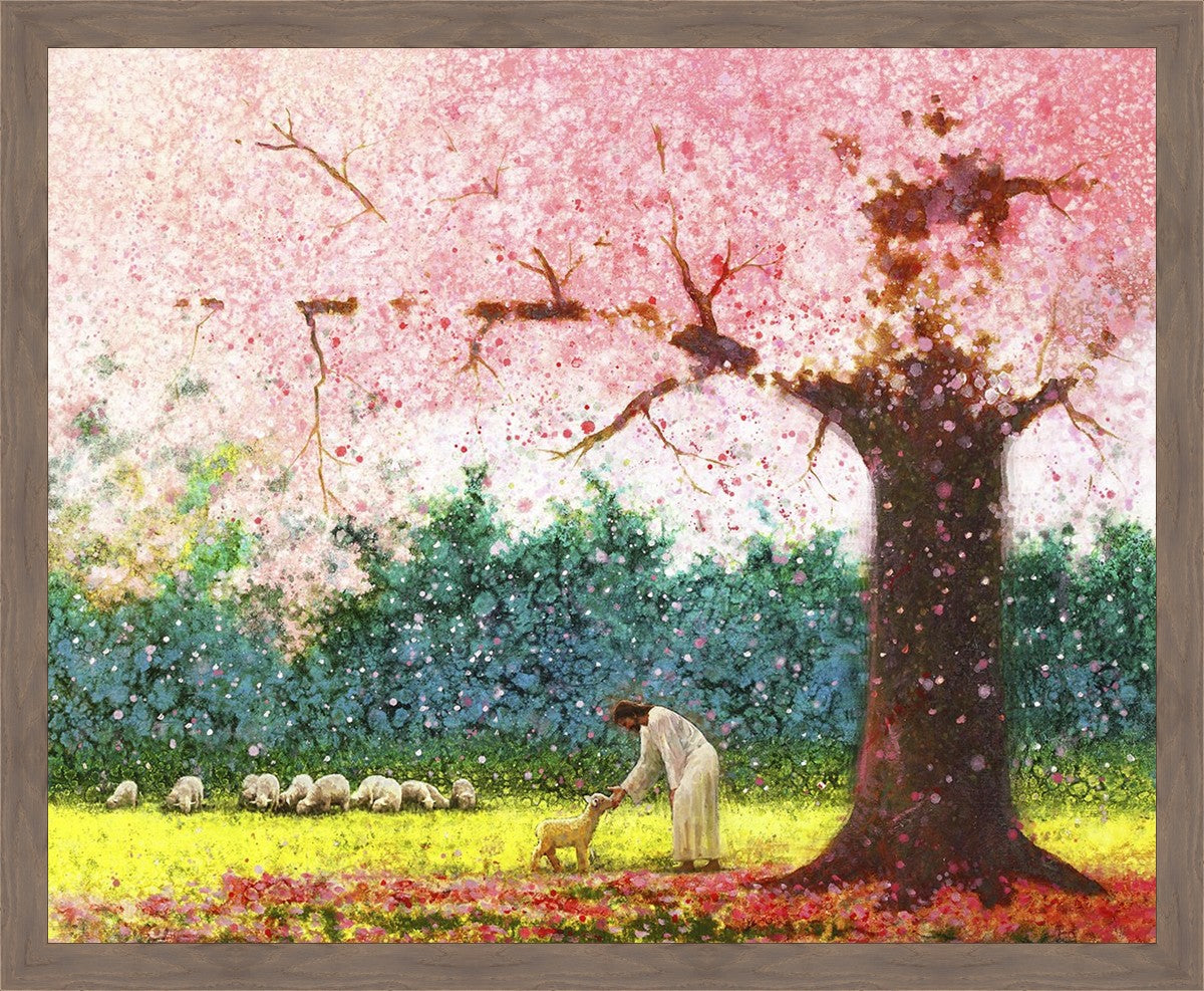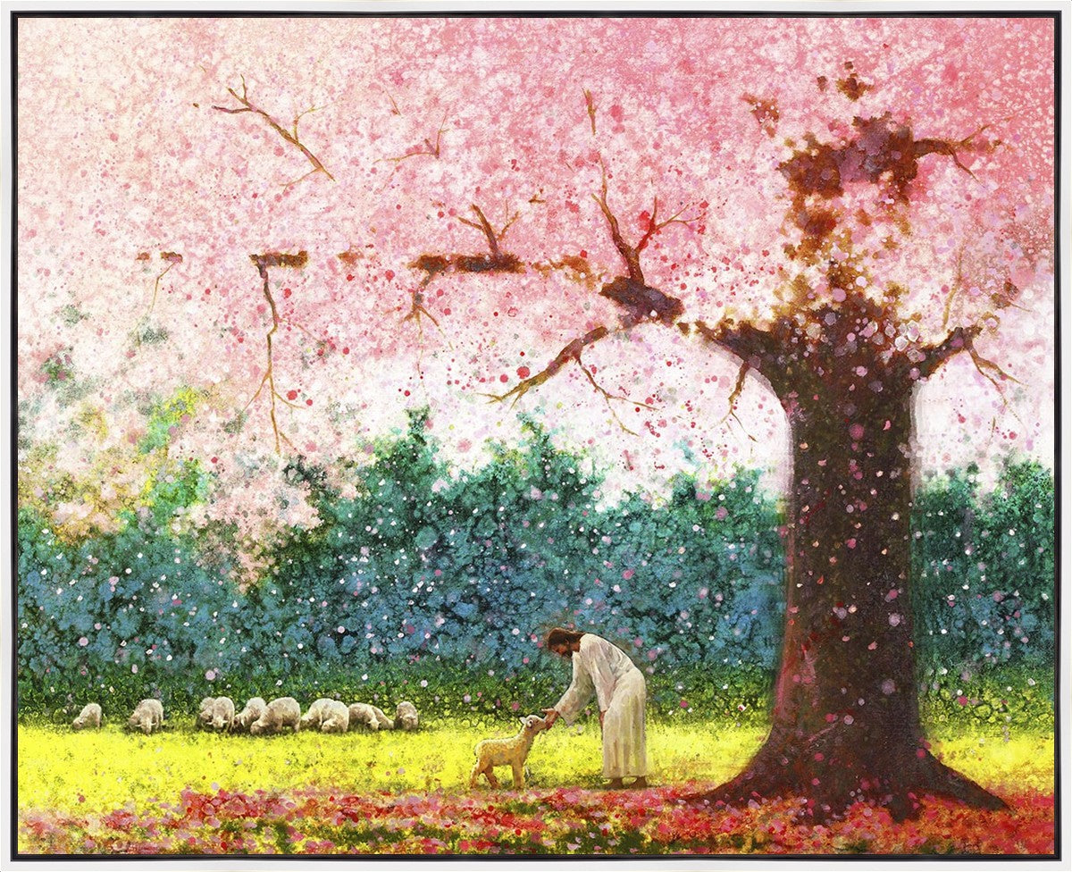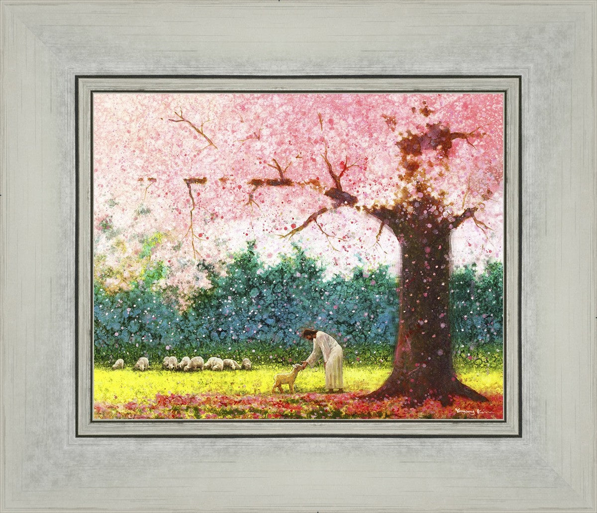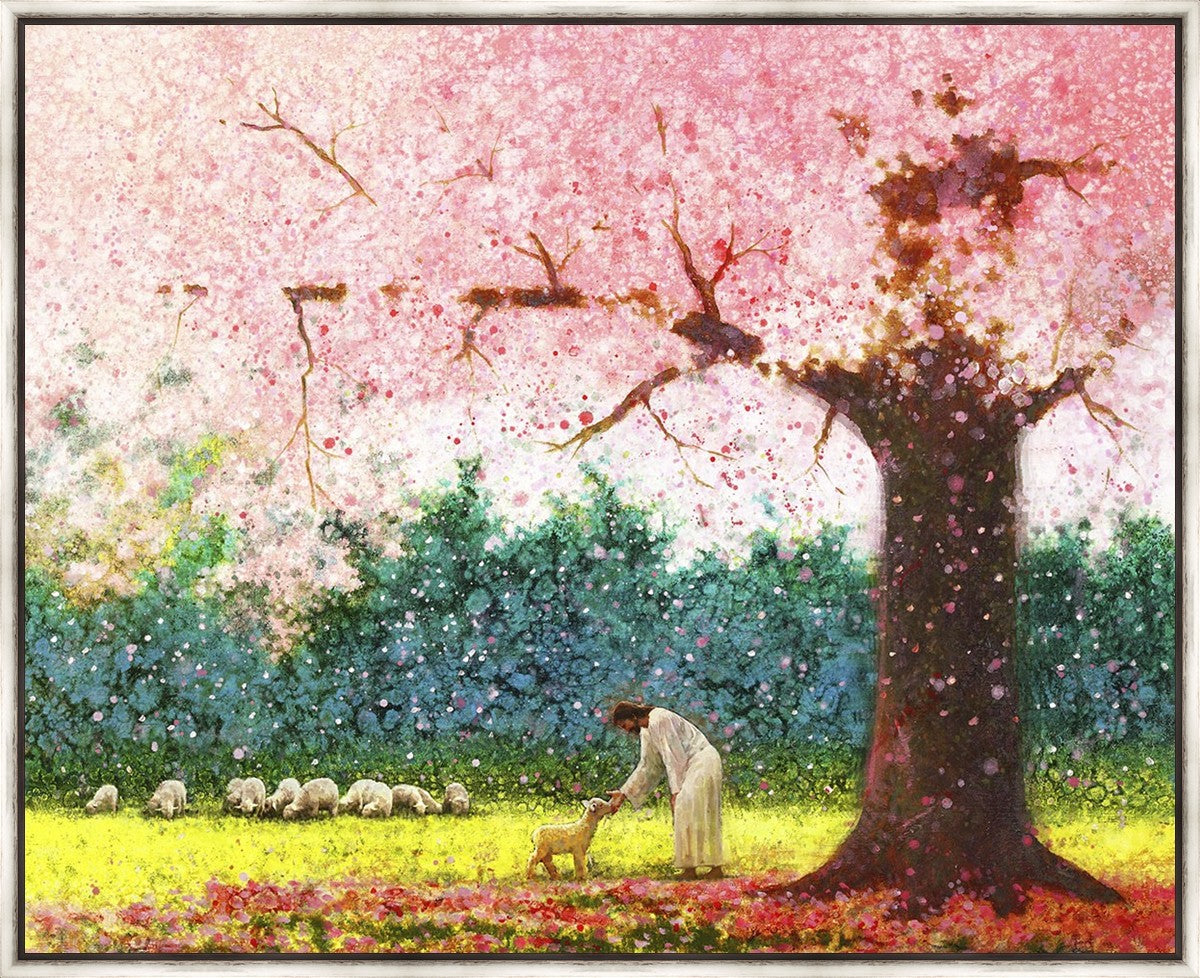 In Green Pastures by Yongsung Kim portrays Jesus Christ tenderly caring for a lamb under a picturesque pink tree, in a green pasture. This artwork from Yongsung Kim resonates with viewers seeking a deeper connection to their faith journey.