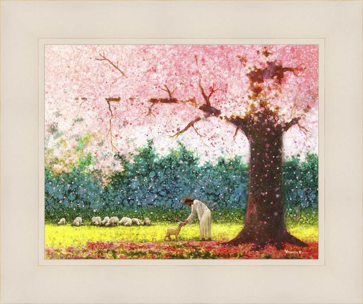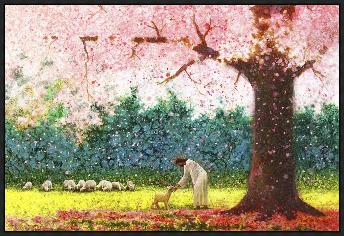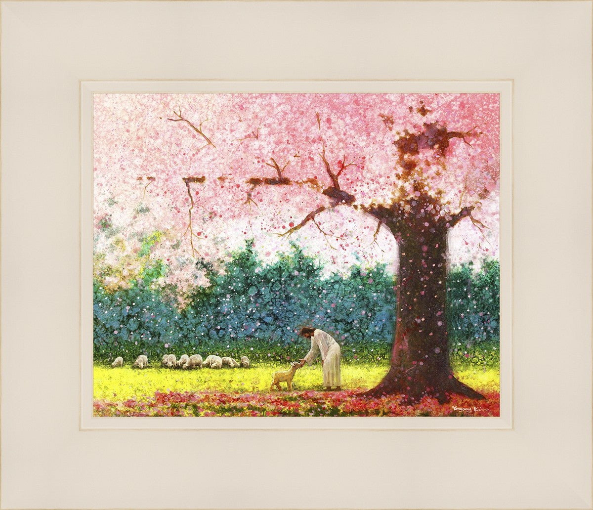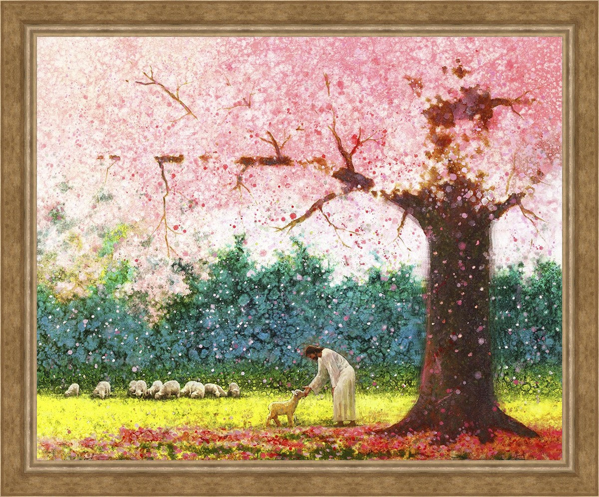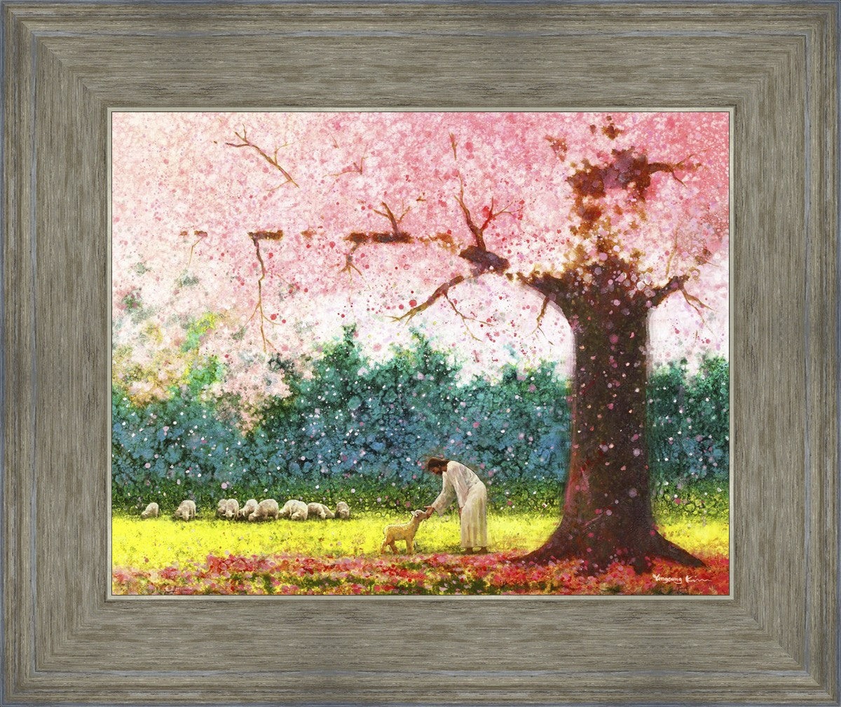 In Green Pastures by Yongsung Kim portrays Jesus Christ tenderly caring for a lamb under a picturesque pink tree, in a green pasture. This artwork from Yongsung Kim resonates with viewers seeking a deeper connection to their faith journey.