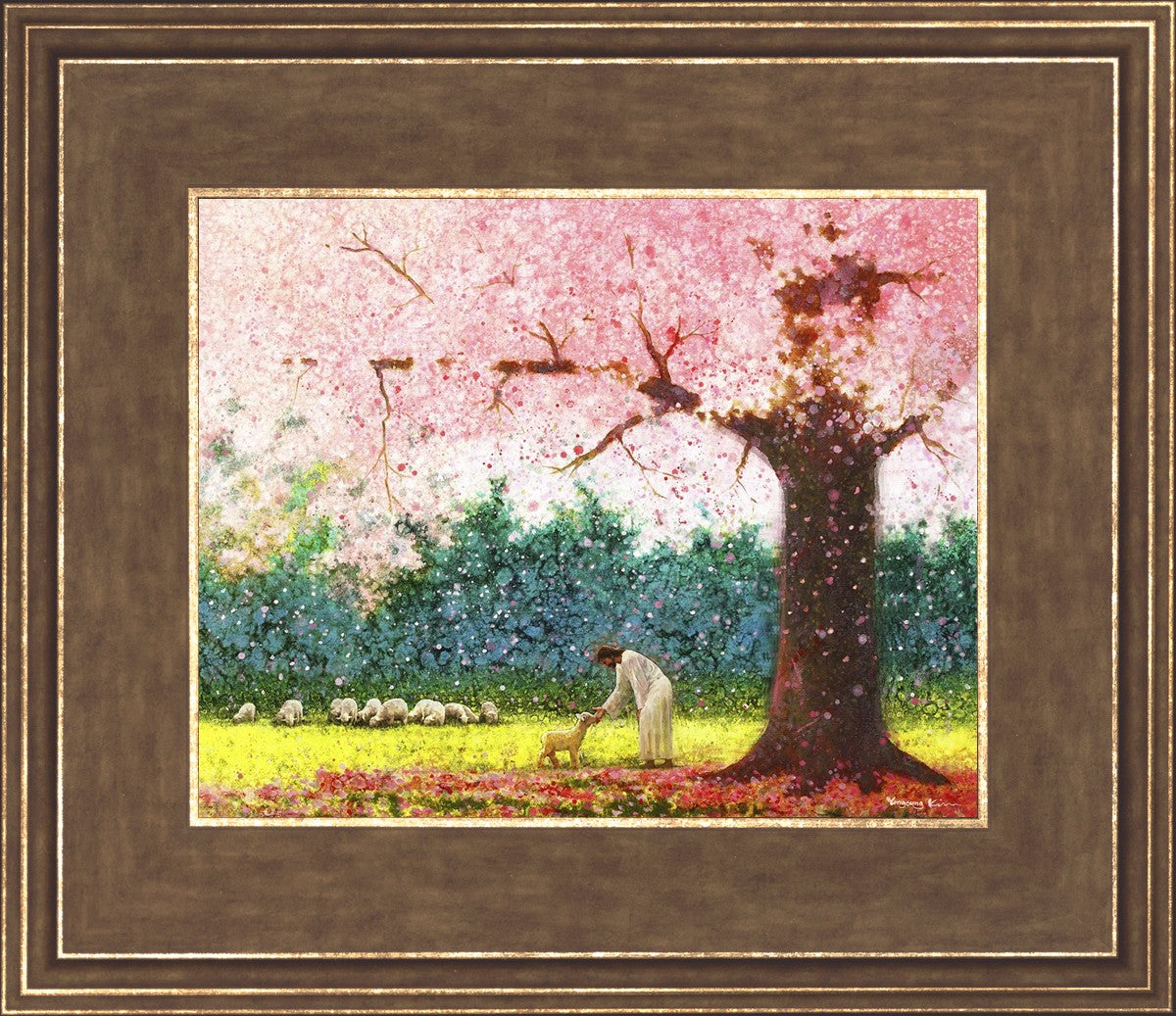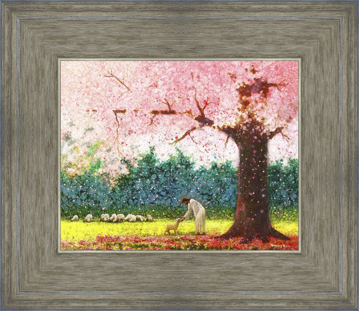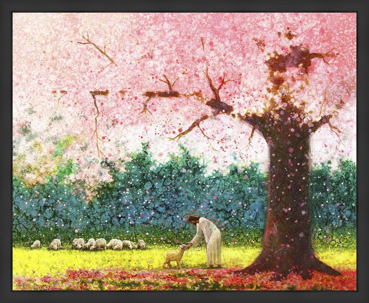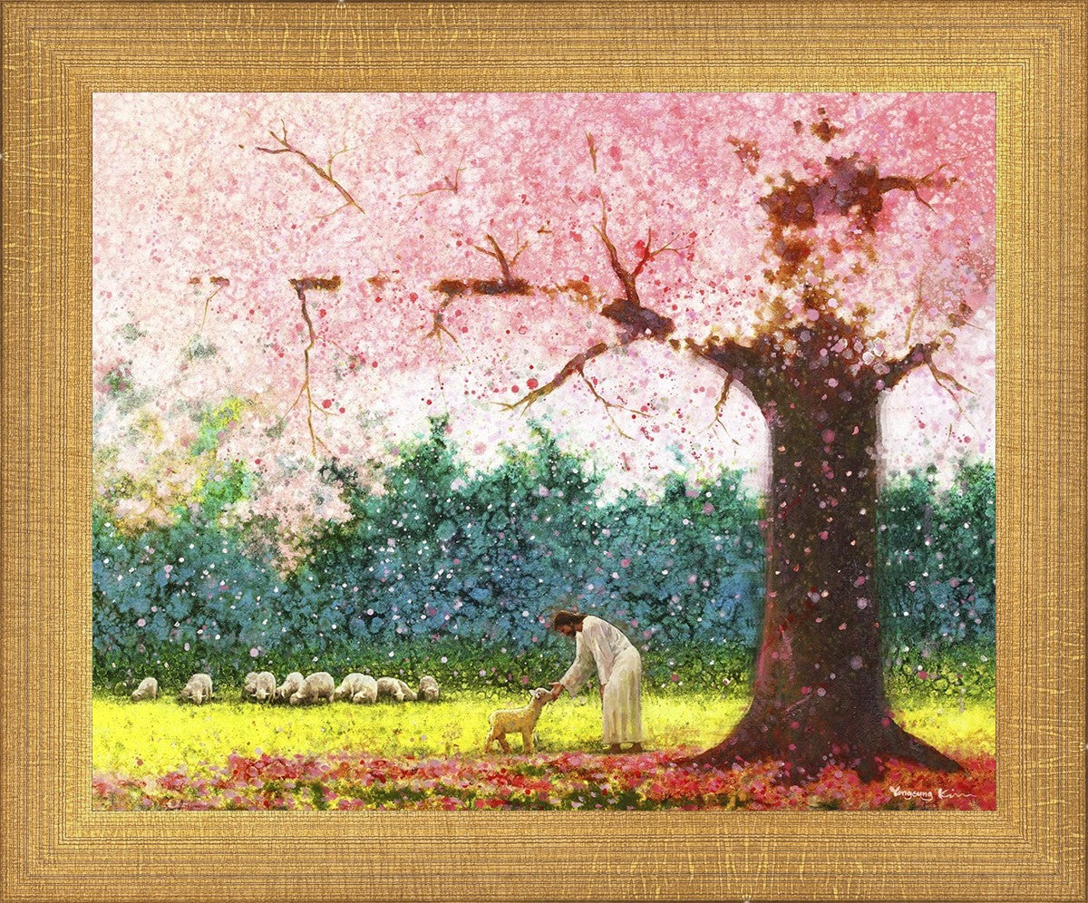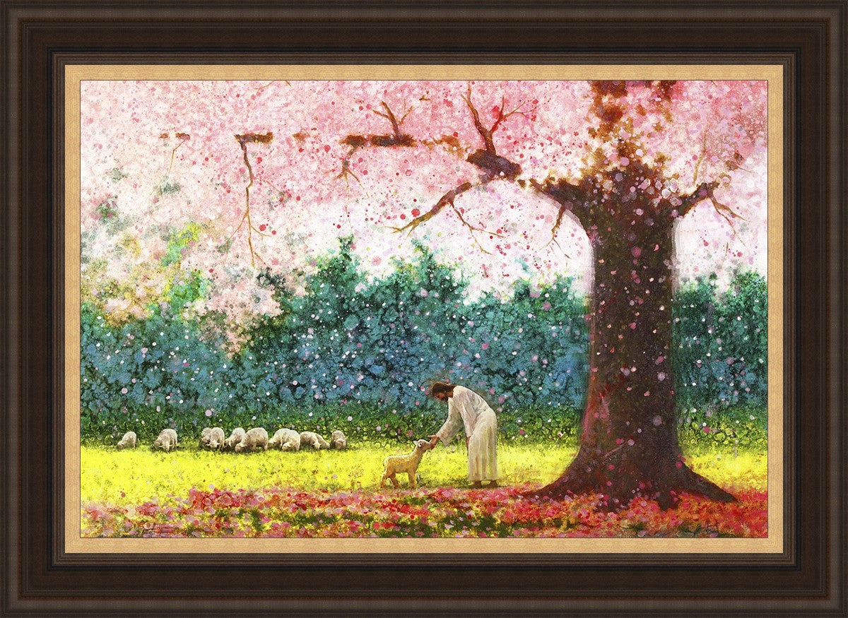 In Green Pastures by Yongsung Kim portrays Jesus Christ tenderly caring for a lamb under a picturesque pink tree, in a green pasture. This artwork from Yongsung Kim resonates with viewers seeking a deeper connection to their faith journey.