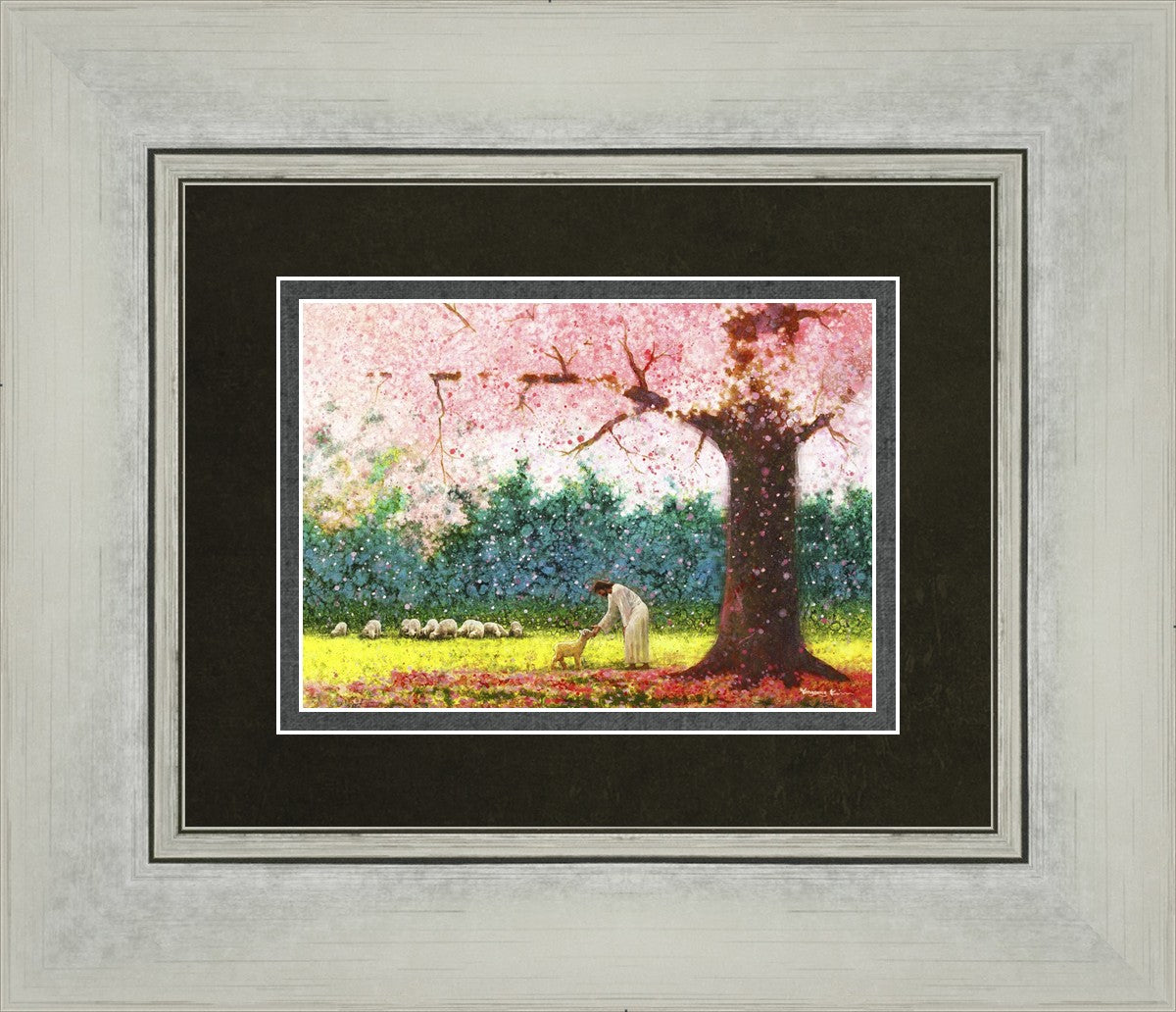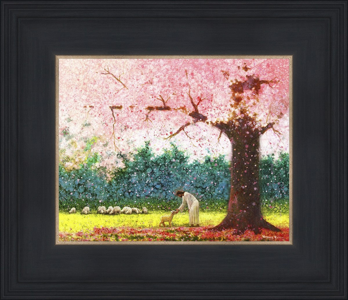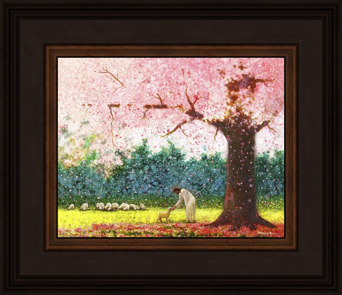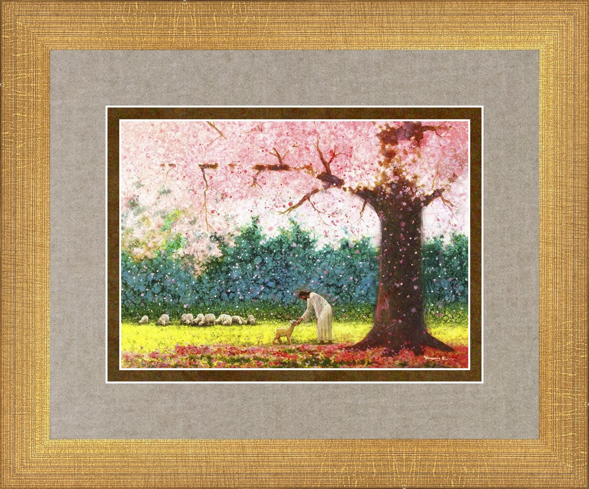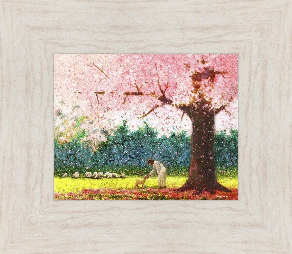 In Green Pastures by Yongsung Kim portrays Jesus Christ tenderly caring for a lamb under a picturesque pink tree, in a green pasture. This artwork from Yongsung Kim resonates with viewers seeking a deeper connection to their faith journey.