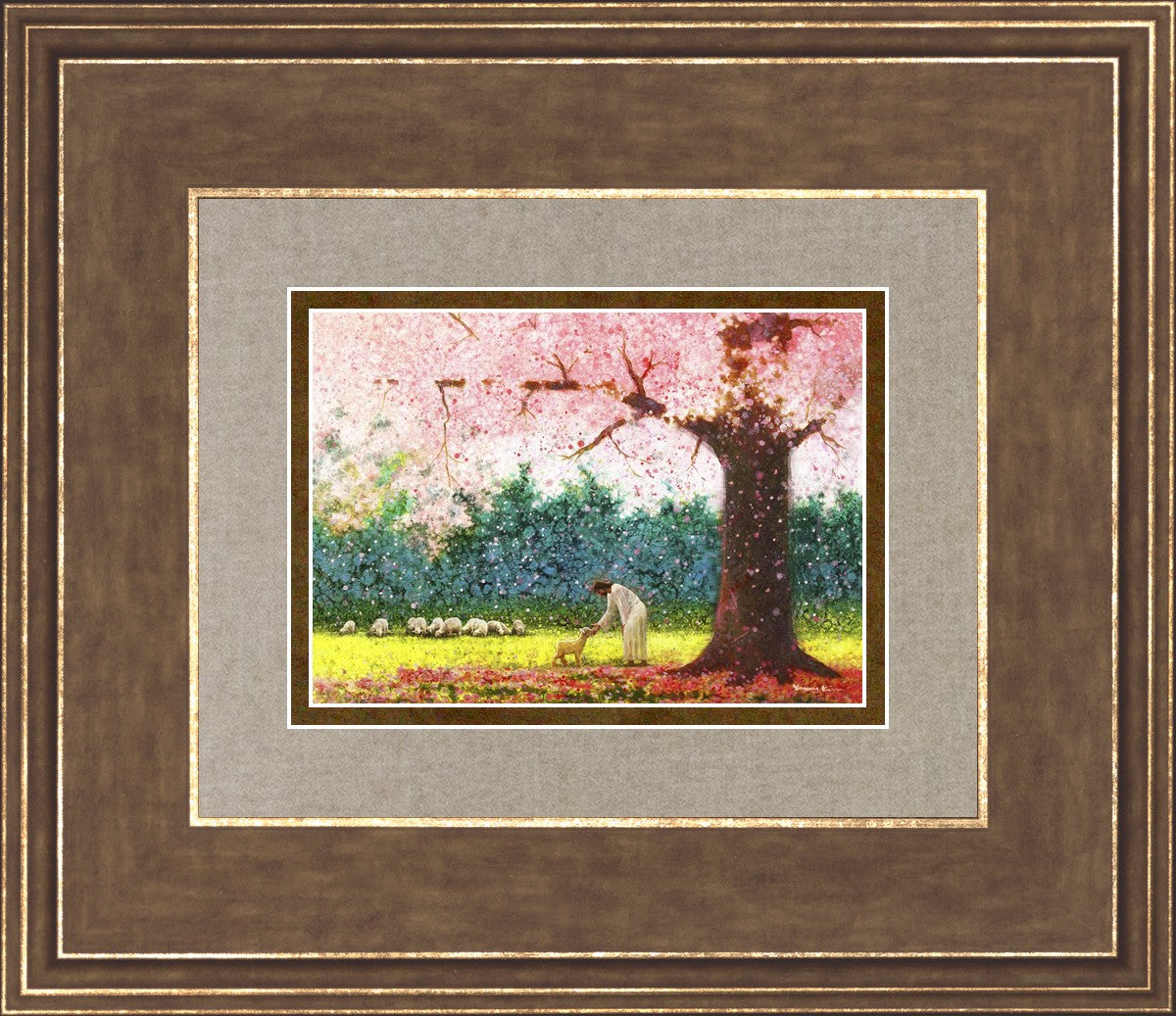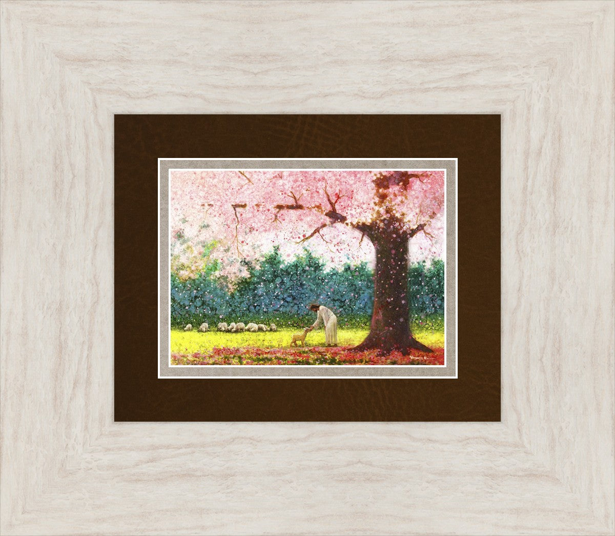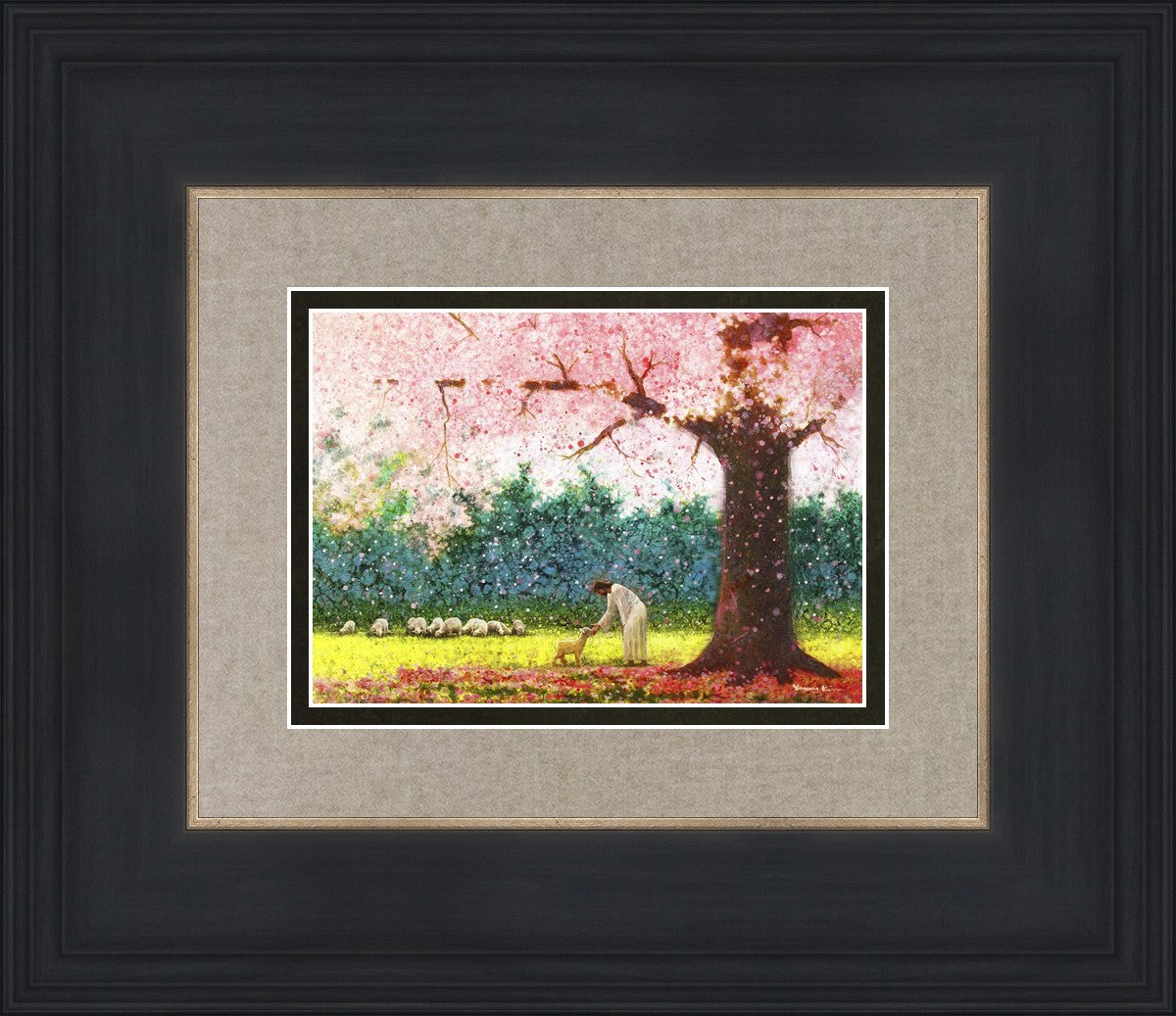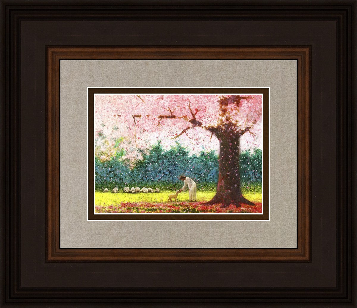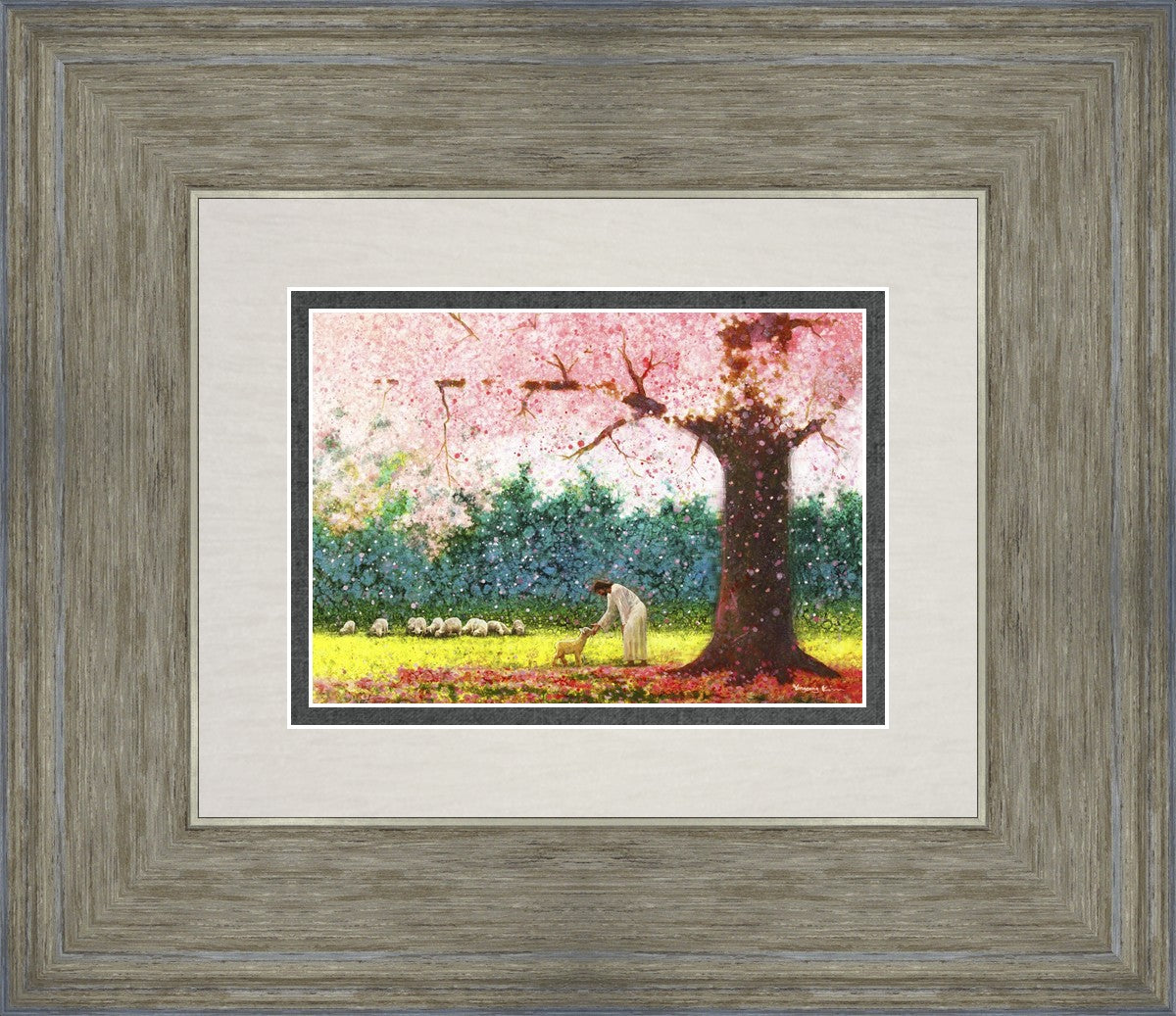 In Green Pastures by Yongsung Kim portrays Jesus Christ tenderly caring for a lamb under a picturesque pink tree, in a green pasture. This artwork from Yongsung Kim resonates with viewers seeking a deeper connection to their faith journey.