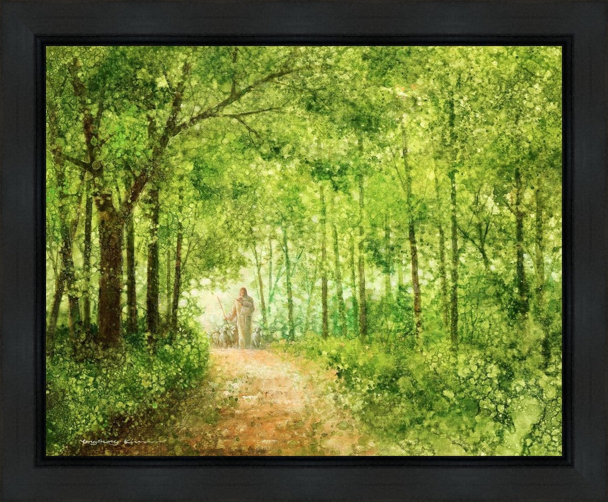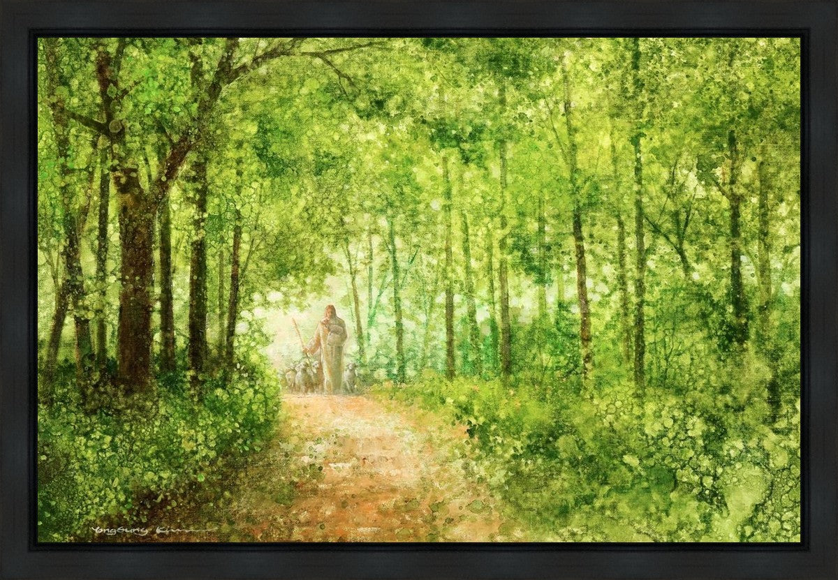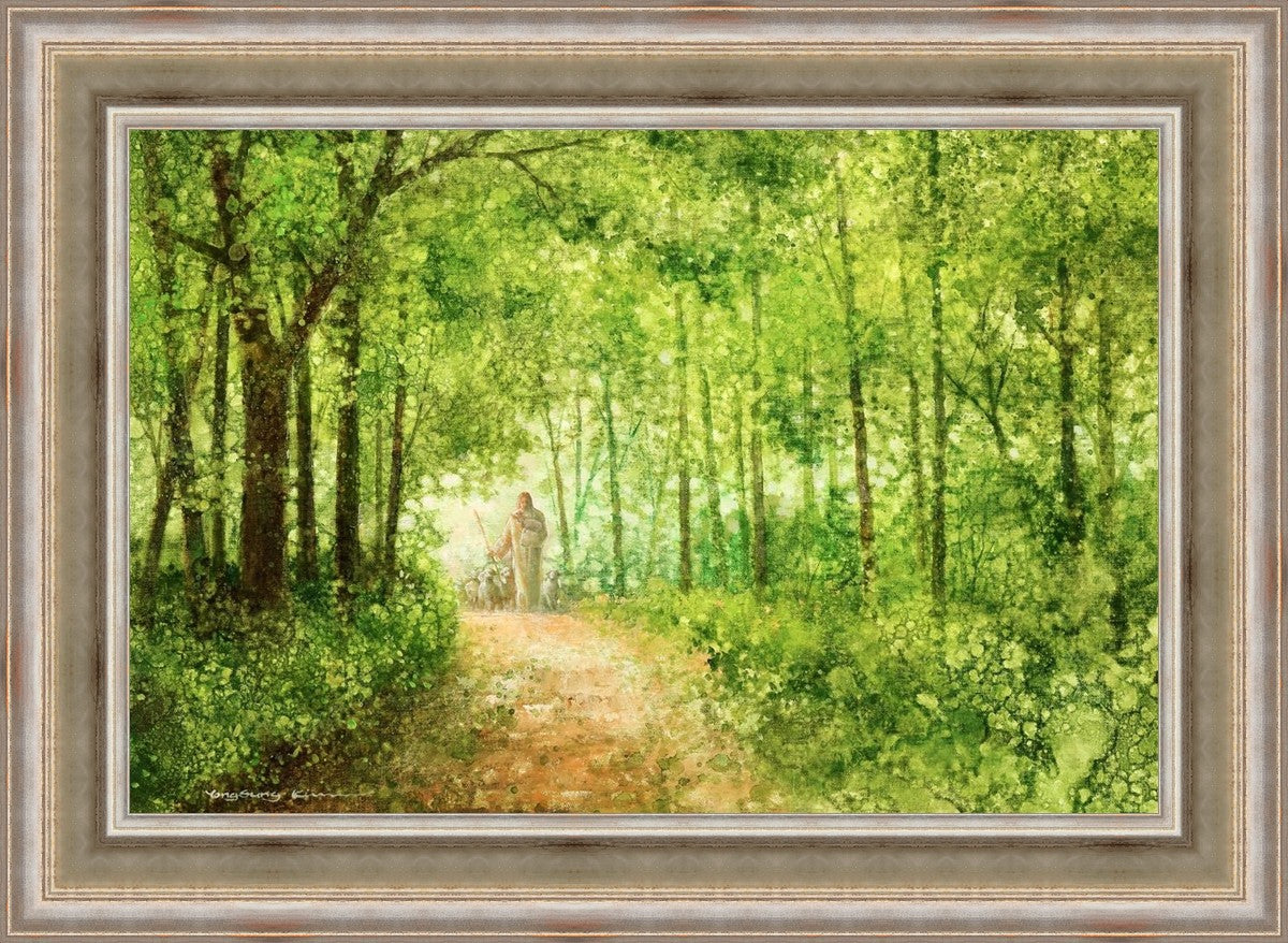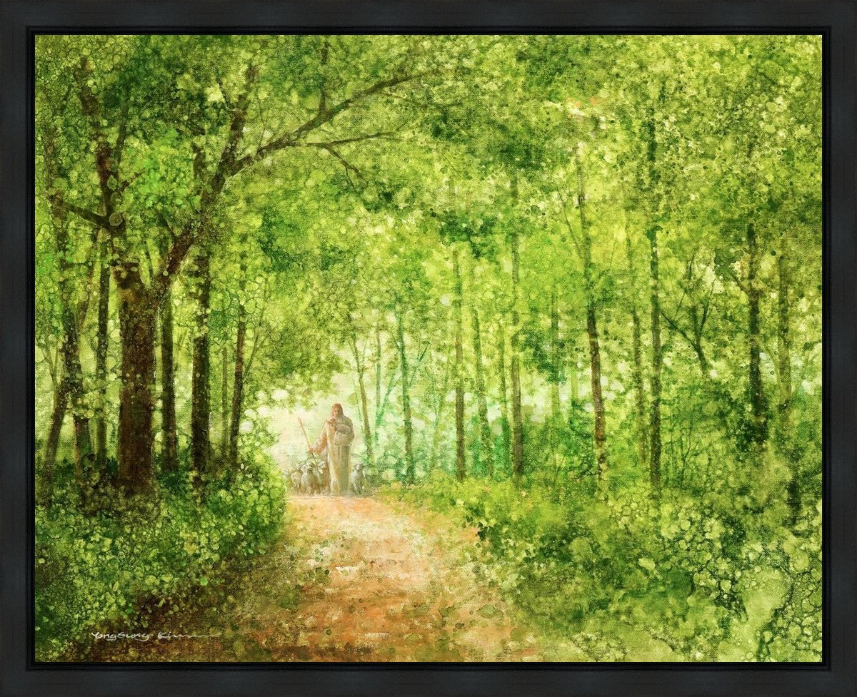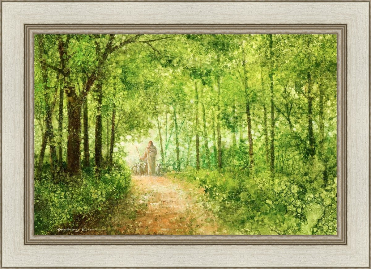 "Lead Thou Me On" by Yongsung Kim depicts Jesus Christ tenderly holding a lamb, leading a flock of sheep along a tree-lined path.