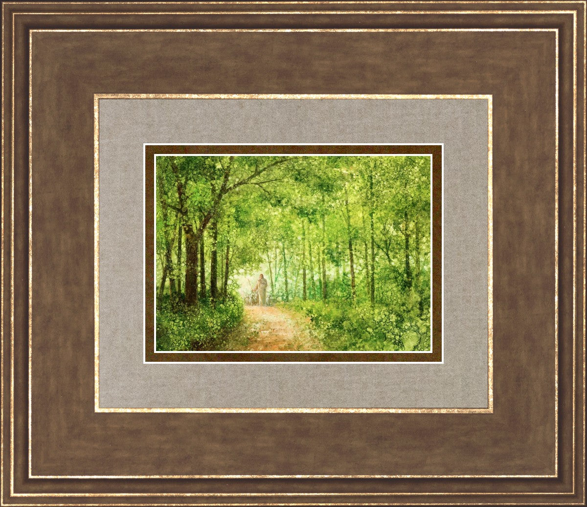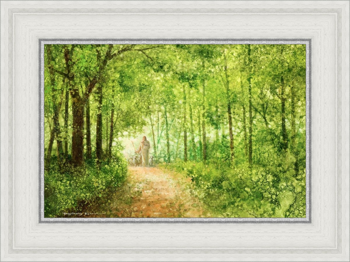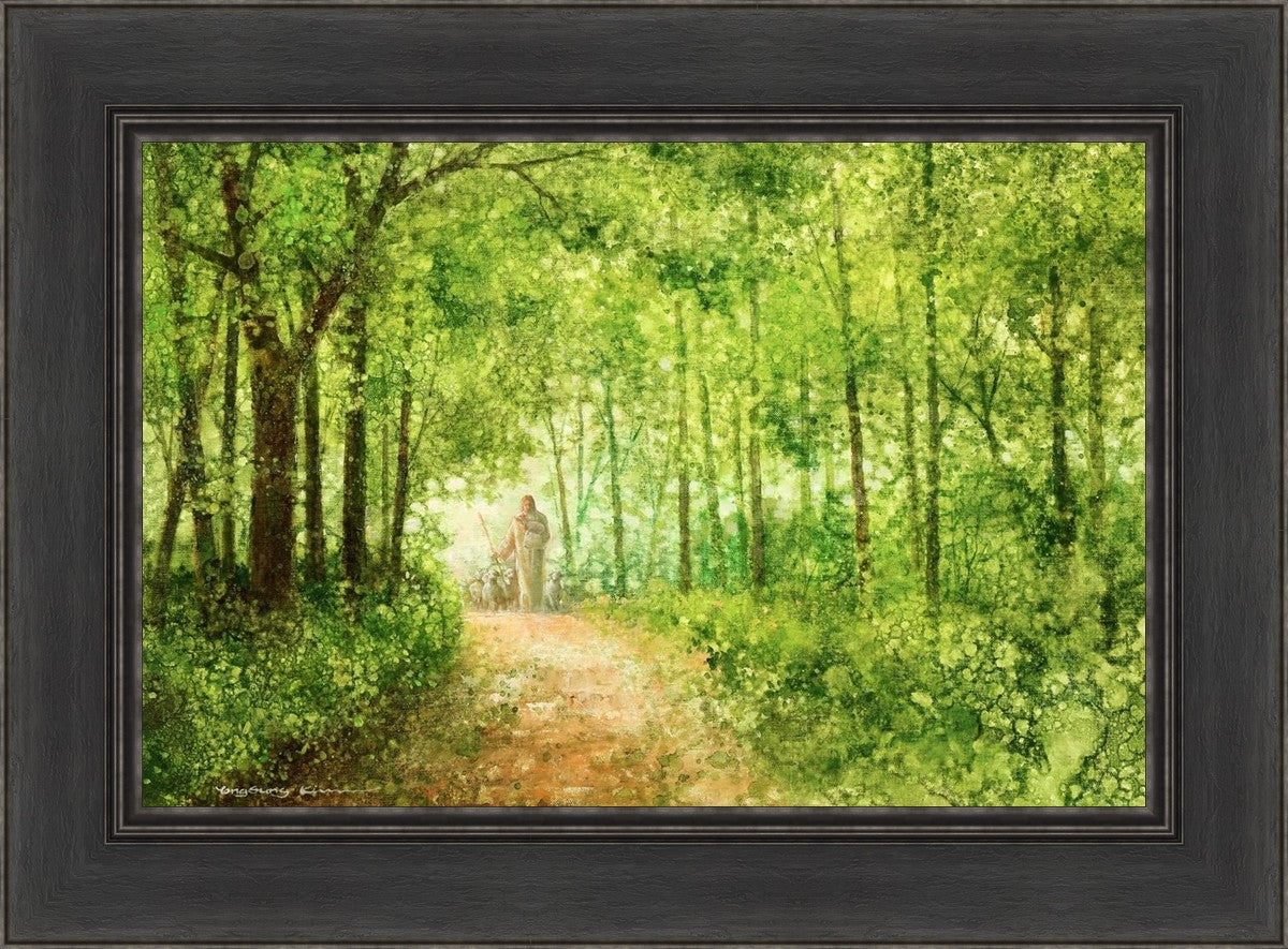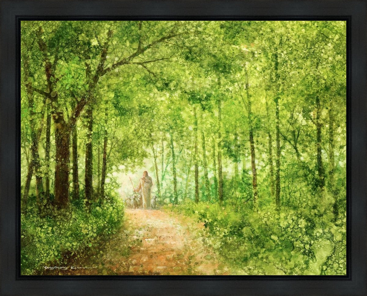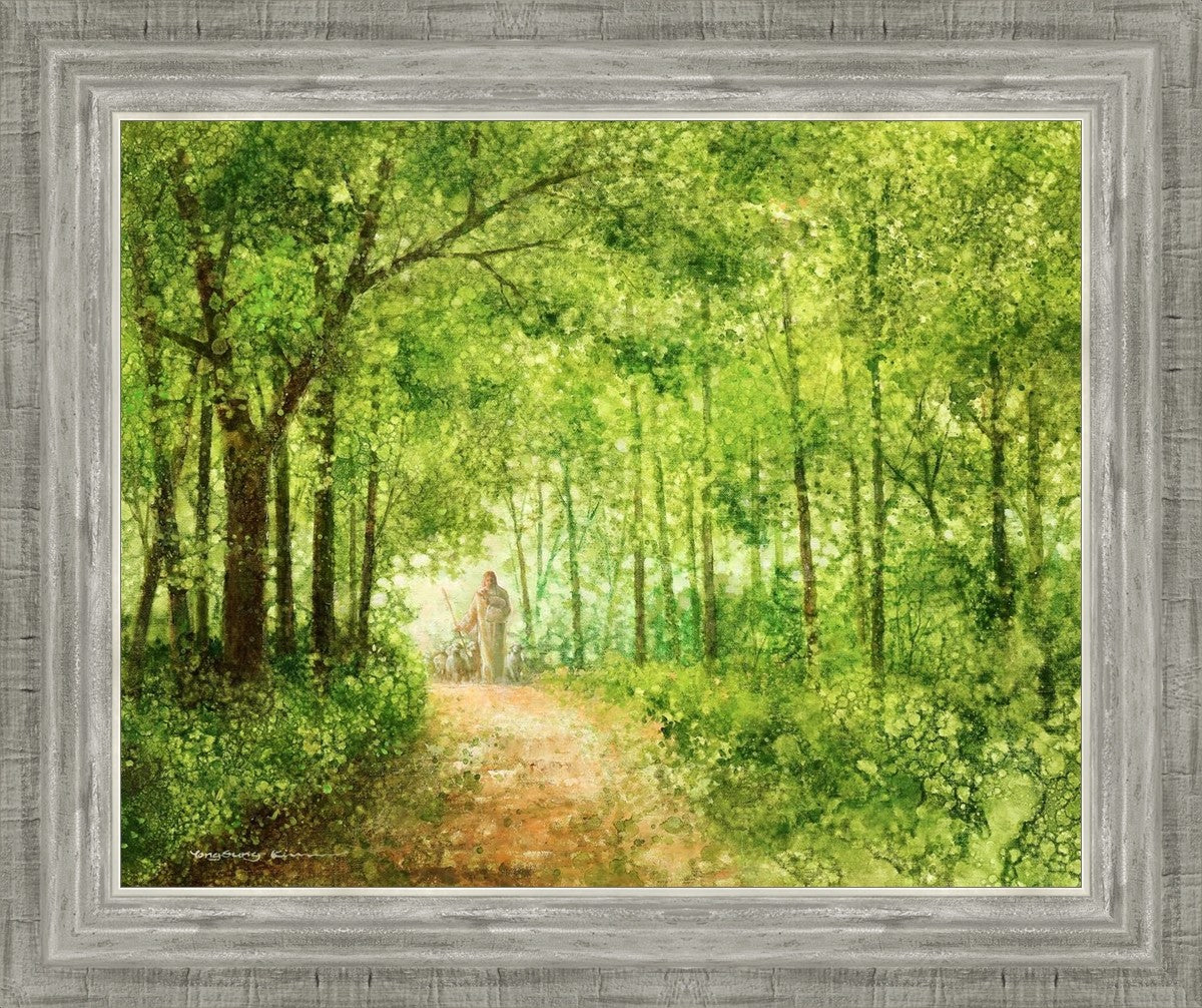 "Lead Thou Me On" by Yongsung Kim depicts Jesus Christ tenderly holding a lamb, leading a flock of sheep along a tree-lined path.