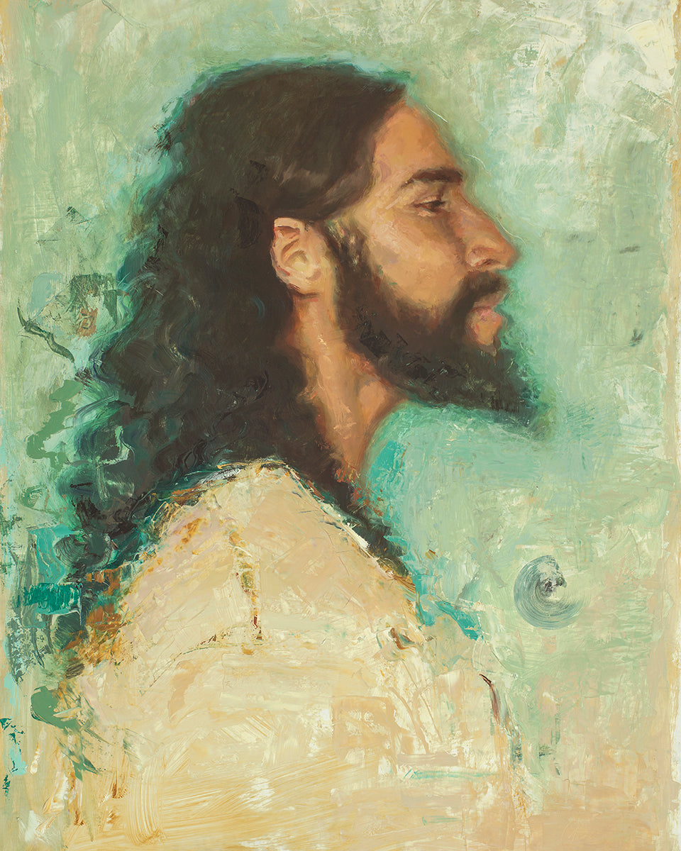 Living Waters merges a historically-based image of Christ with one that still feels visually familiar and spiritually strong. Christ's facial features and ethnicity portray what a Jewish Galilean man in the first century might have looked like. Christ's hair and beard have been left longer, reminiscent of the familiar (anglicized) images I grew up with. To depict the Savior as powerful and life-giving, I employed abstract teals and turquoise elements denoting Christ as the living water. He enlivens and sustains us. He is the key element to our mortal and eternal lives.