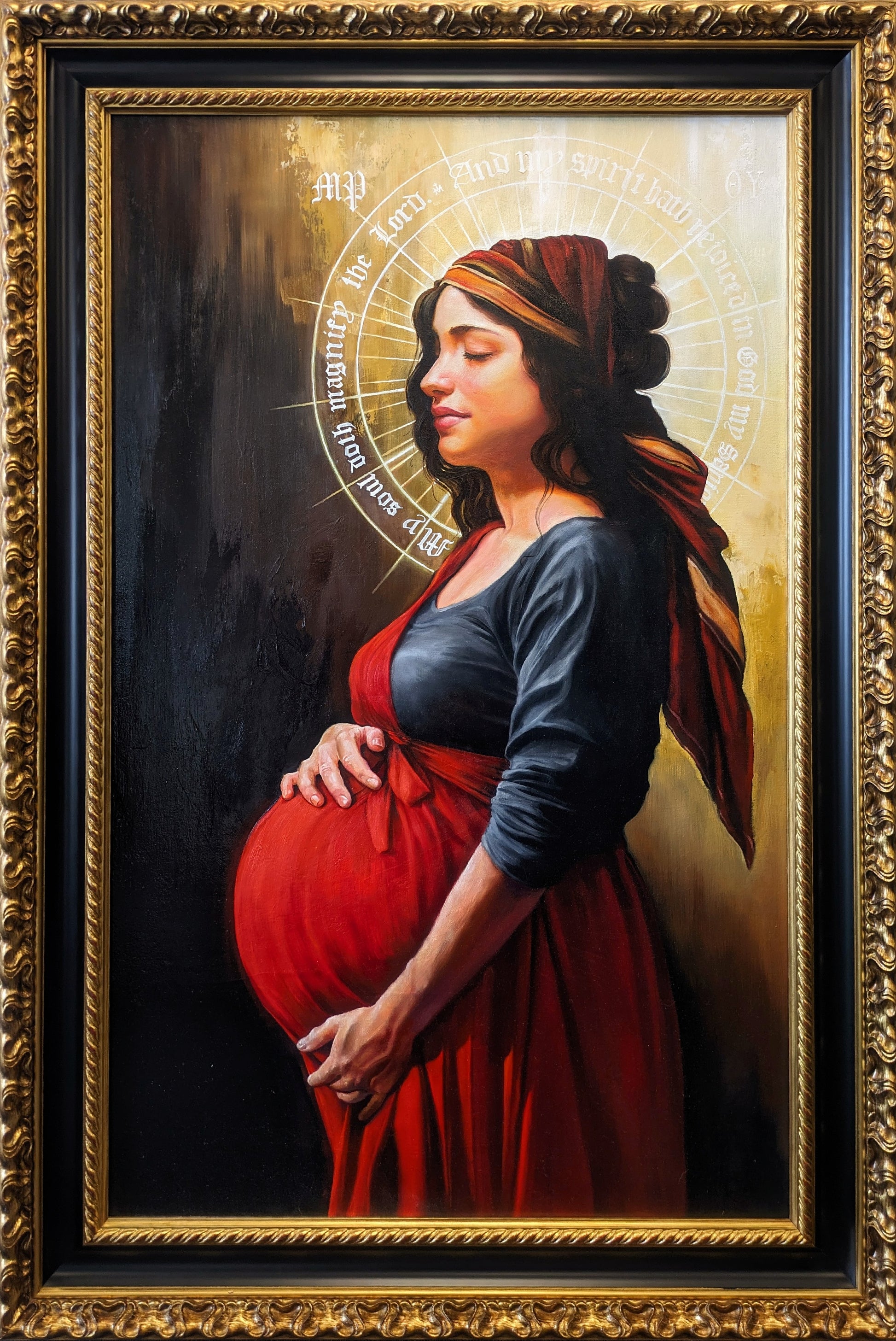 My Soul Doth Magnify the Lord is a profound depiction of Mary, the Mother of God, as she tenderly holds her pregnant belly, deeply contemplating the nascent life within. This artwork masterfully employs chiaroscuro techniques to illuminate the central figure, highlighting the divine life burgeoning within her womb. Traditional iconographic elements enrich the composition; a radiant halo encircles her head, symbolizing her sanctity, while the words of the Magnificat gracefully encircle her visage, reflecting her soul's rejoicing.