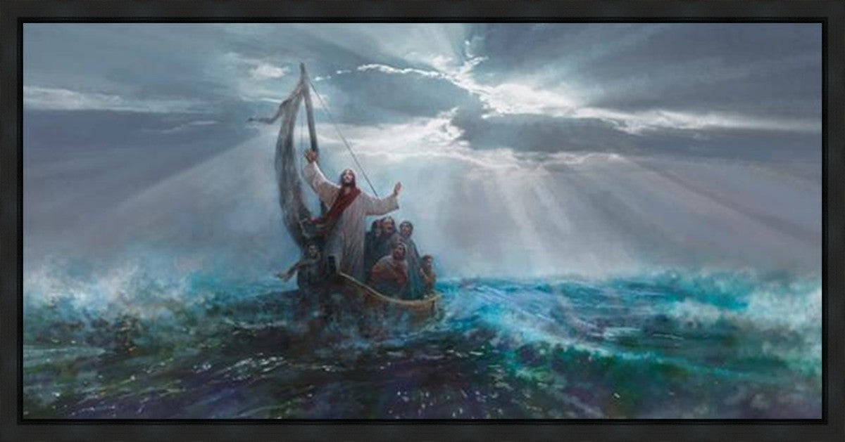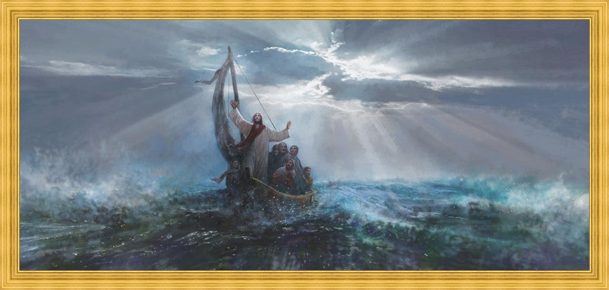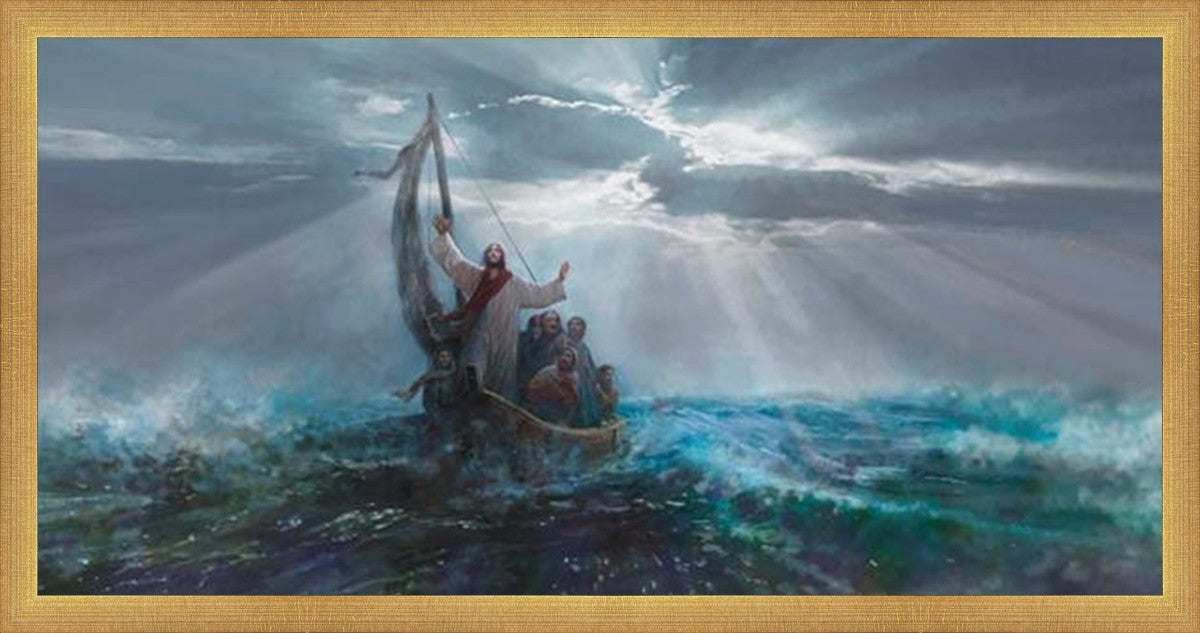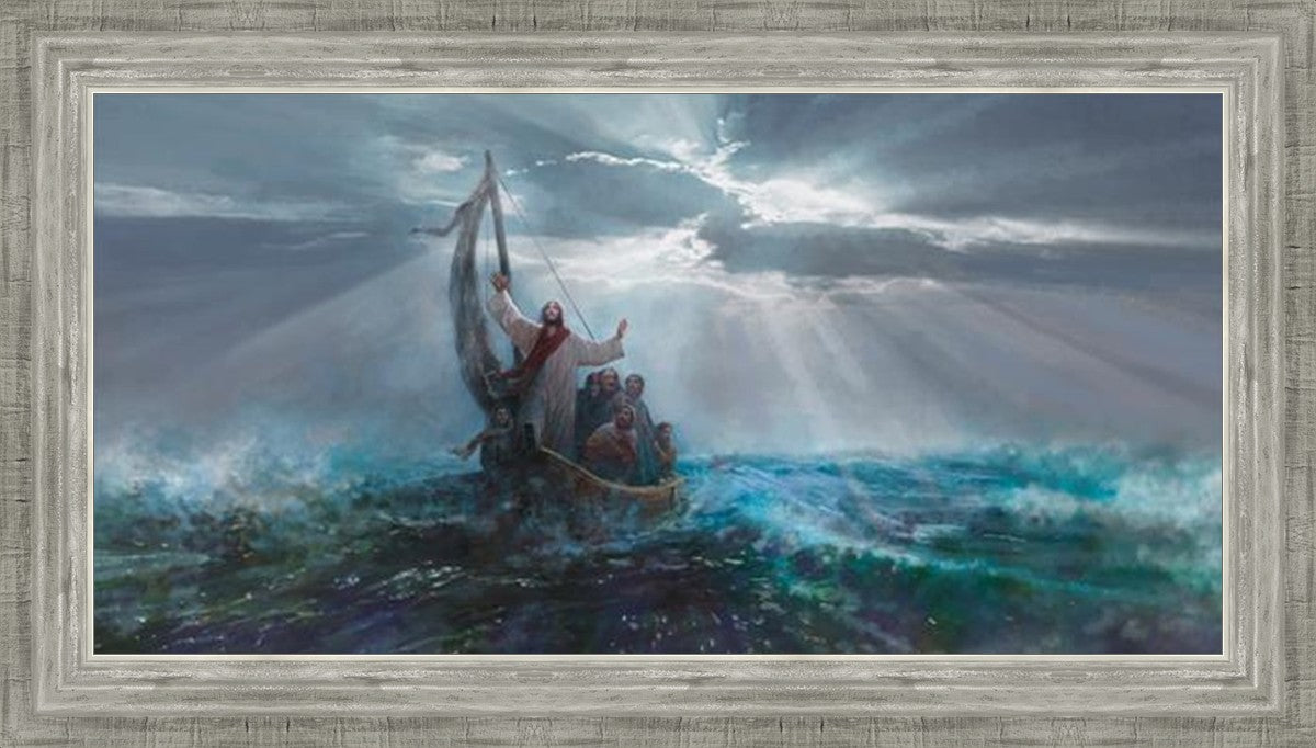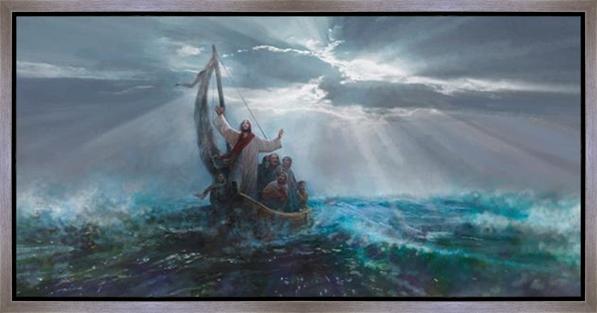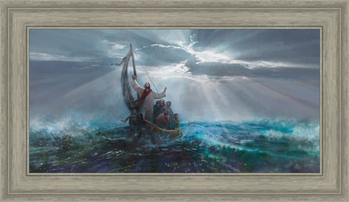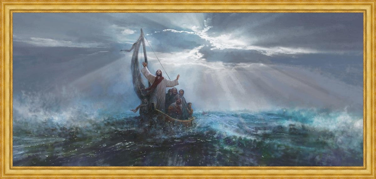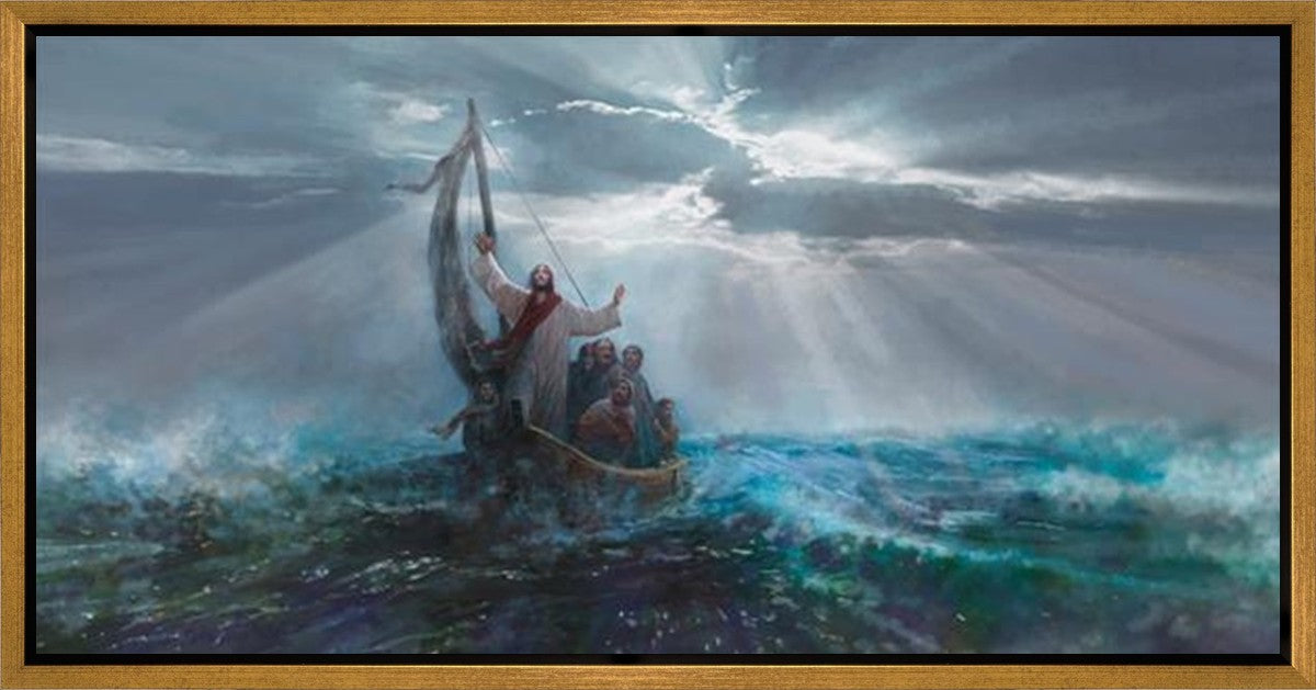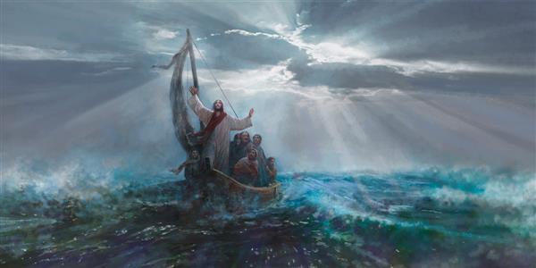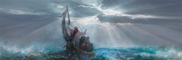 Peace Be Still is a painting by Yongsung Kim. This painting depicts Jesus Christ calming the raging sea amidst a storm.