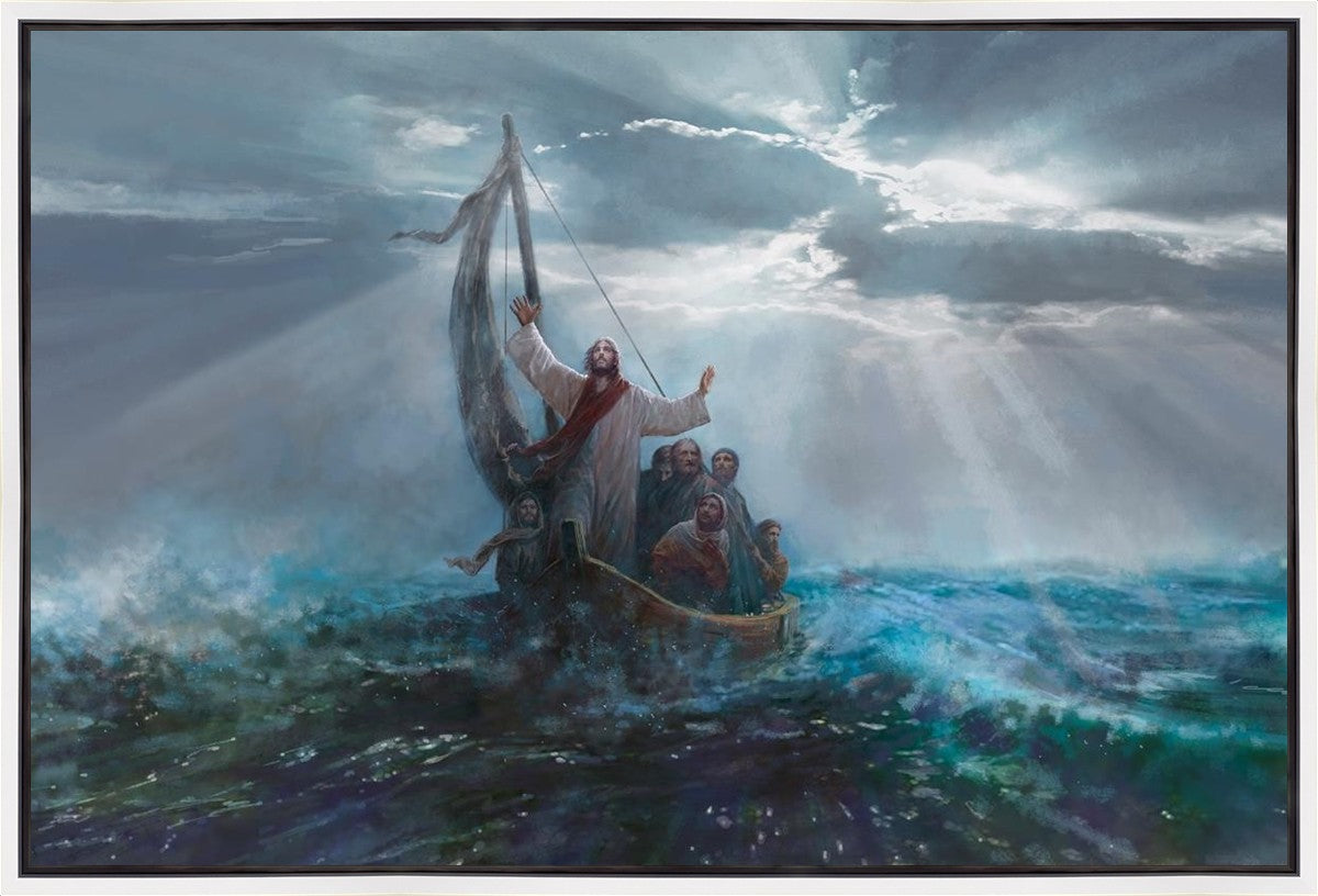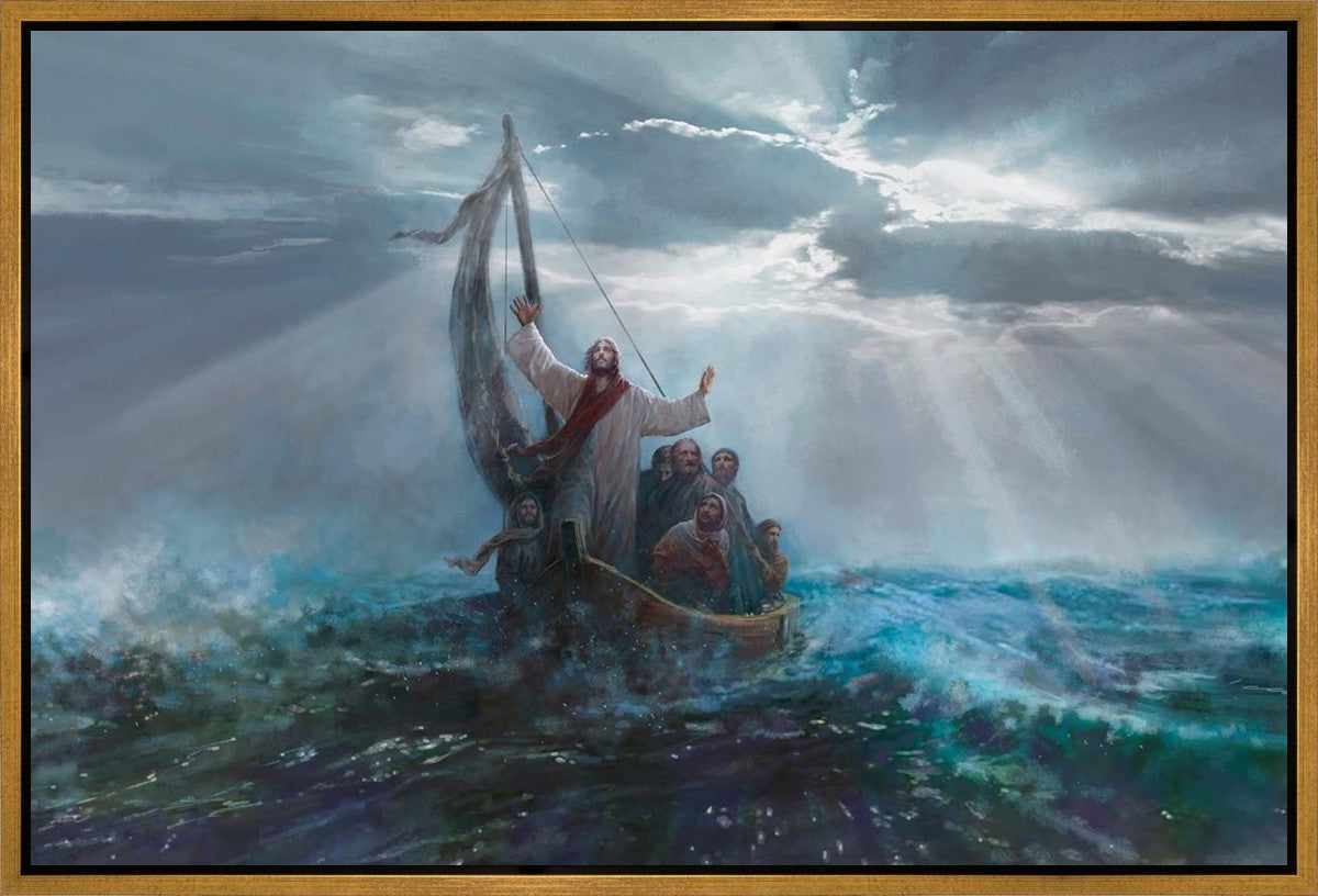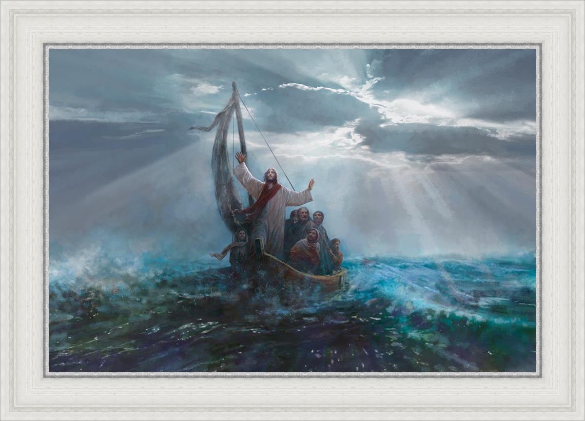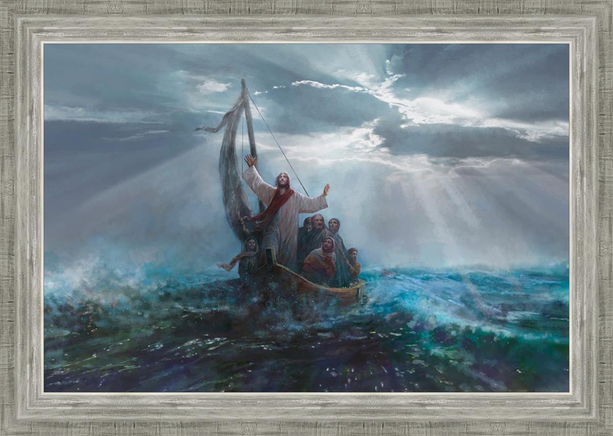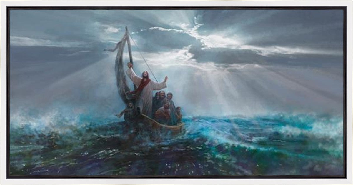 "Peace Be Still" by Yongsung Kim is a powerful painting depicting Jesus on a boat in the midst of a storm, emanating peace and calm.