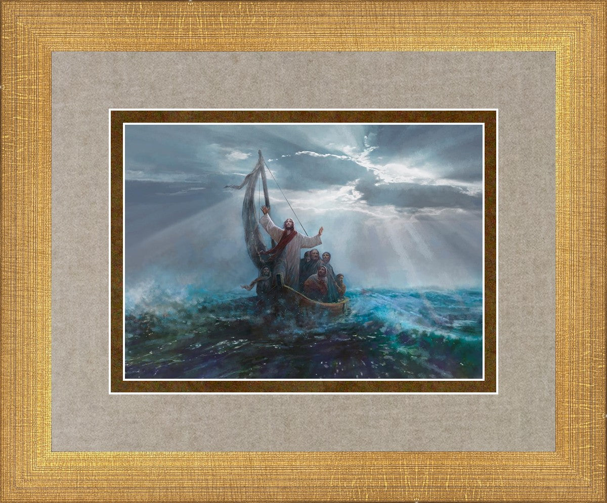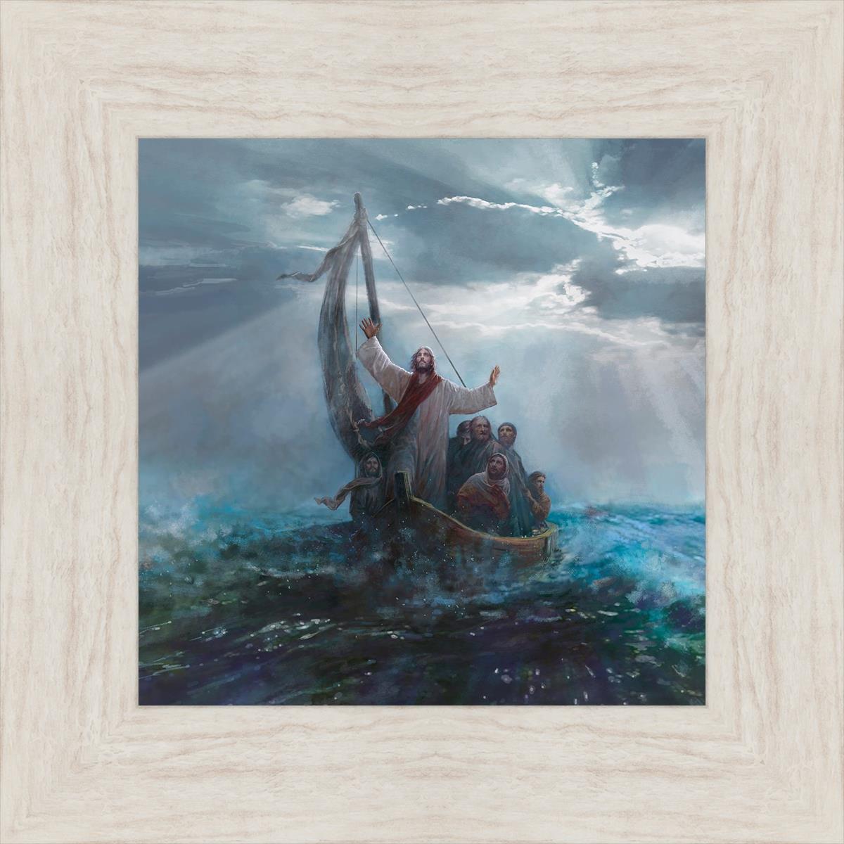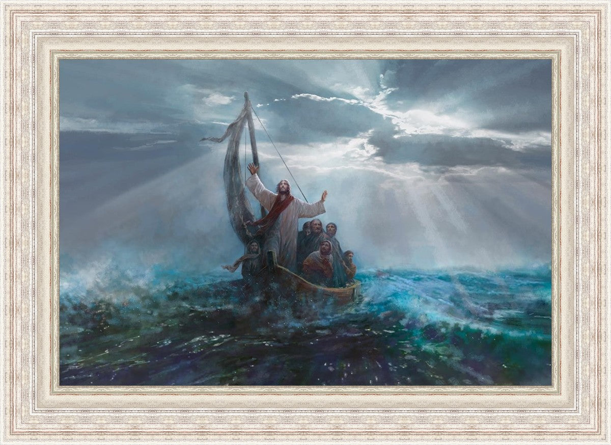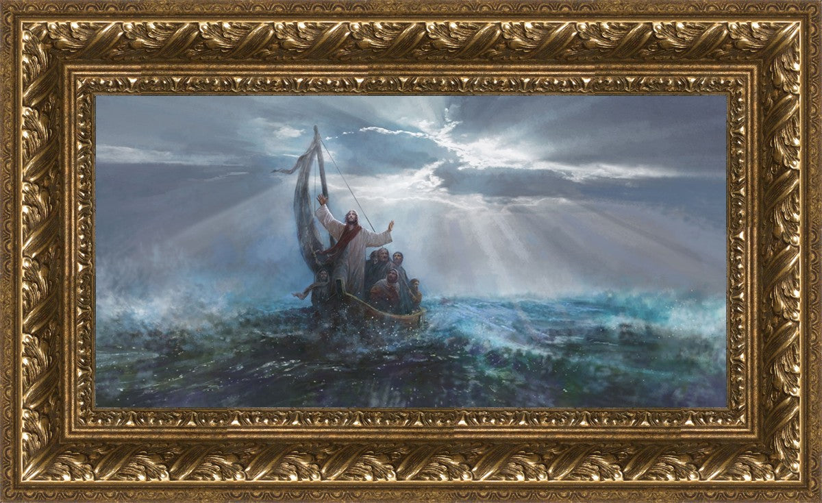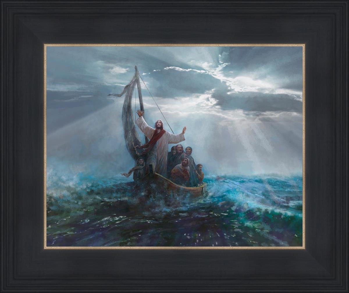 "Peace Be Still" by Yongsung Kim is a powerful painting depicting Jesus on a boat in the midst of a storm, emanating peace and calm.