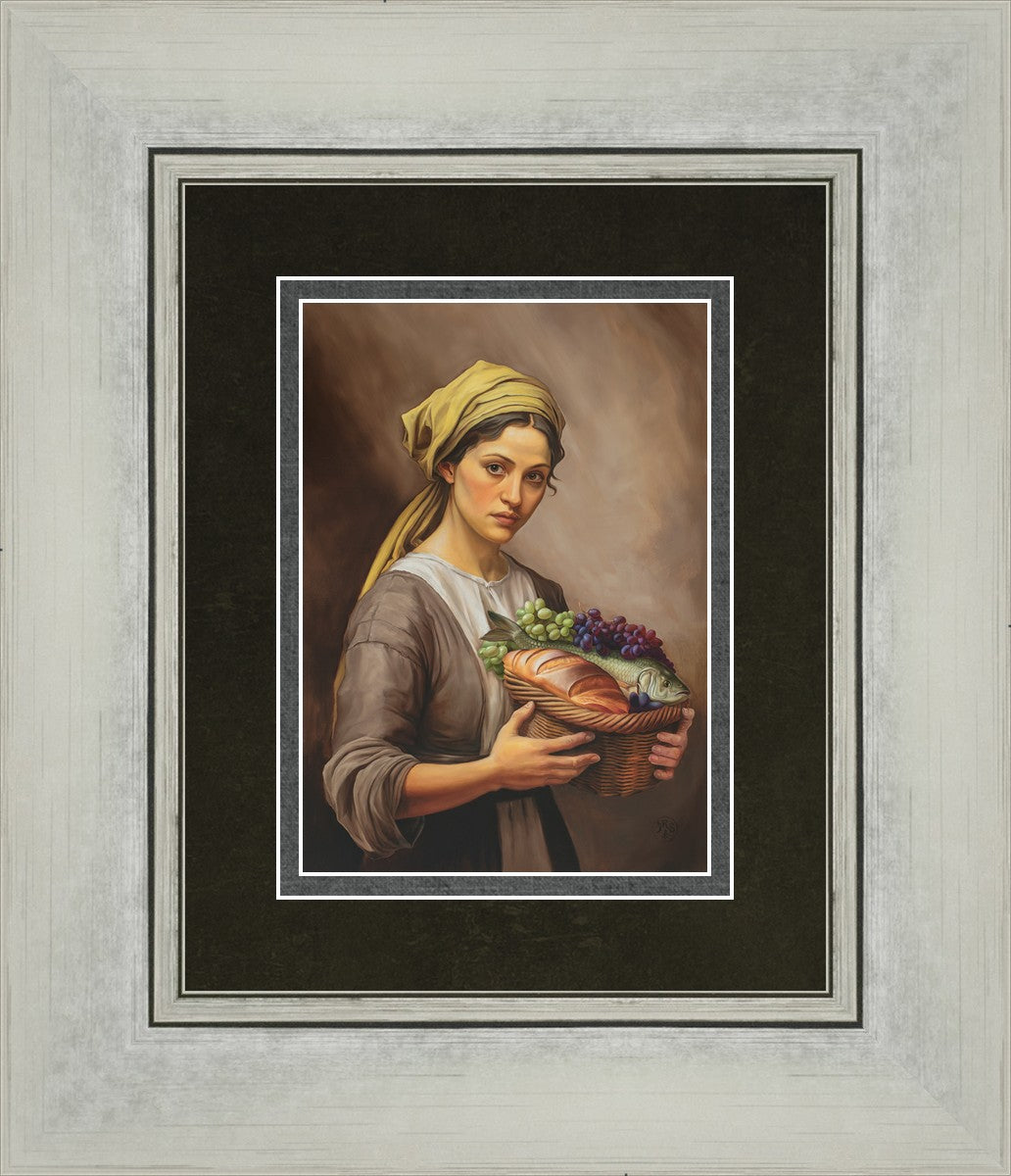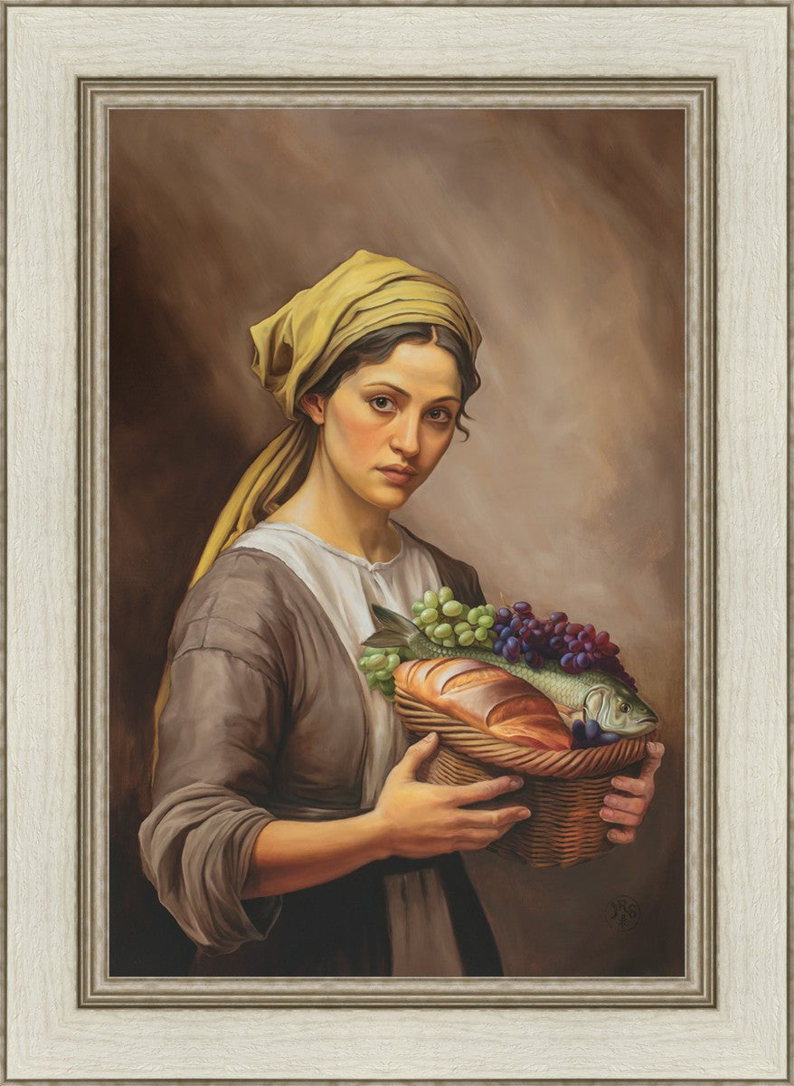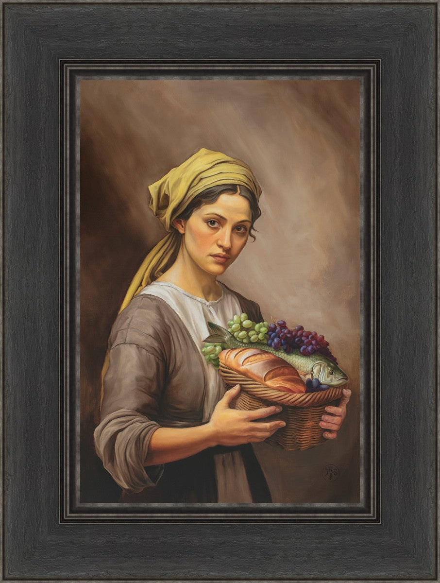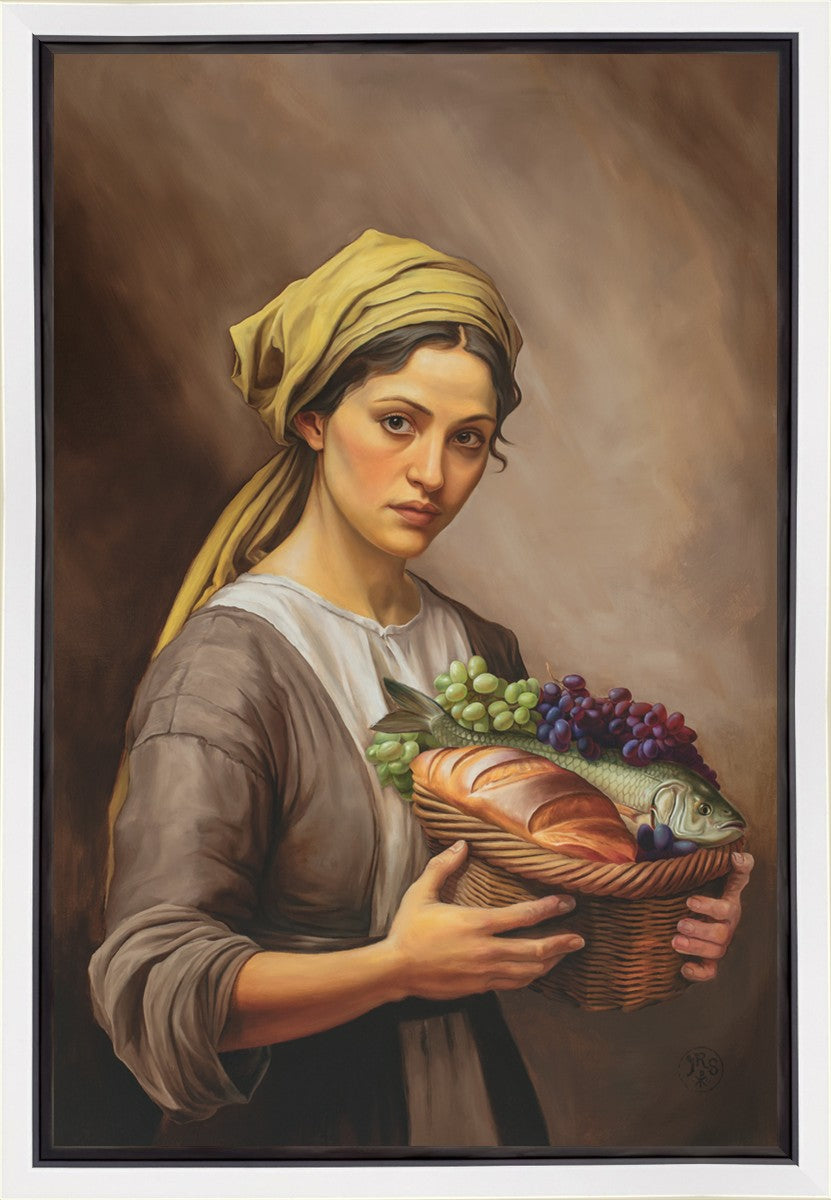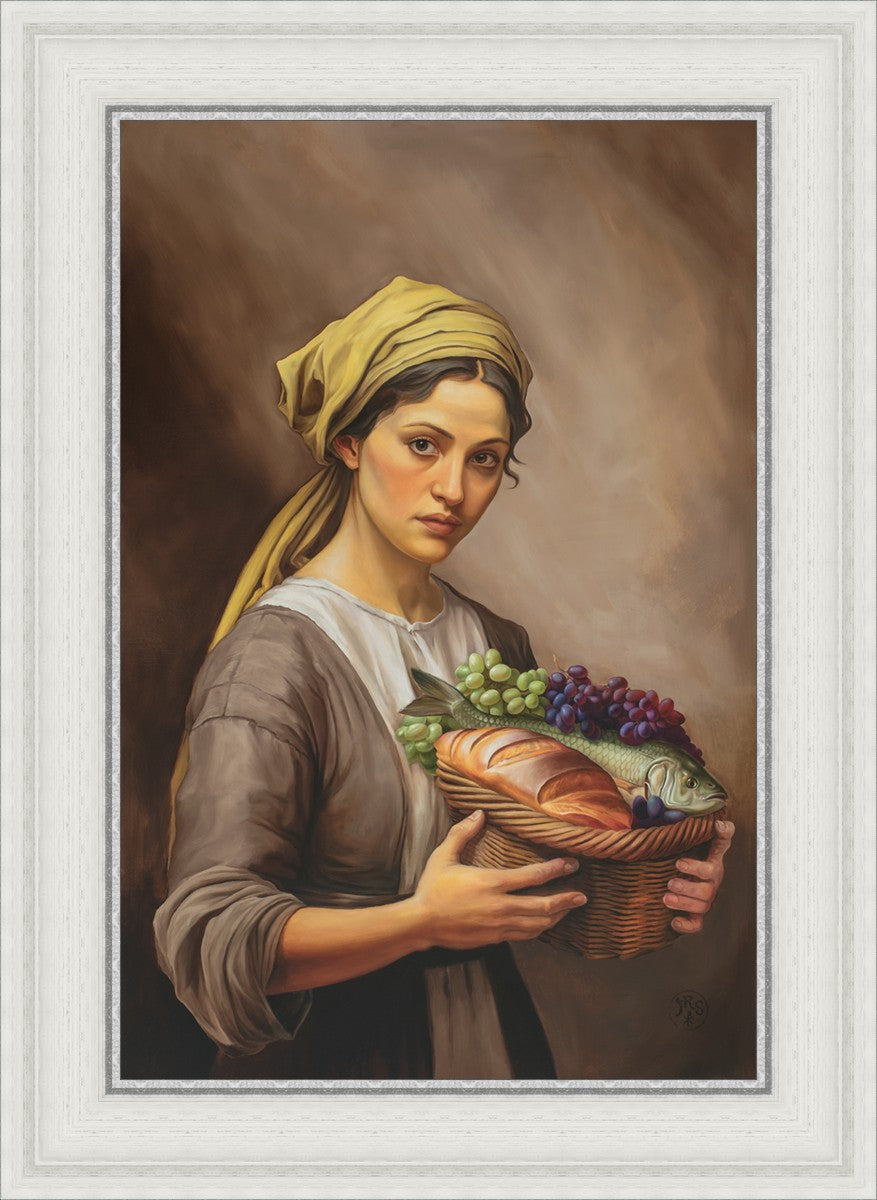 'She Who Waited on The Lord,' a piece that delves into the quiet, steadfast devotion of St. Martha of Bethany. This art piece masterfully captures Martha in a moment of quiet anticipation, embodying the spirit of humble service and devotion. She is elegantly portrayed holding a meticulously detailed basket, brimming with symbolically rich elements of sustenance - ripe grapes, freshly baked bread, and fish, each element rendered with striking realism.