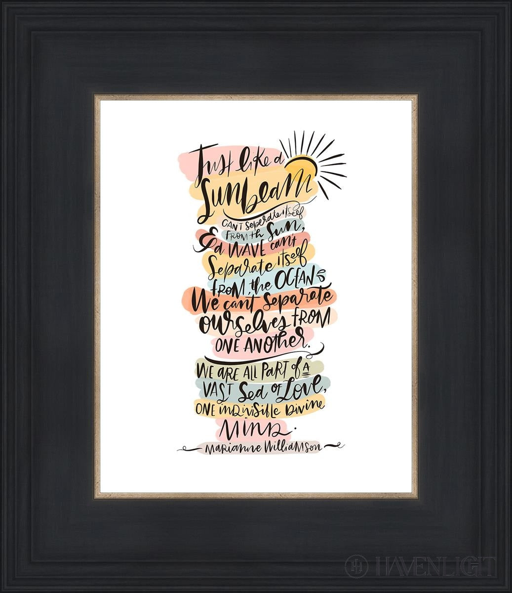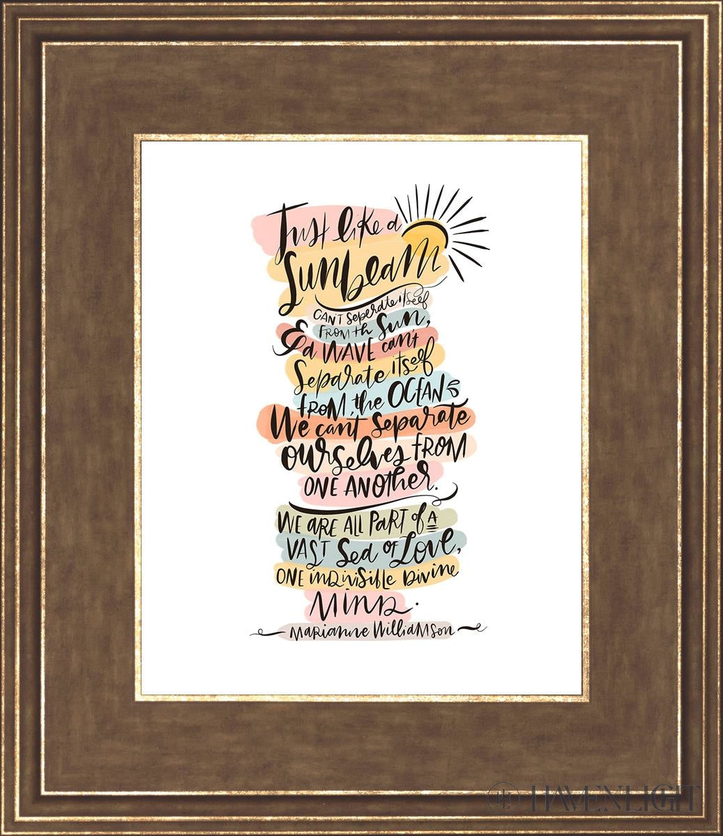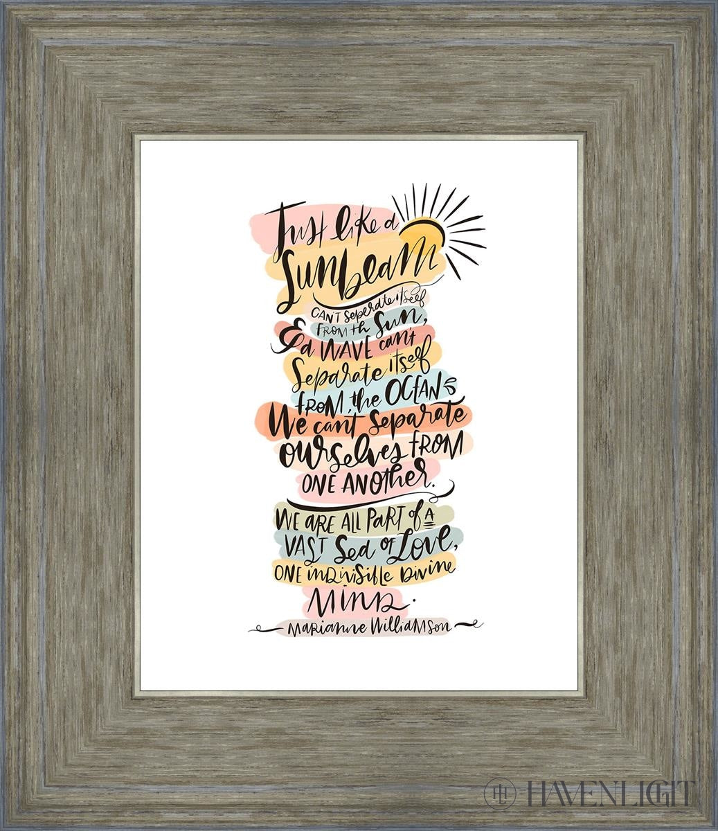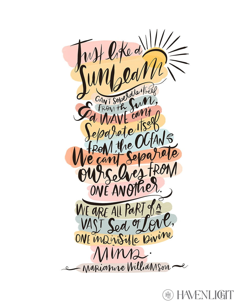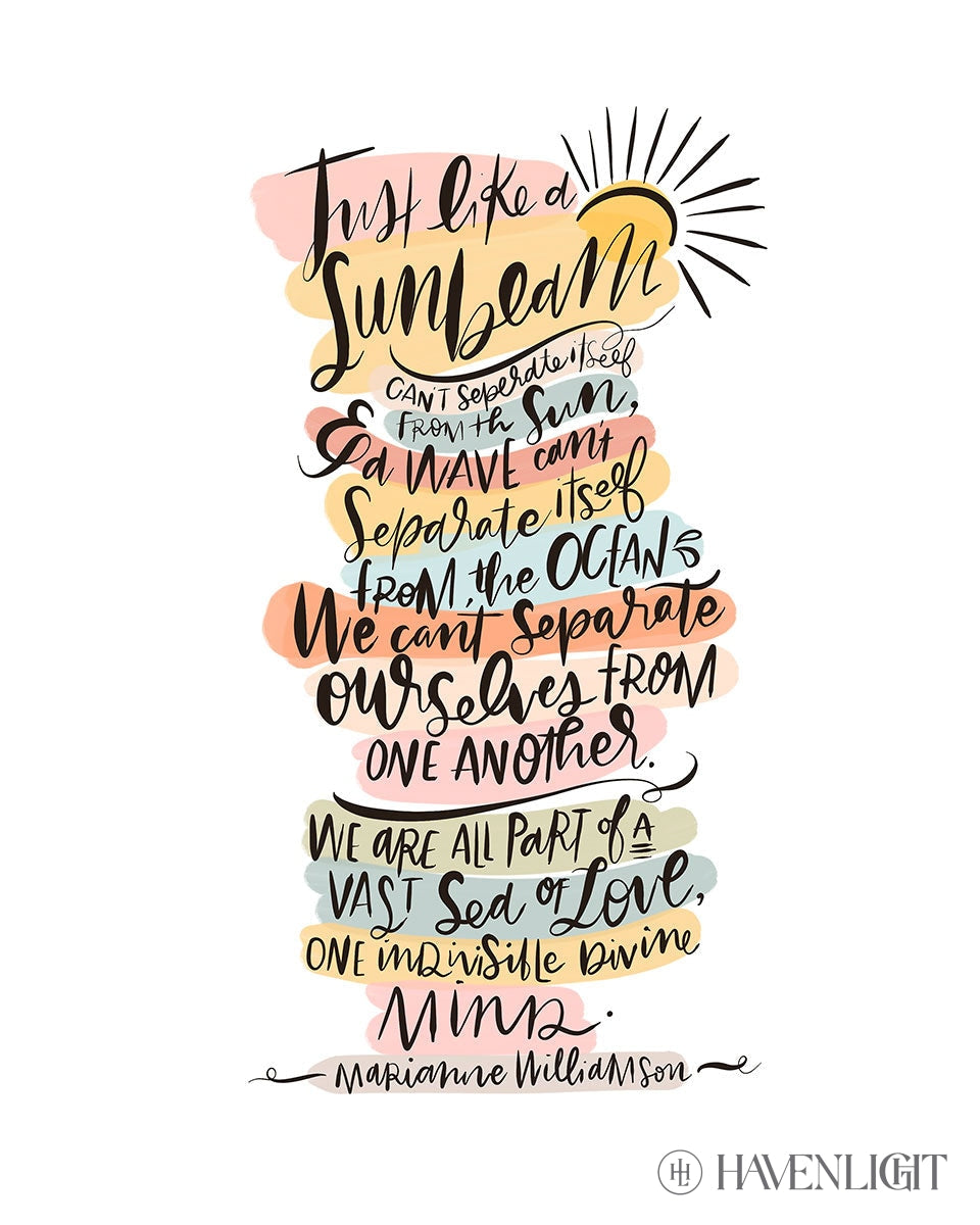 Insprational home decor with the words just like a sunbeam can't seperate itself from the sun, and a wave can't seperate from the oceans, we can't seperate ourselves from one another. We are all part of a vast sea of love, one indivisible, divine mind. - Marianne Williamson