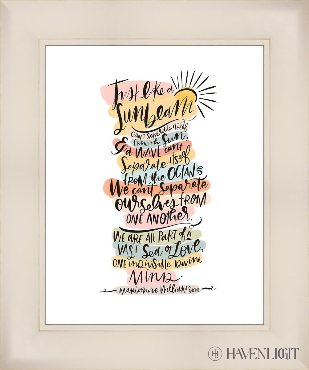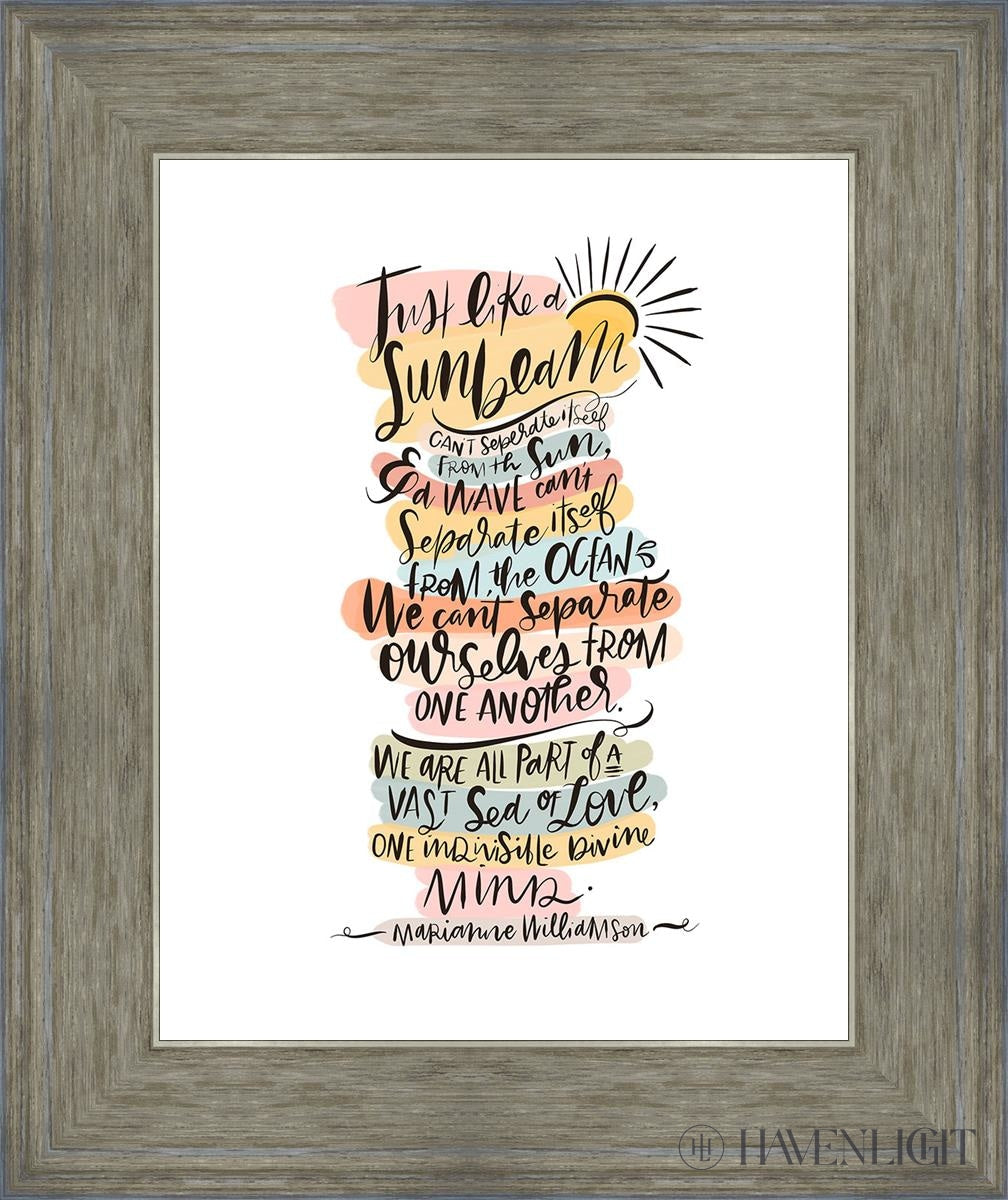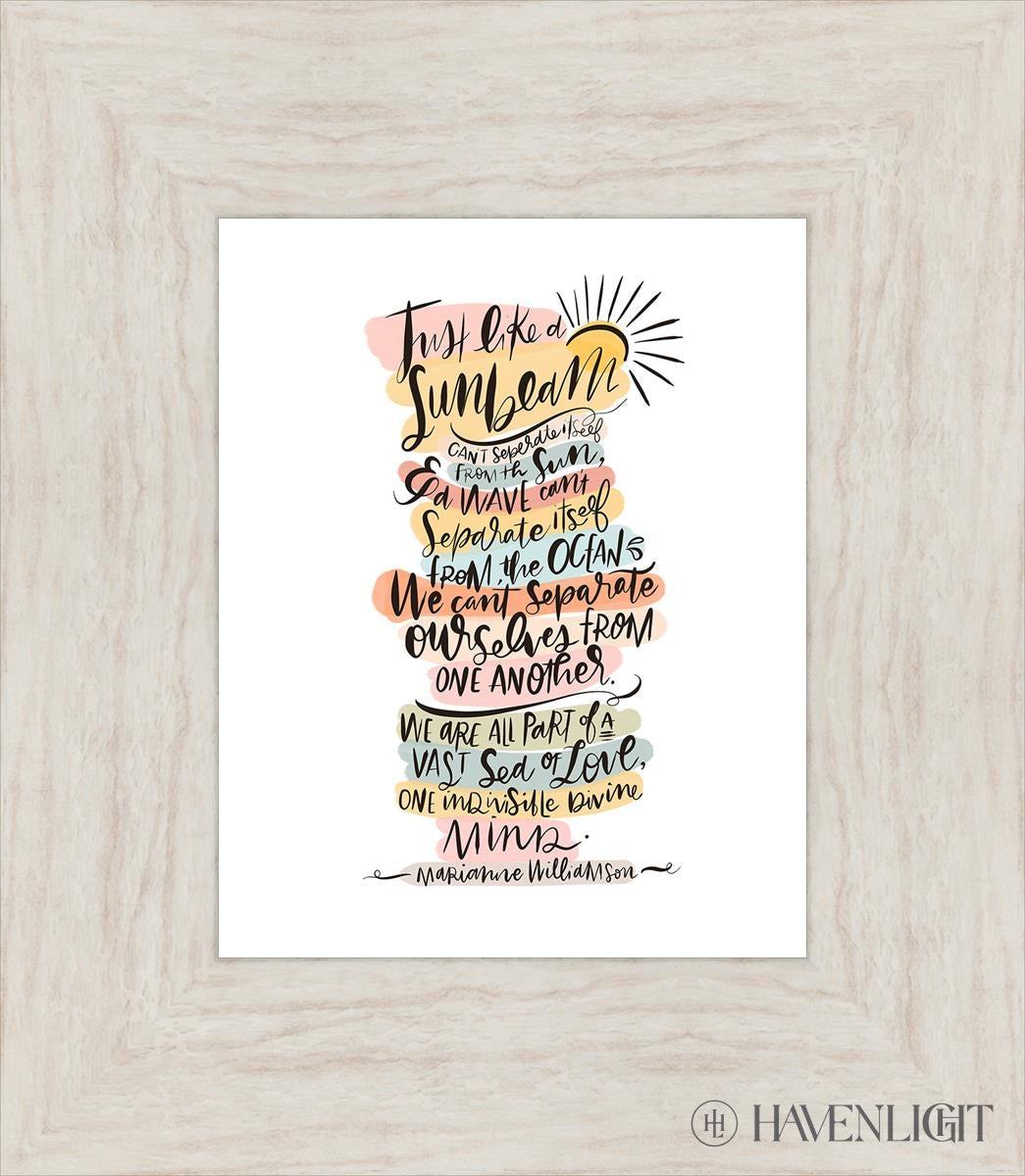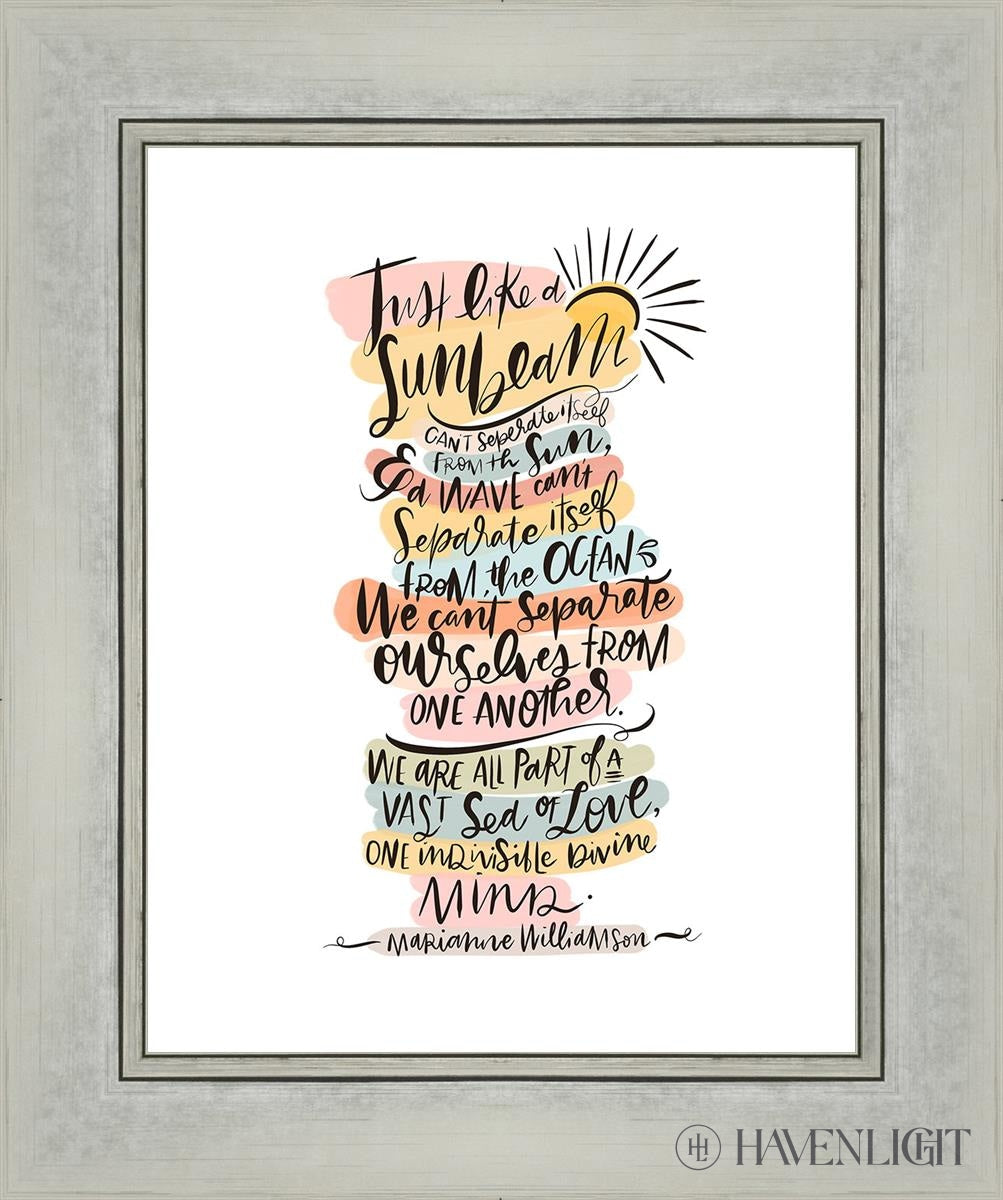 Insprational home decor with the words just like a sunbeam can't seperate itself from the sun, and a wave can't seperate from the oceans, we can't seperate ourselves from one another. We are all part of a vast sea of love, one indivisible, divine mind. - Marianne Williamson