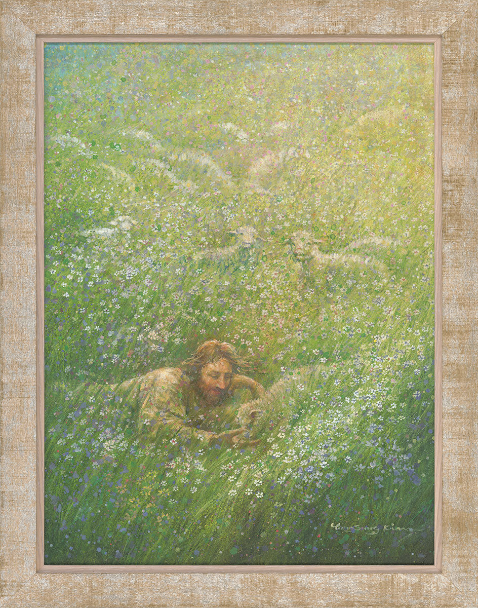 In We Are All Wildflowers, Jesus Christ sits in a field of grass and jubilant blooming wildflowers. He gently embraces a single lamb while others begin to materialize around Him, their forms softly woven from petals, stems, and light of Christ. Each sheep appears distinct, shaped by the same earth yet unmistakably its own, mirroring the way no two wildflowers are ever identical. Christ’s embrace affirms that every life, however small or different, is known and loved exactly as it was formed. The painting suggests that we are all grown from the same divine ground, rooted in grace, and gathered together despite our individual uniqueness.