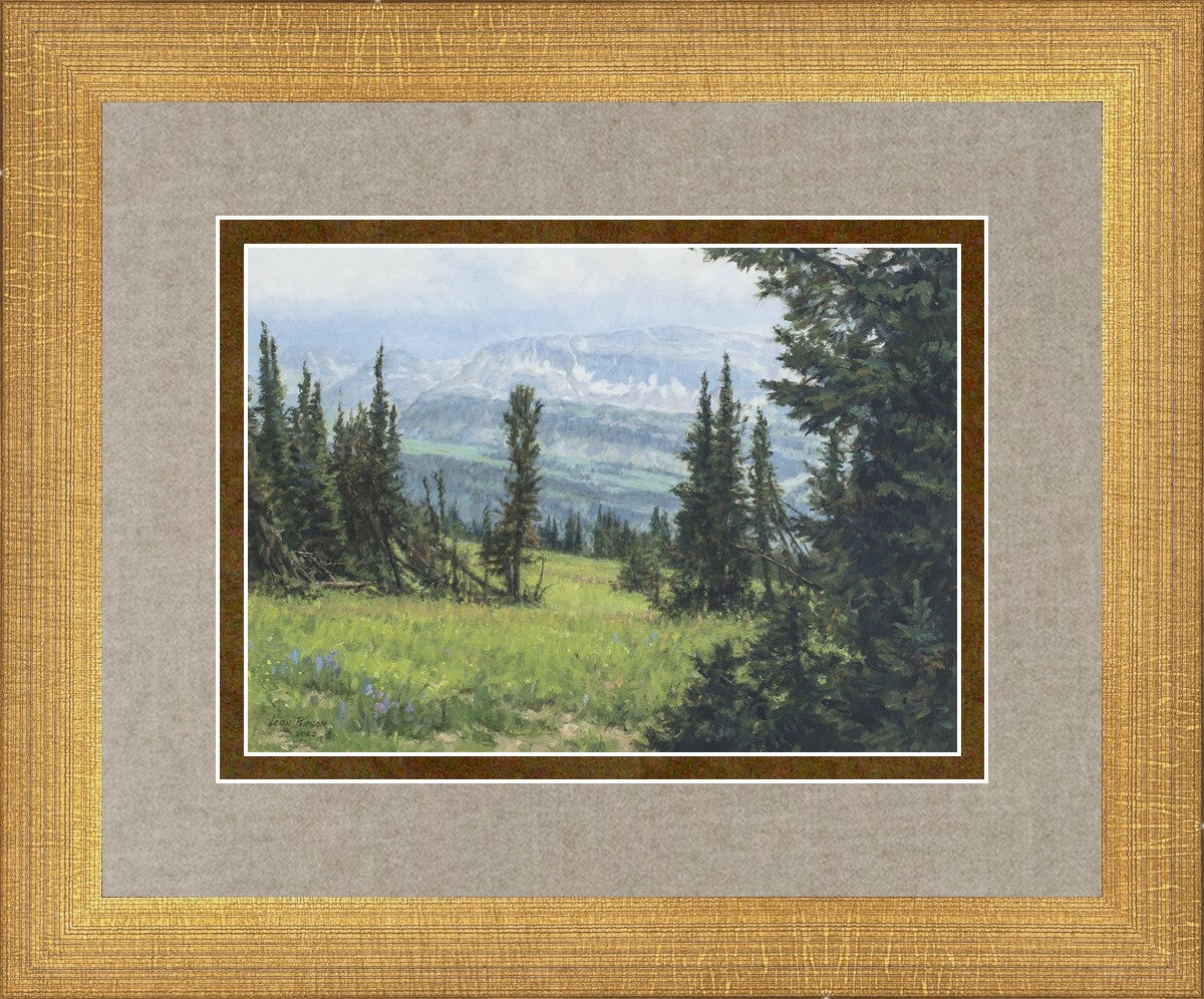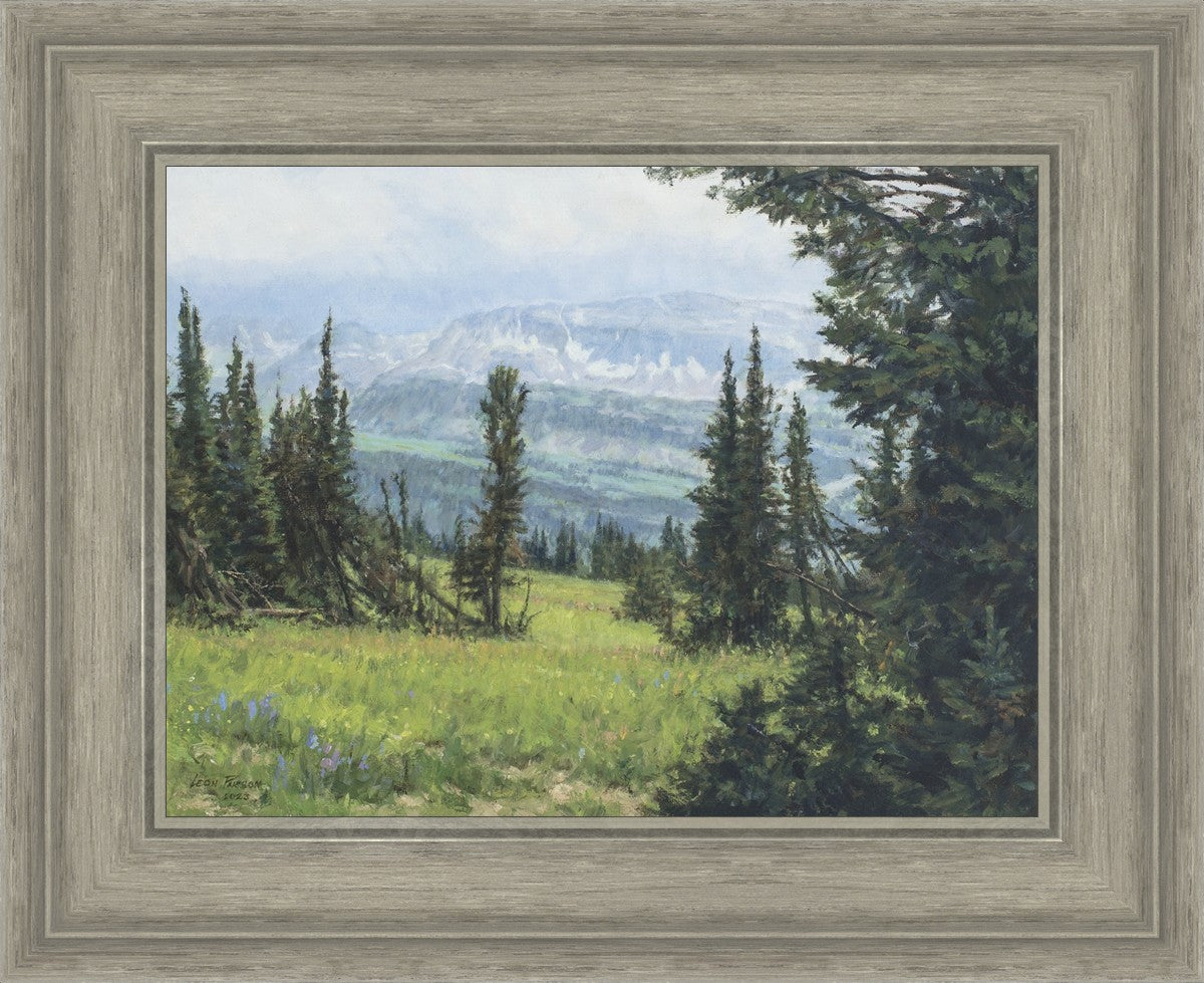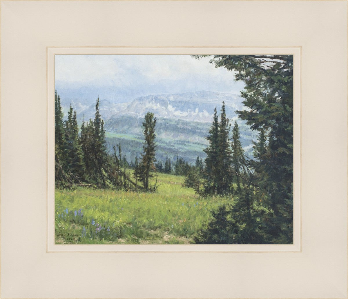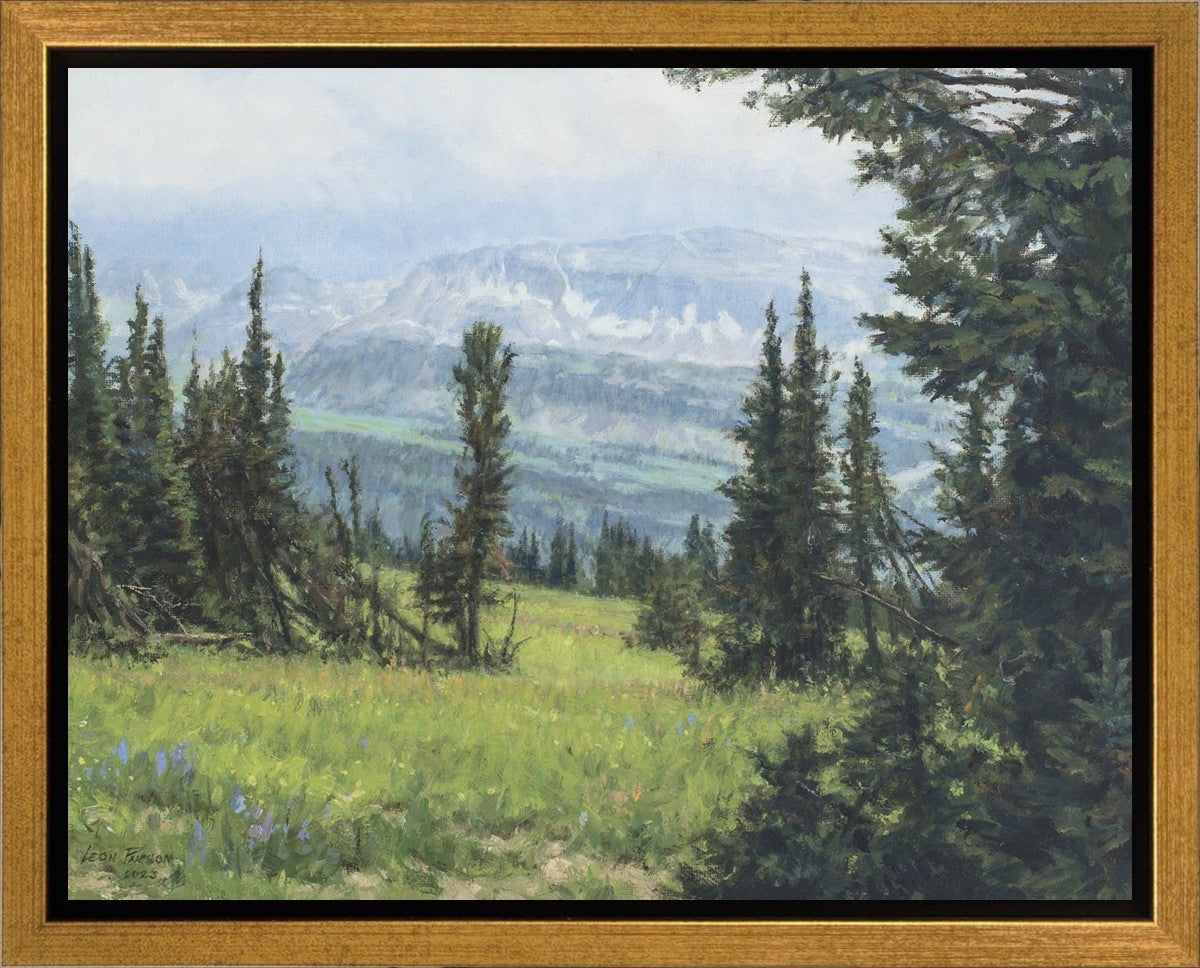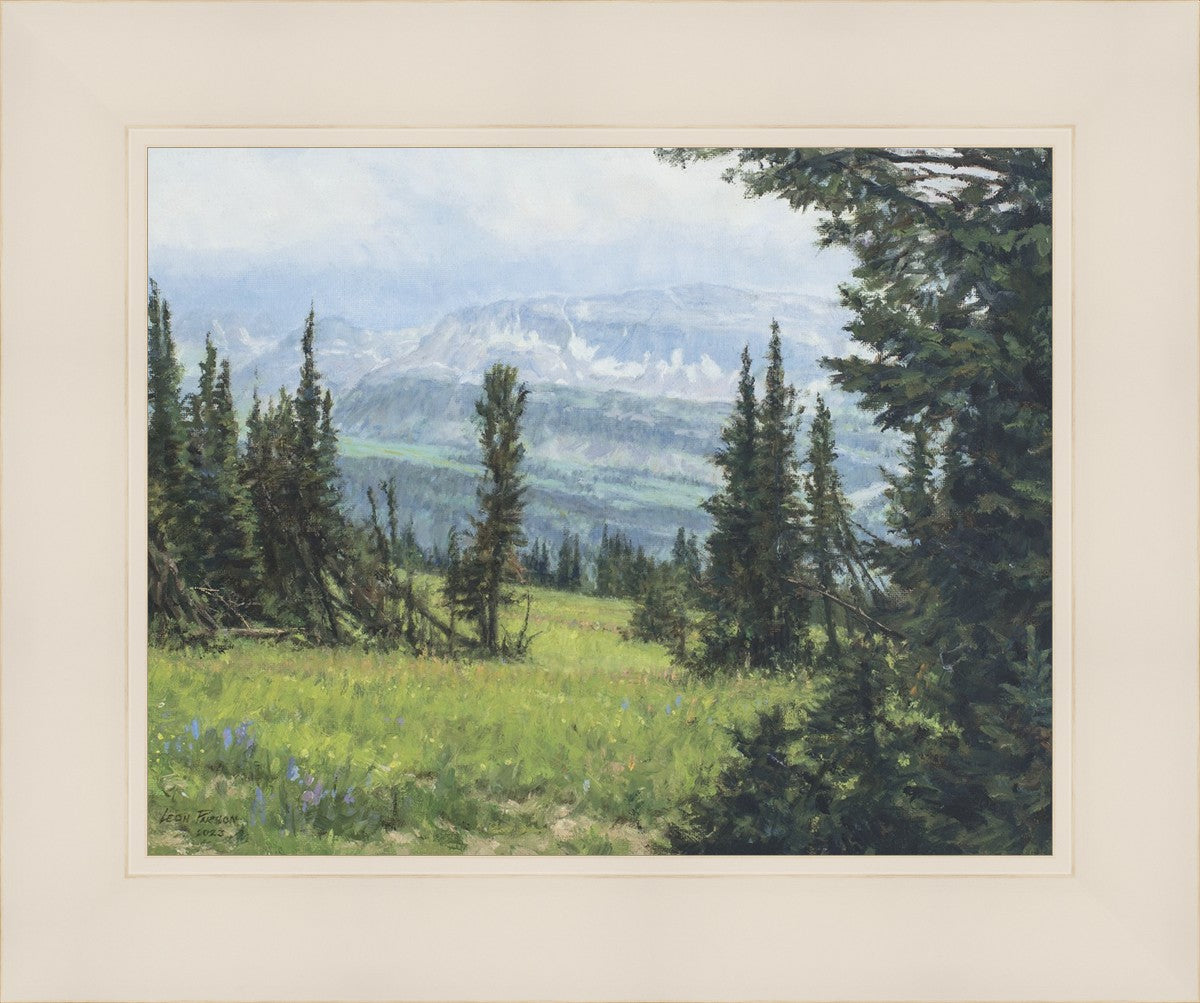 The location for this painting is from a hike up to Table Rock, near the Grand Teton Peak, when I was serving as a leader to a group of young men and young women. I enjoyed the obvious evidence of the severity of the windstorms that are ever present that high up but also loved the wonderful resilience of the stand of pines. It started as a BYUI Landscape class demo but deserved a good amount of additional studio time later.