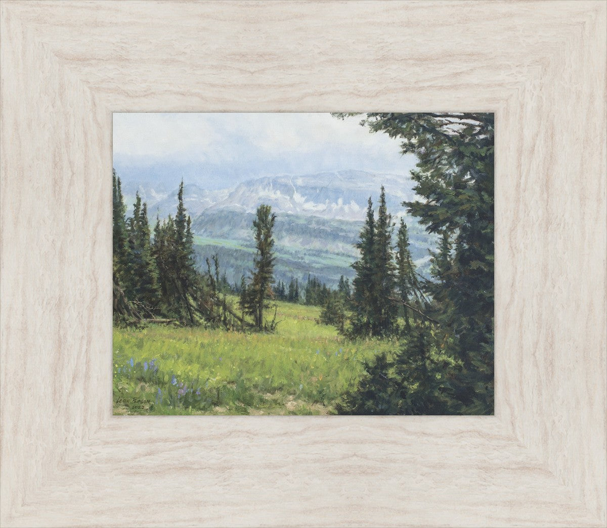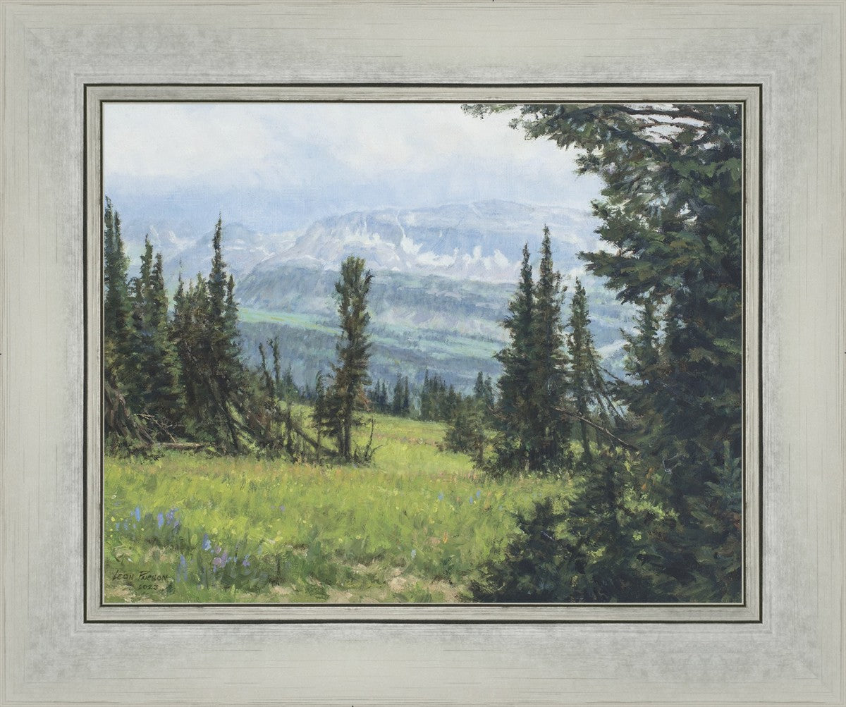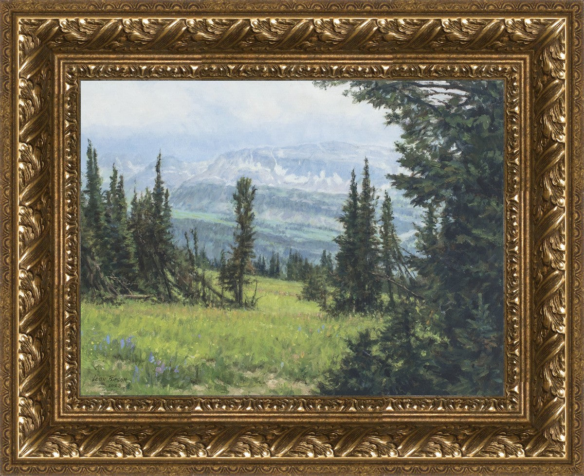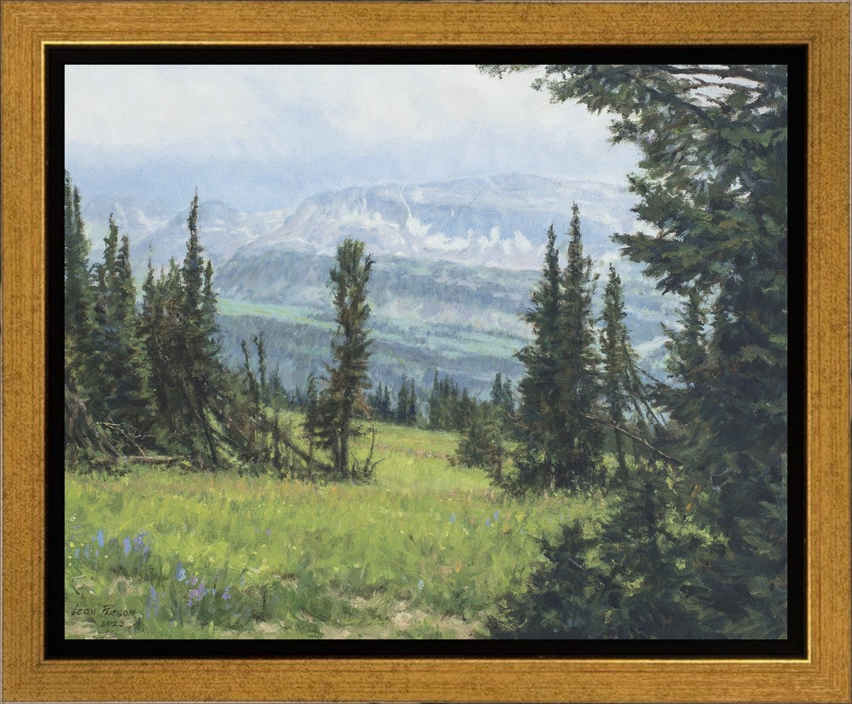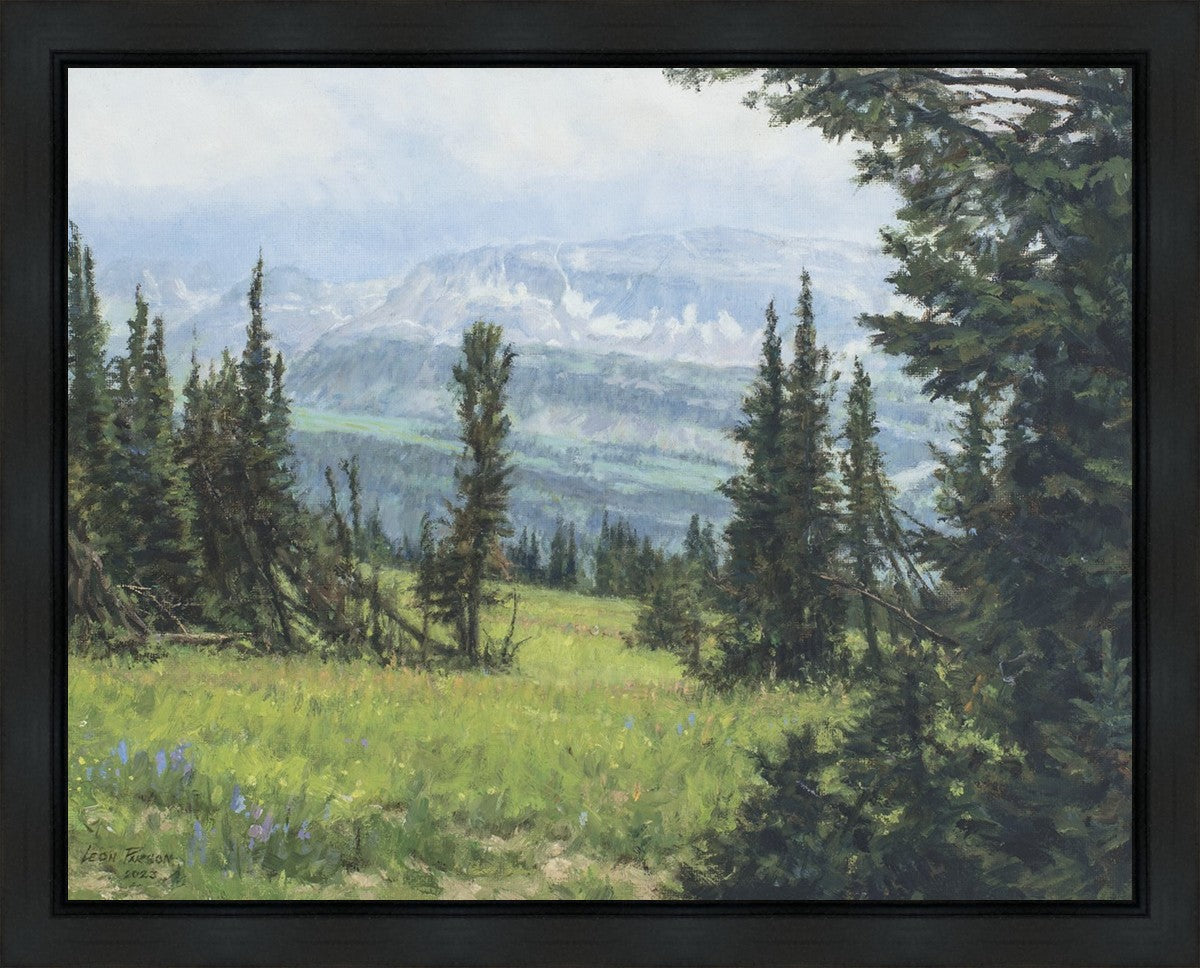 The location for this painting is from a hike up to Table Rock, near the Grand Teton Peak, when I was serving as a leader to a group of young men and young women. I enjoyed the obvious evidence of the severity of the windstorms that are ever present that high up but also loved the wonderful resilience of the stand of pines. It started as a BYUI Landscape class demo but deserved a good amount of additional studio time later.