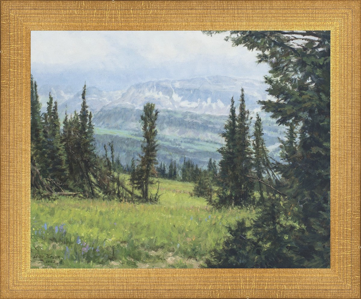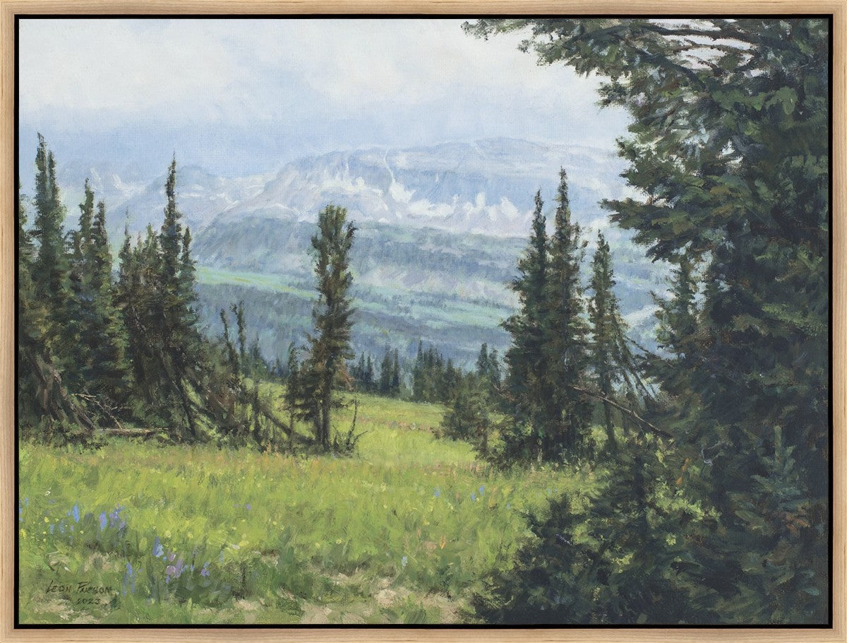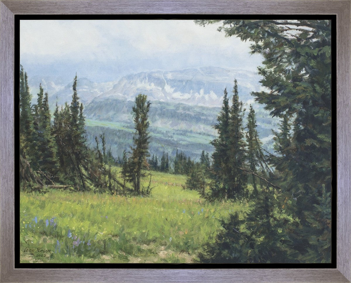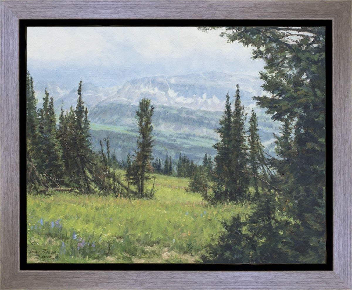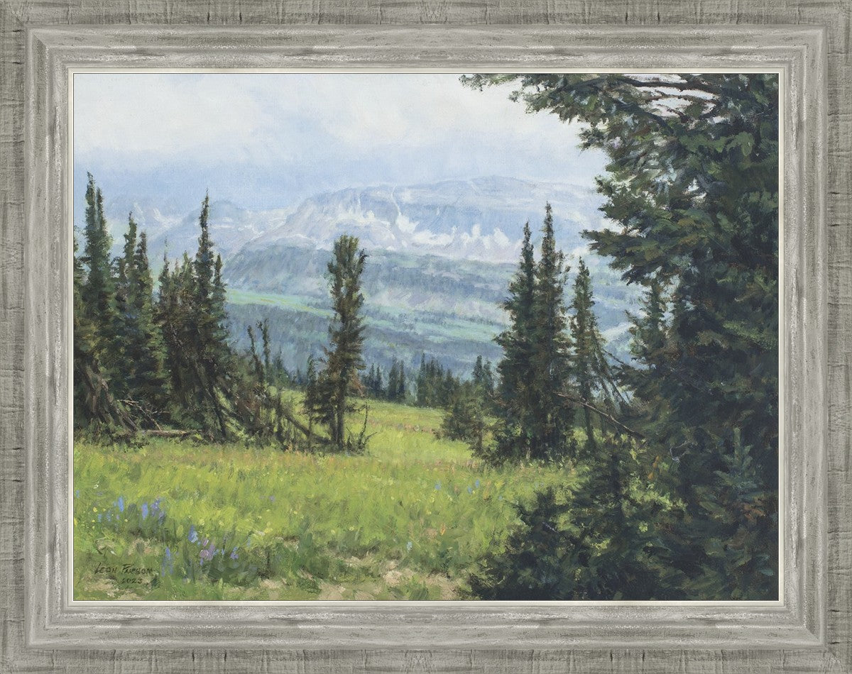 The location for this painting is from a hike up to Table Rock, near the Grand Teton Peak, when I was serving as a leader to a group of young men and young women. I enjoyed the obvious evidence of the severity of the windstorms that are ever present that high up but also loved the wonderful resilience of the stand of pines. It started as a BYUI Landscape class demo but deserved a good amount of additional studio time later.