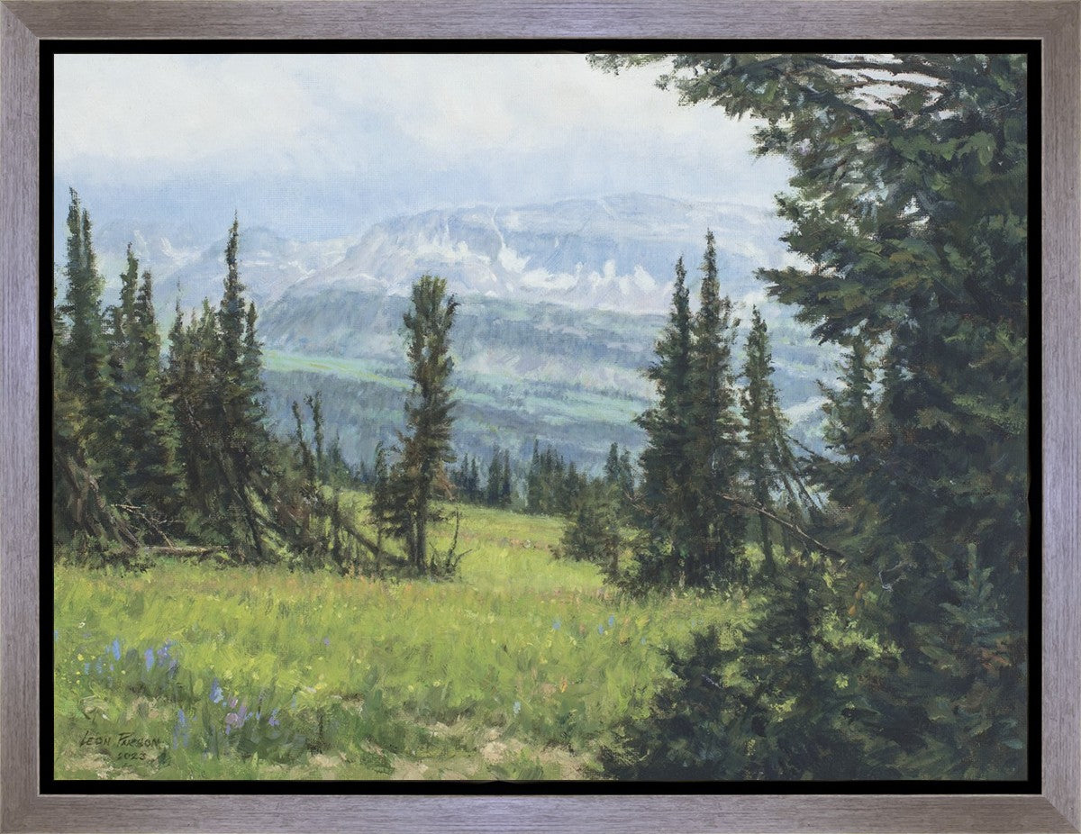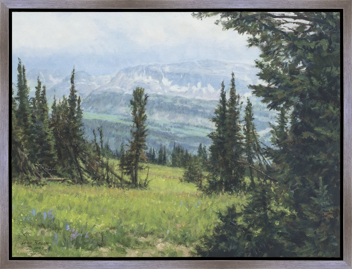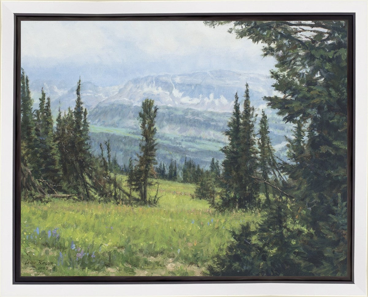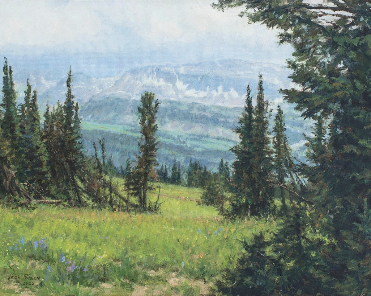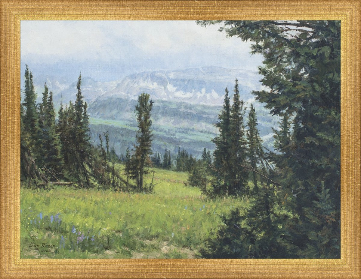 The location for this painting is from a hike up to Table Rock, near the Grand Teton Peak, when I was serving as a leader to a group of young men and young women. I enjoyed the obvious evidence of the severity of the windstorms that are ever present that high up but also loved the wonderful resilience of the stand of pines. It started as a BYUI Landscape class demo but deserved a good amount of additional studio time later.