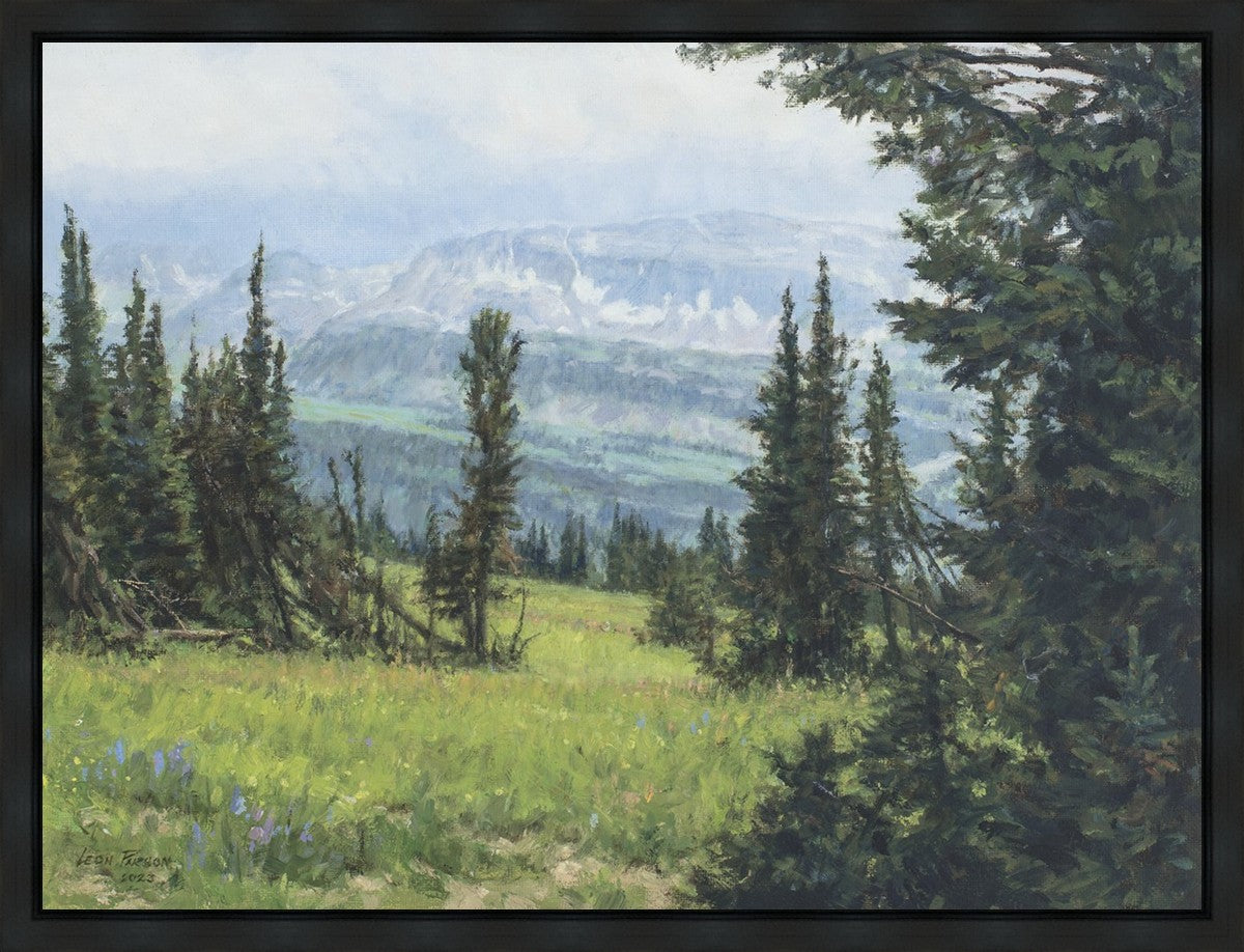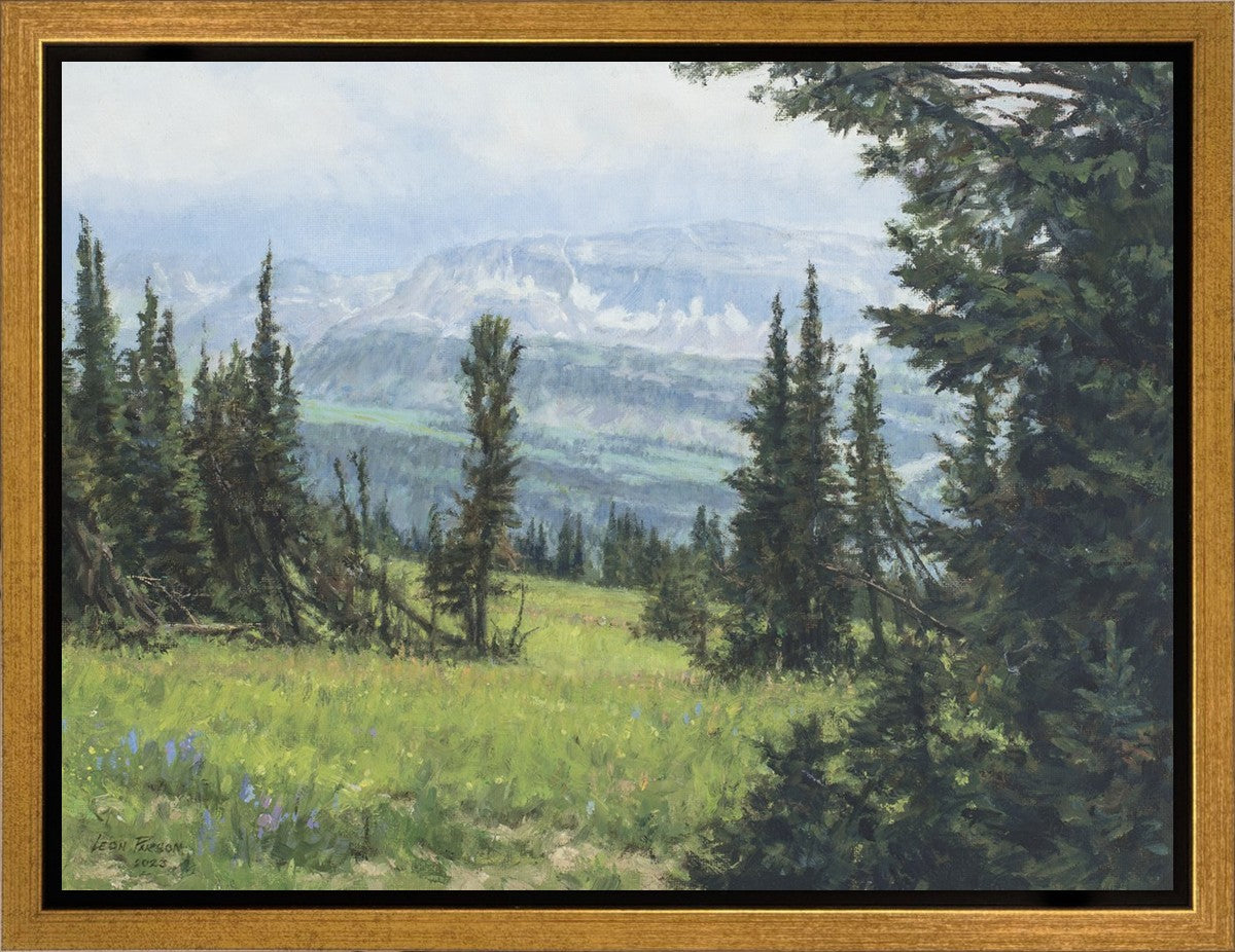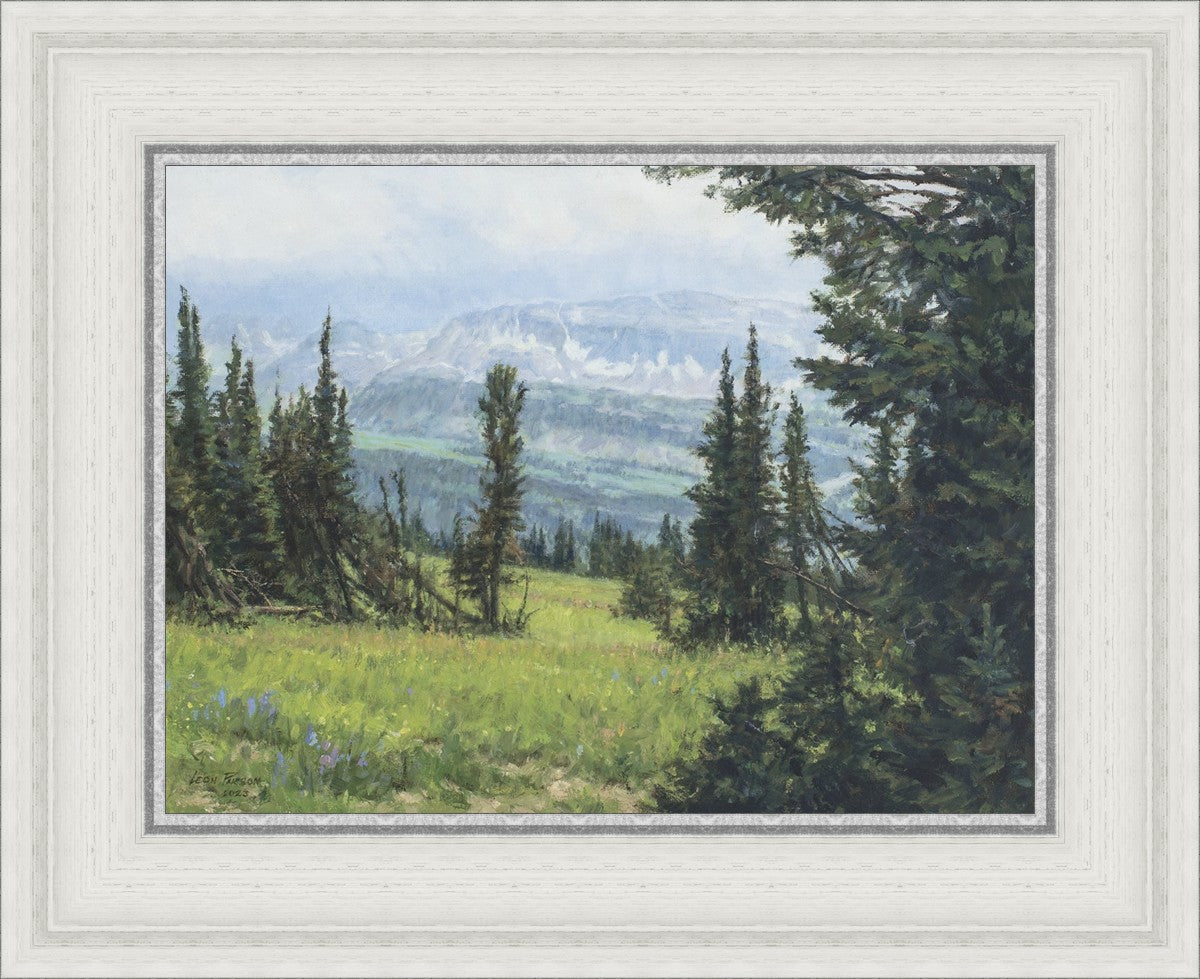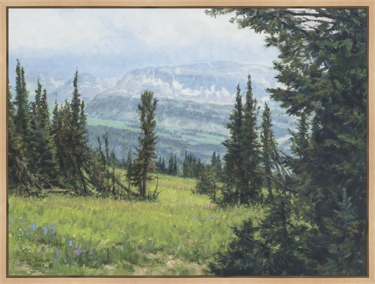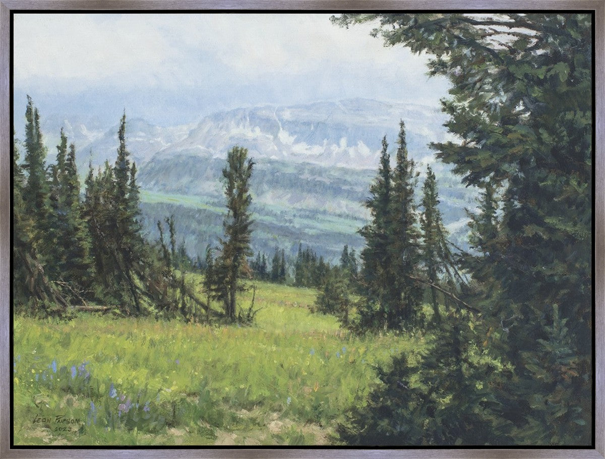 The location for this painting is from a hike up to Table Rock, near the Grand Teton Peak, when I was serving as a leader to a group of young men and young women. I enjoyed the obvious evidence of the severity of the windstorms that are ever present that high up but also loved the wonderful resilience of the stand of pines. It started as a BYUI Landscape class demo but deserved a good amount of additional studio time later.