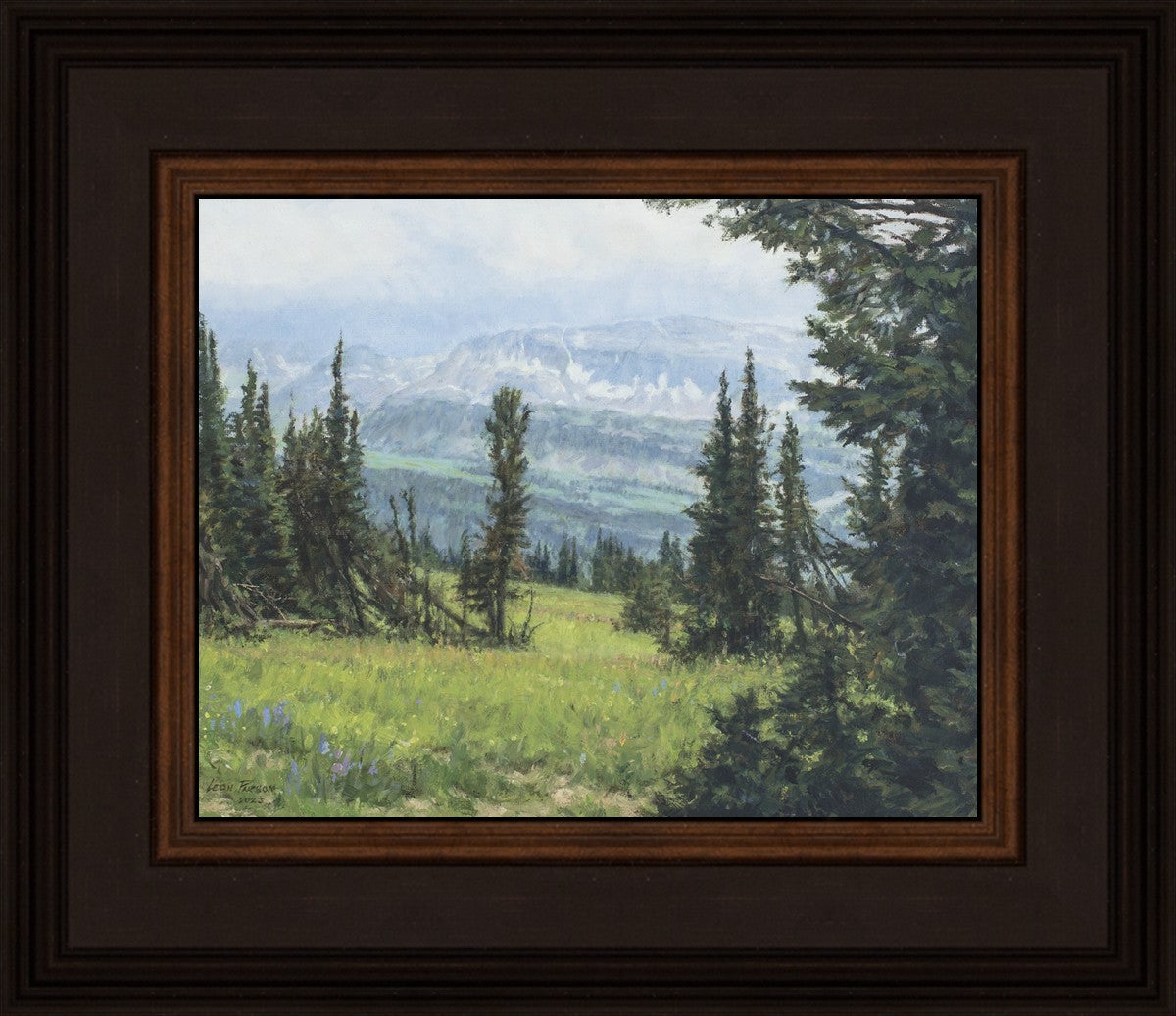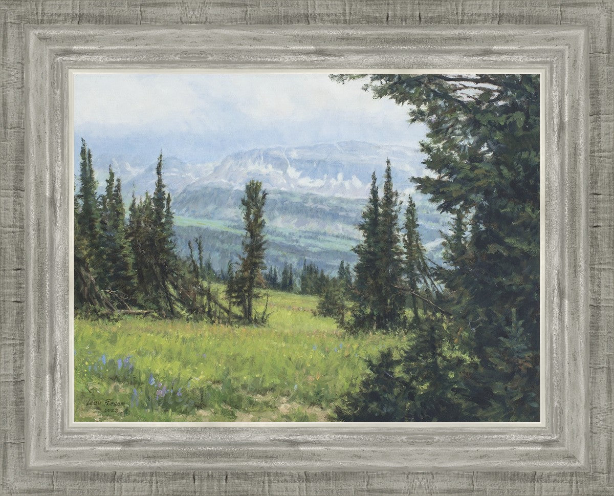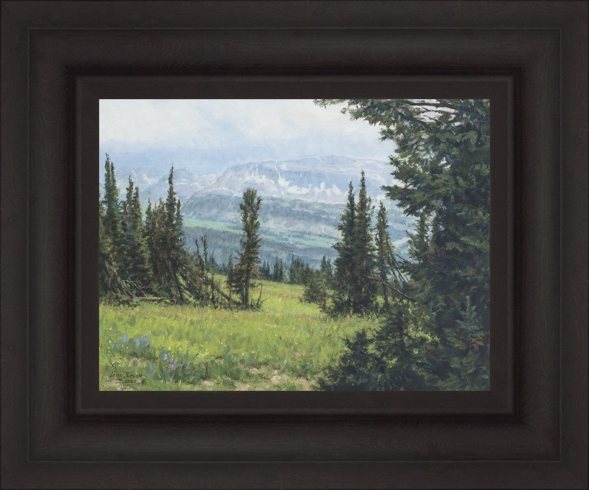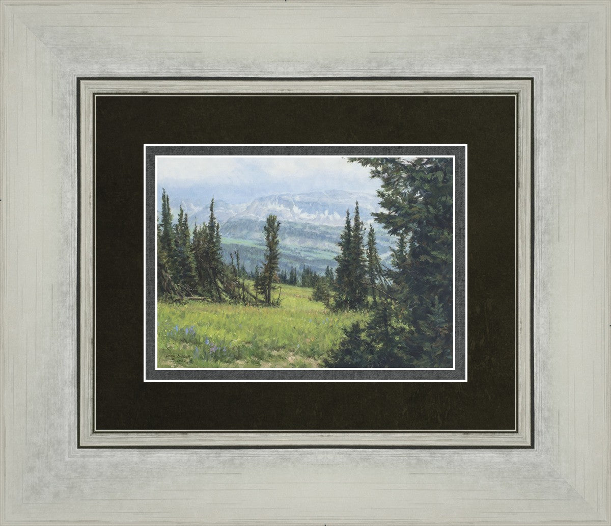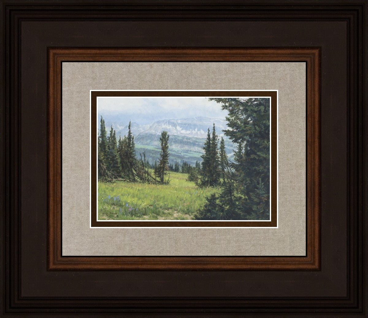 The location for this painting is from a hike up to Table Rock, near the Grand Teton Peak, when I was serving as a leader to a group of young men and young women. I enjoyed the obvious evidence of the severity of the windstorms that are ever present that high up but also loved the wonderful resilience of the stand of pines. It started as a BYUI Landscape class demo but deserved a good amount of additional studio time later.