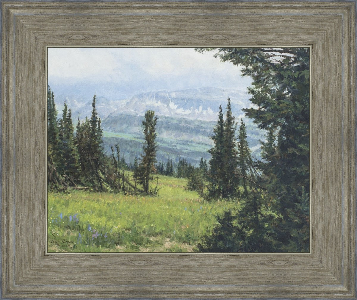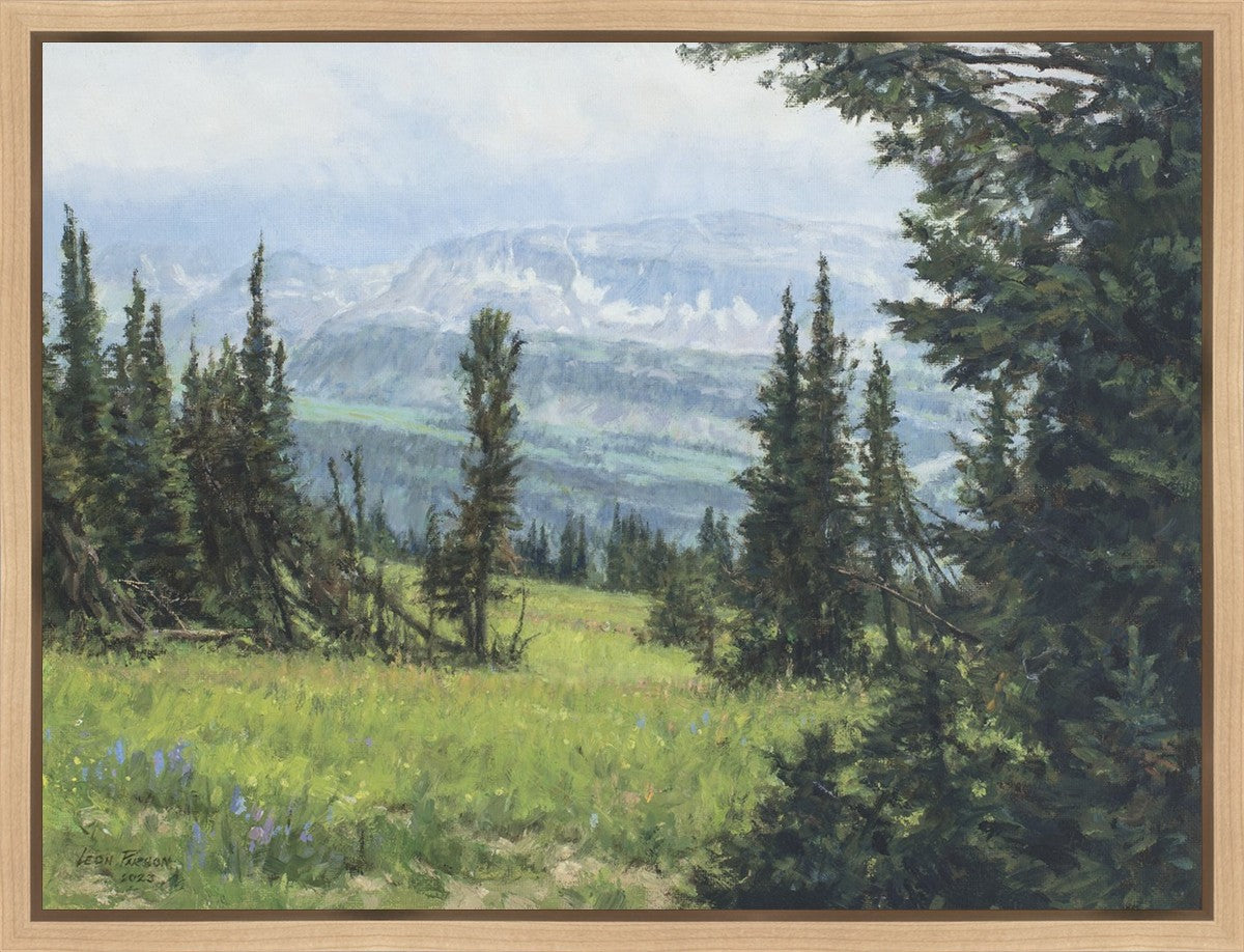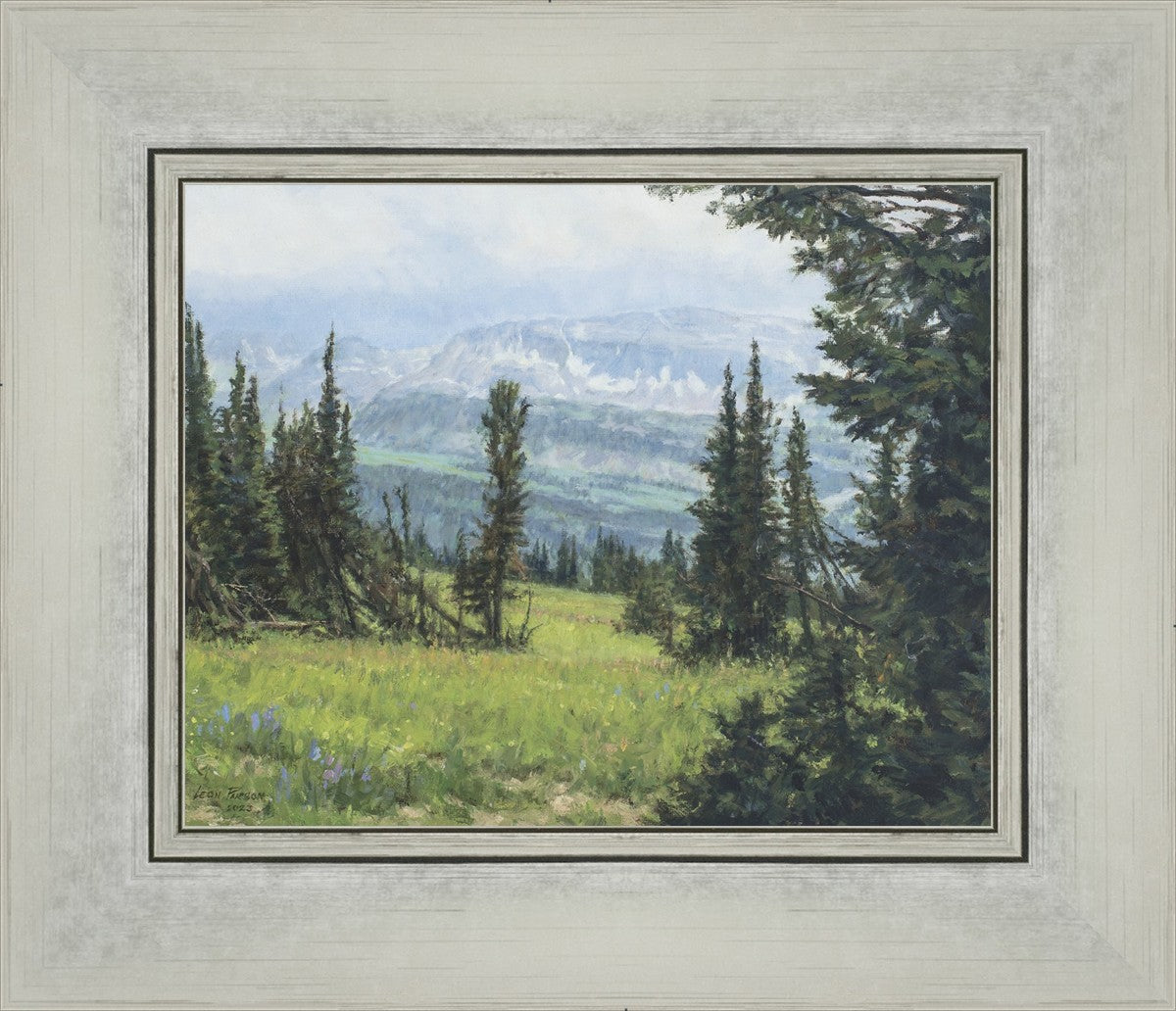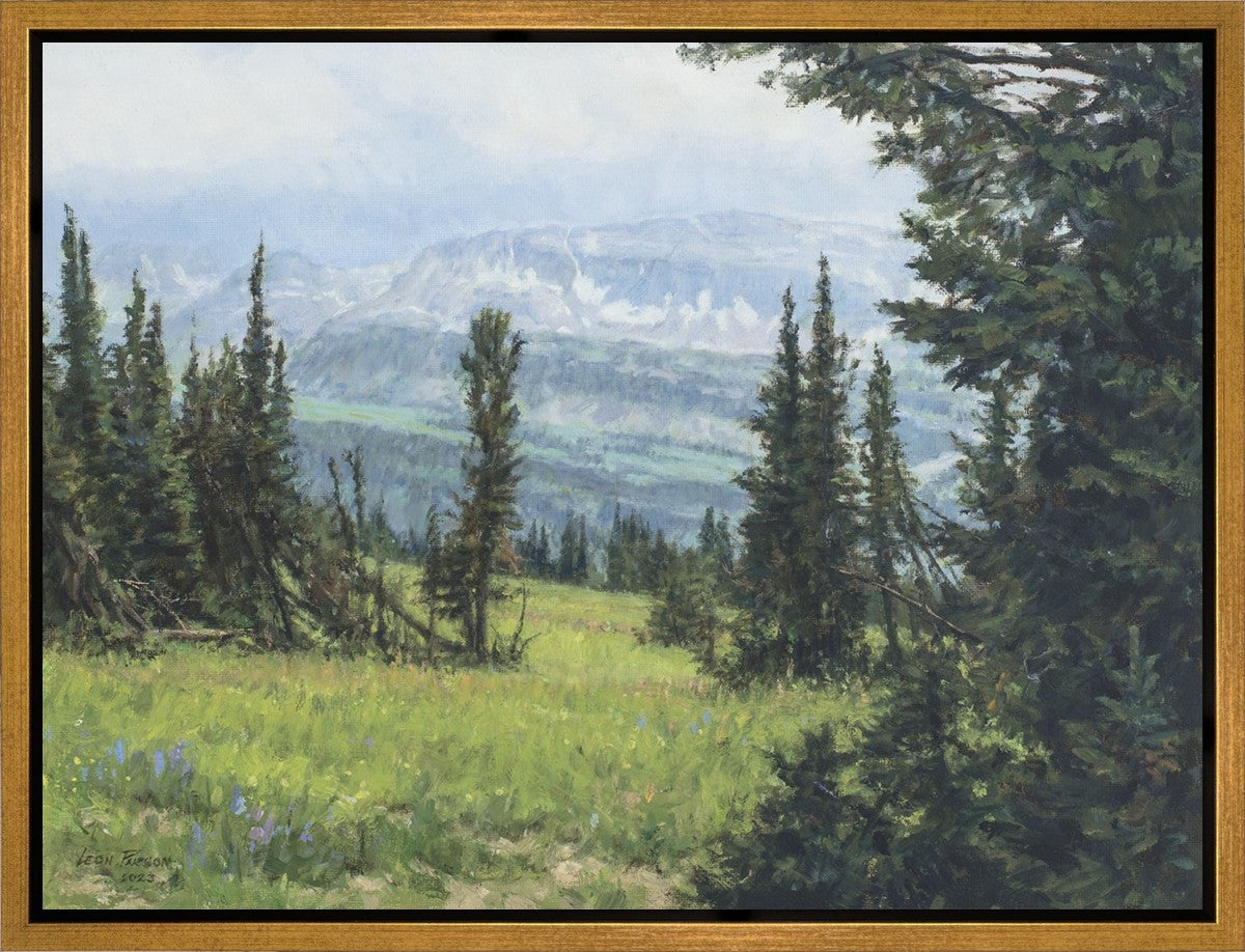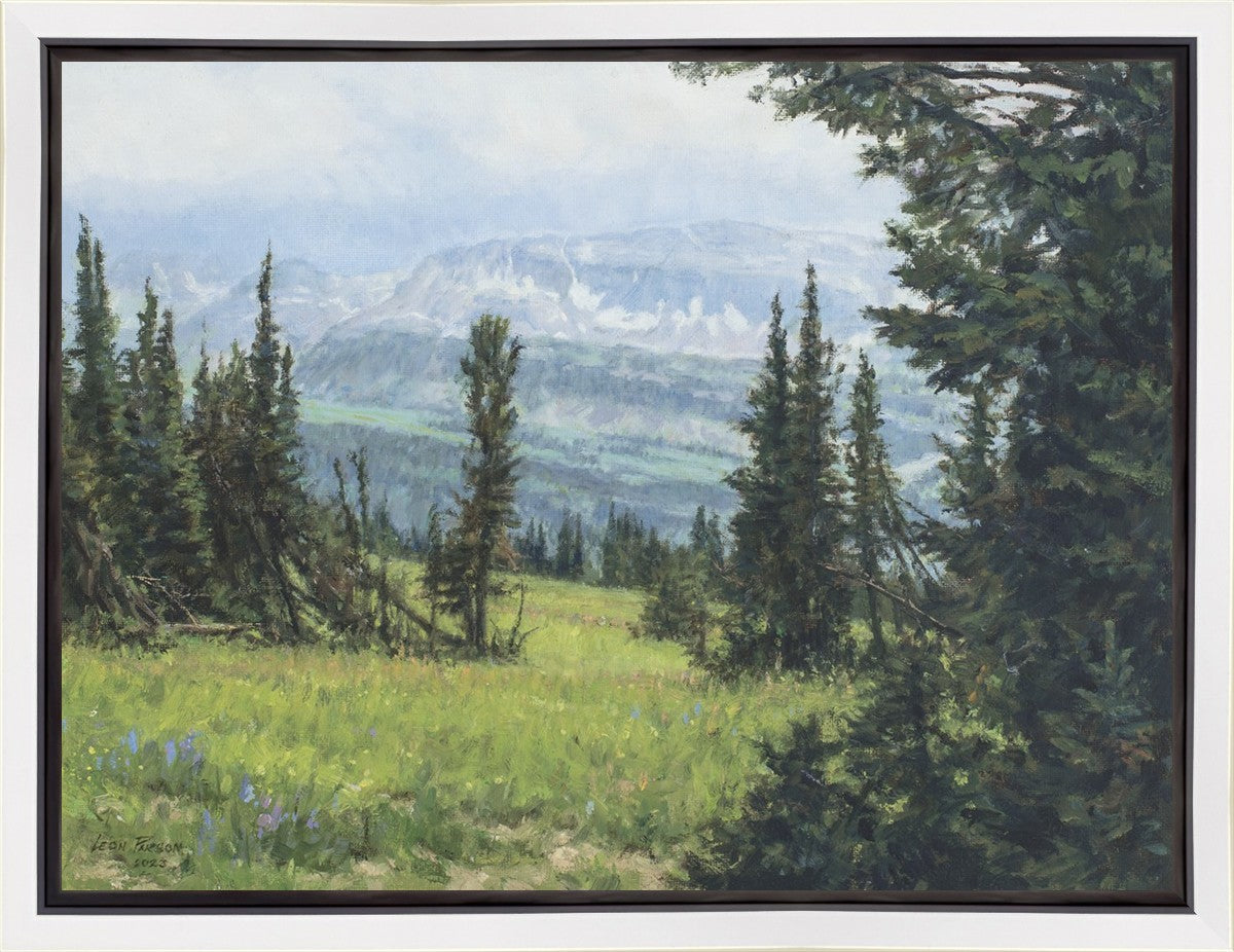 The location for this painting is from a hike up to Table Rock, near the Grand Teton Peak, when I was serving as a leader to a group of young men and young women. I enjoyed the obvious evidence of the severity of the windstorms that are ever present that high up but also loved the wonderful resilience of the stand of pines. It started as a BYUI Landscape class demo but deserved a good amount of additional studio time later.
