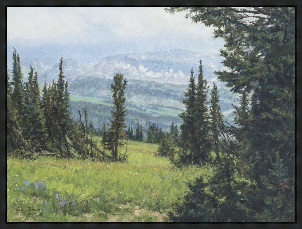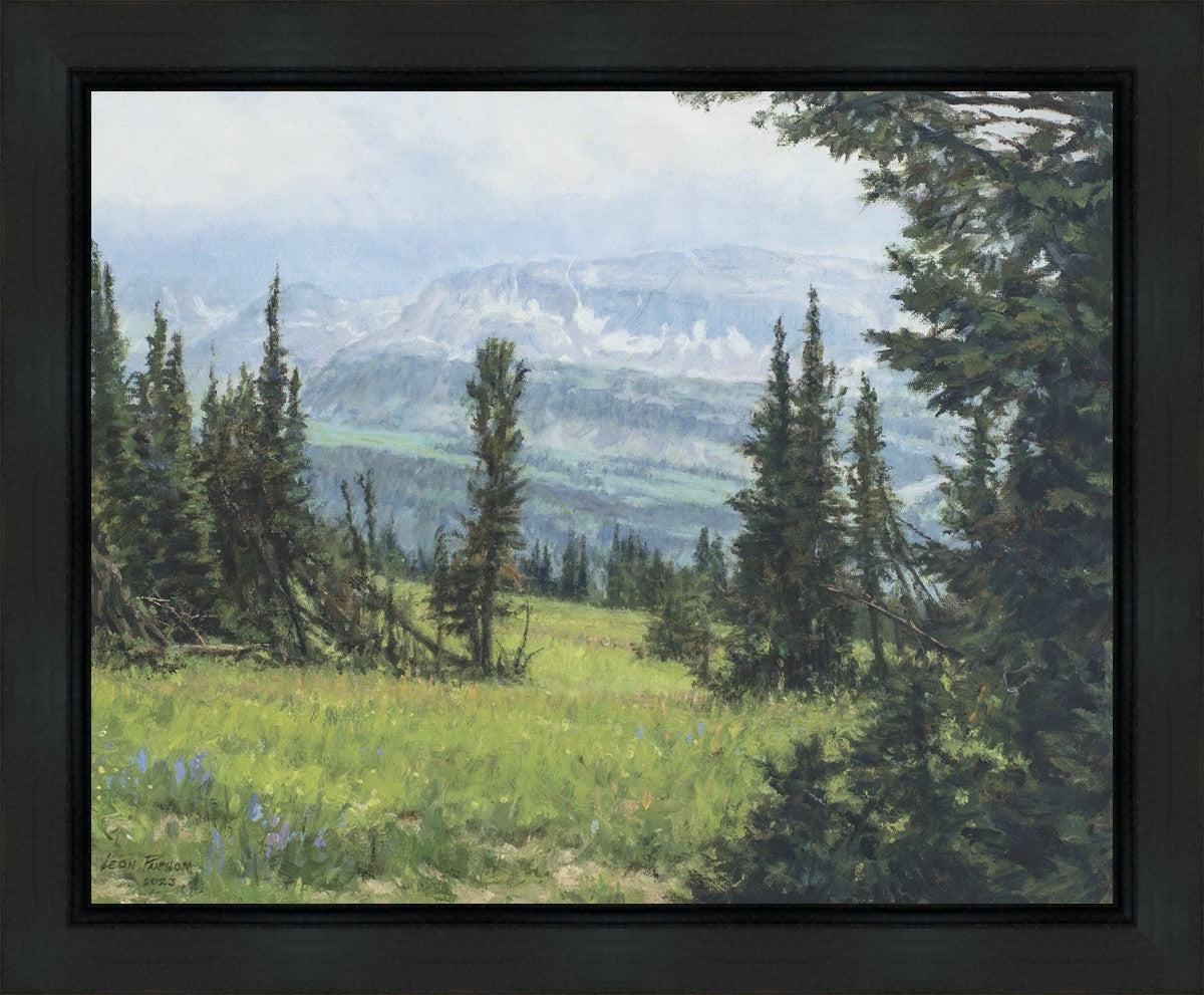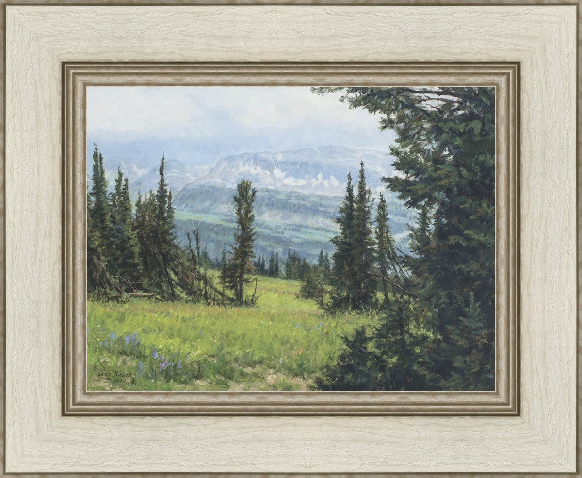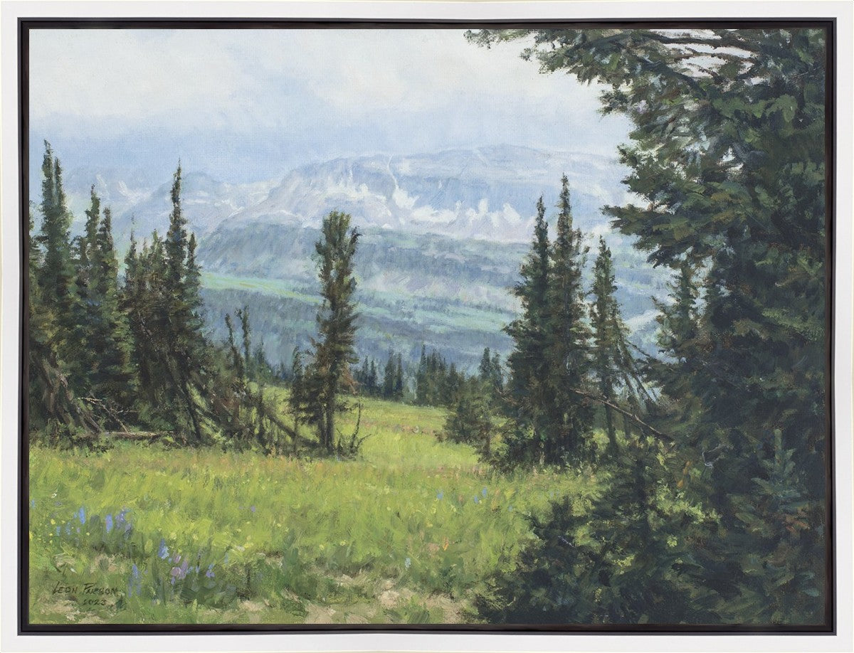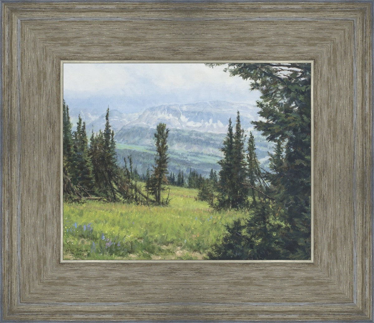 The location for this painting is from a hike up to Table Rock, near the Grand Teton Peak, when I was serving as a leader to a group of young men and young women. I enjoyed the obvious evidence of the severity of the windstorms that are ever present that high up but also loved the wonderful resilience of the stand of pines. It started as a BYUI Landscape class demo but deserved a good amount of additional studio time later.