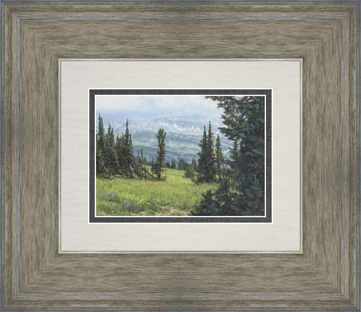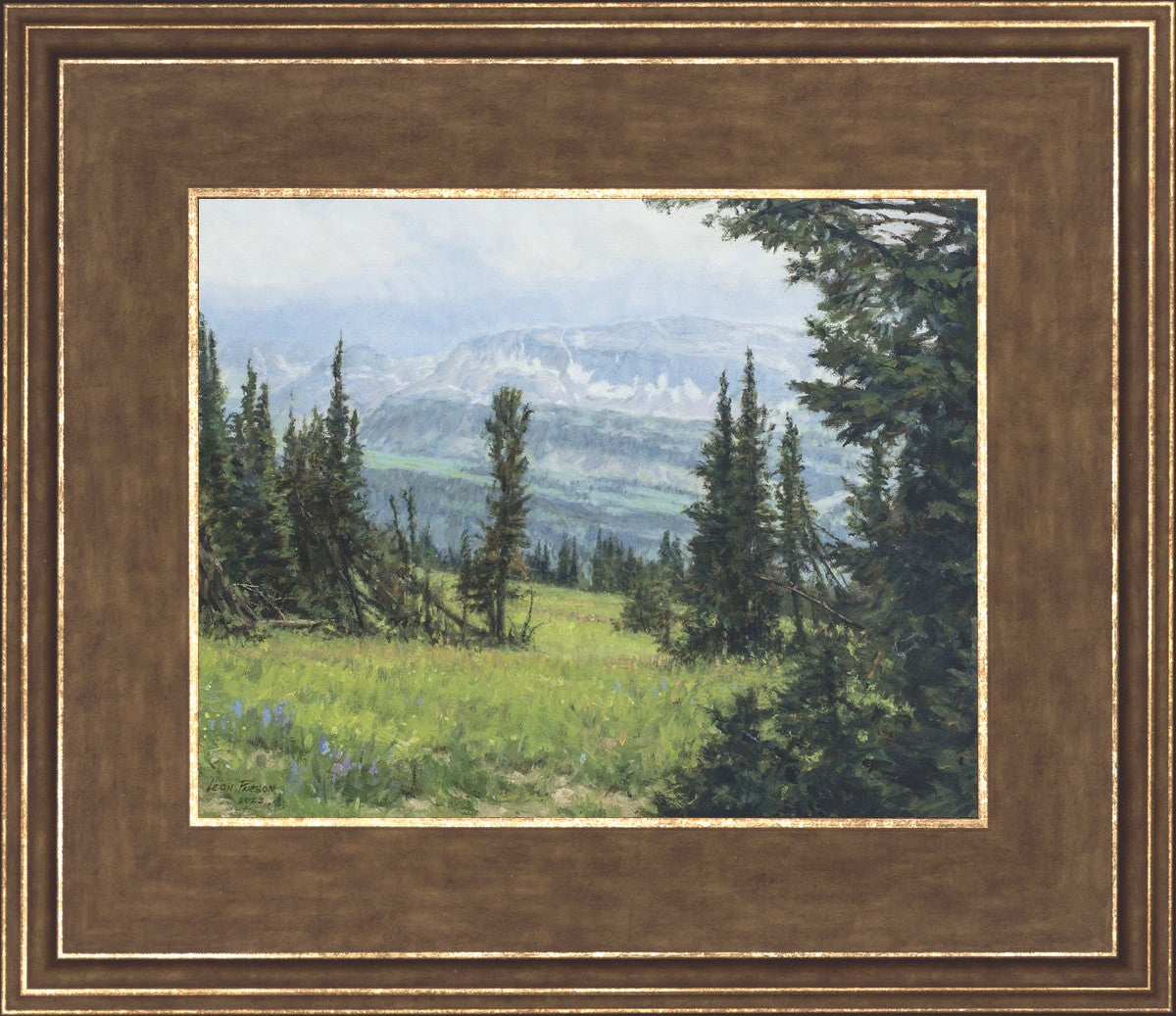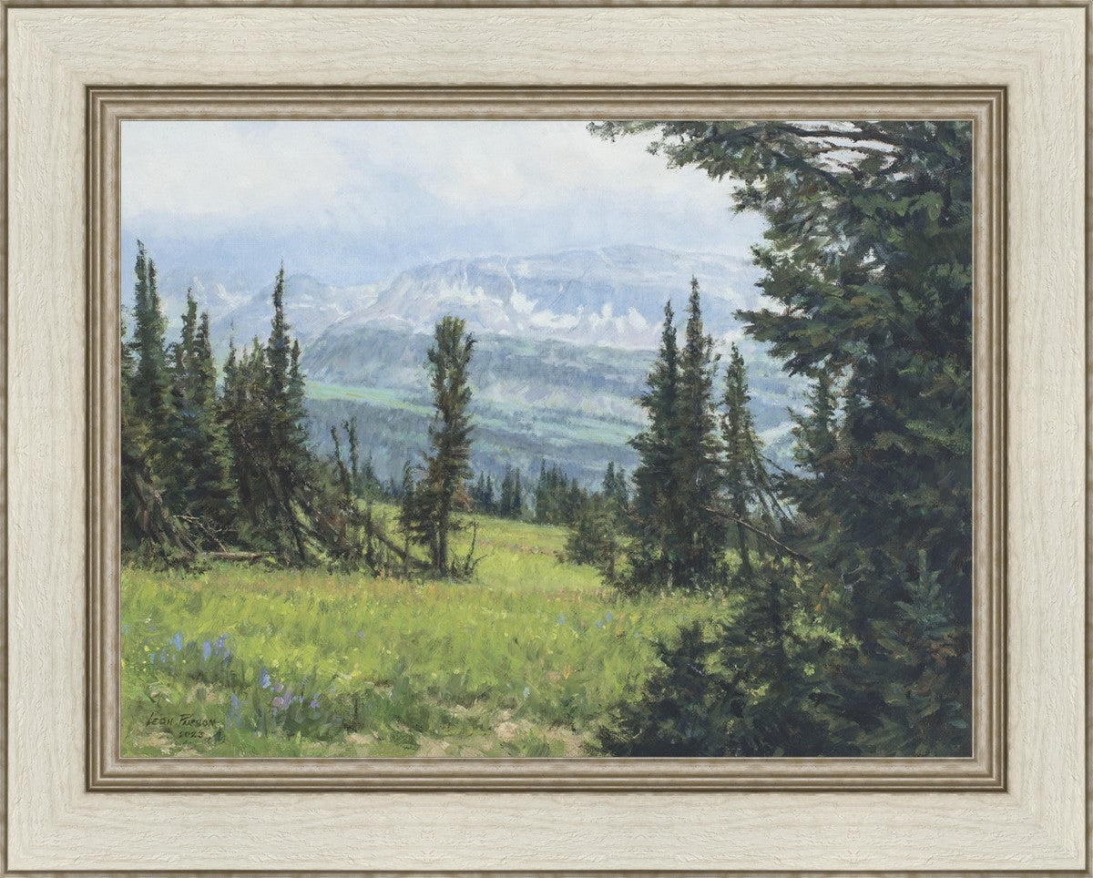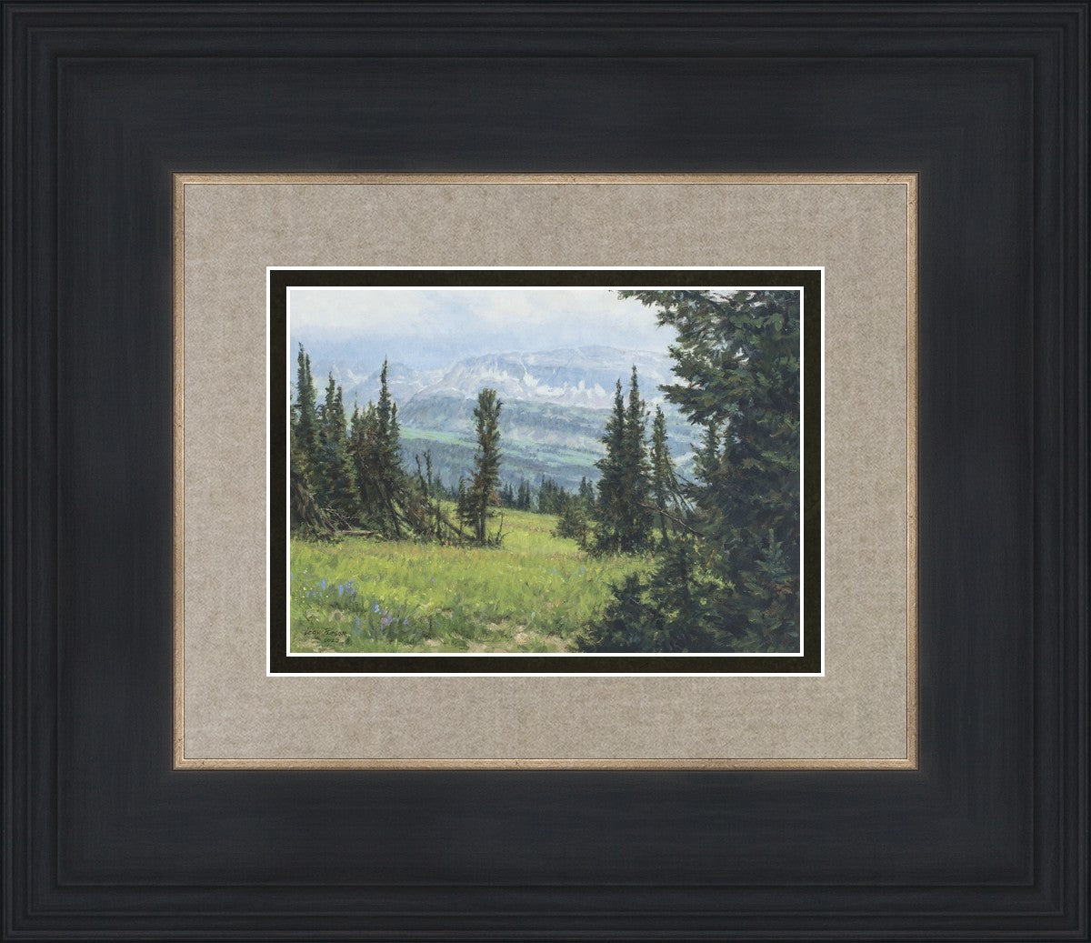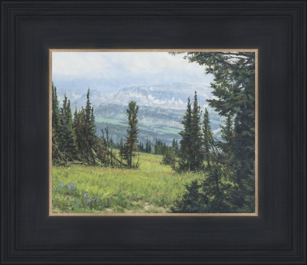 The location for this painting is from a hike up to Table Rock, near the Grand Teton Peak, when I was serving as a leader to a group of young men and young women. I enjoyed the obvious evidence of the severity of the windstorms that are ever present that high up but also loved the wonderful resilience of the stand of pines. It started as a BYUI Landscape class demo but deserved a good amount of additional studio time later.