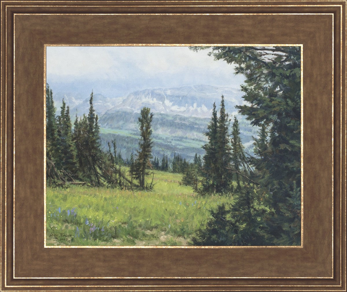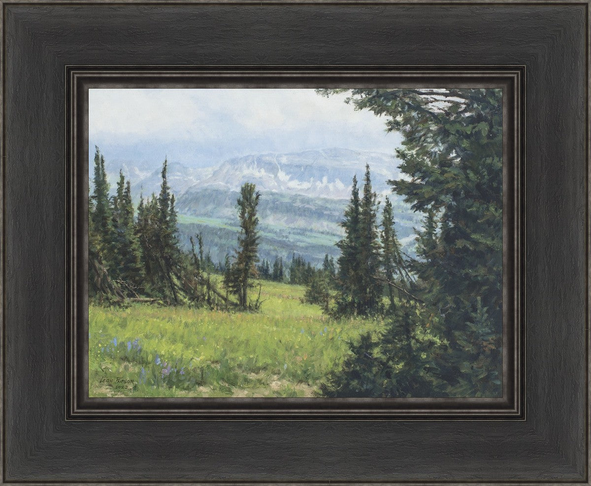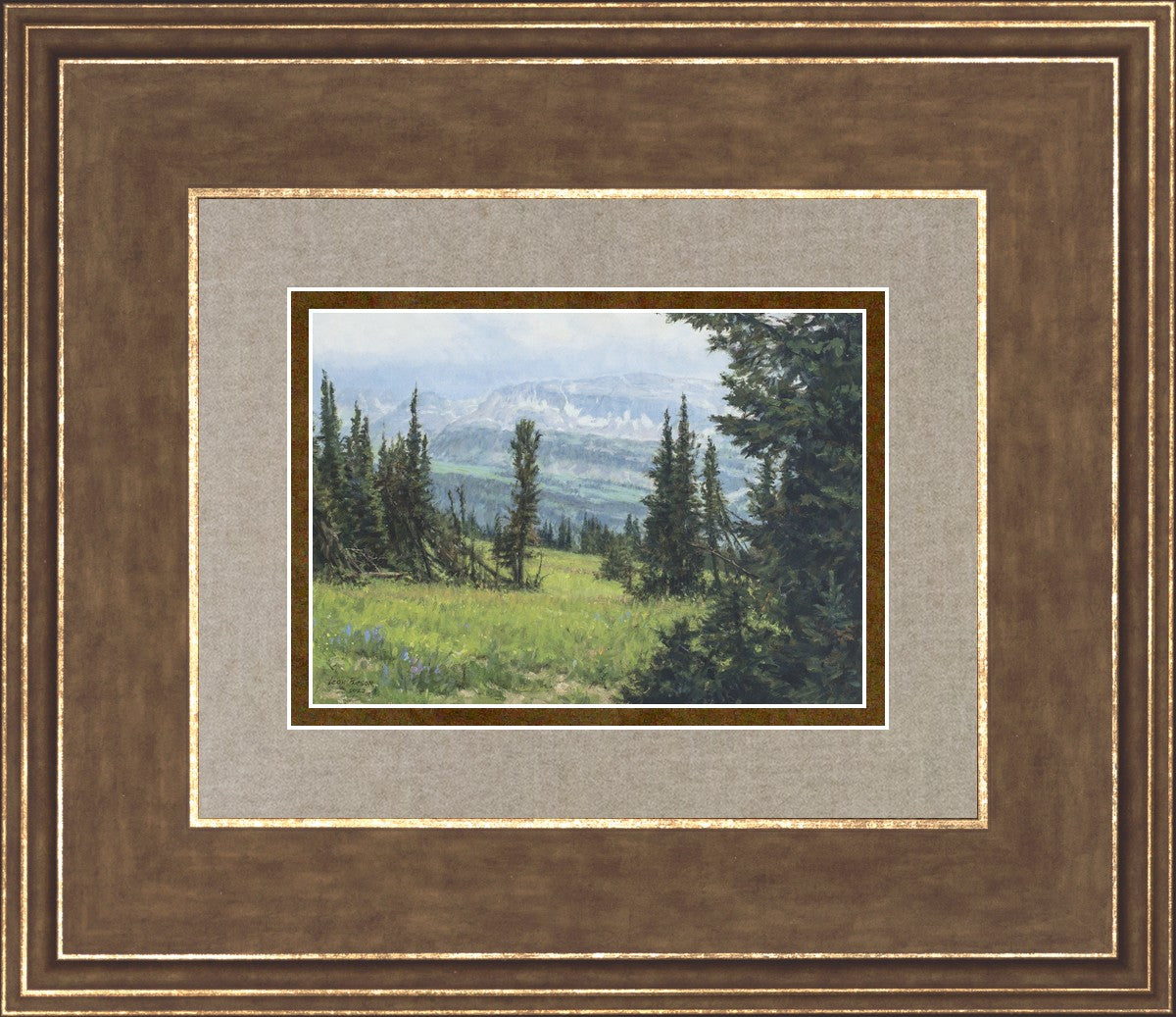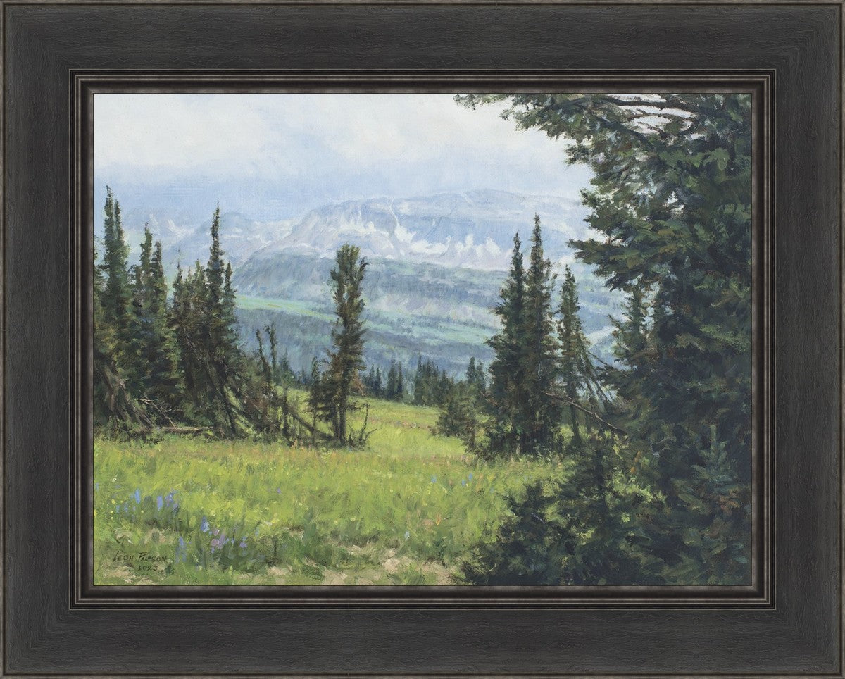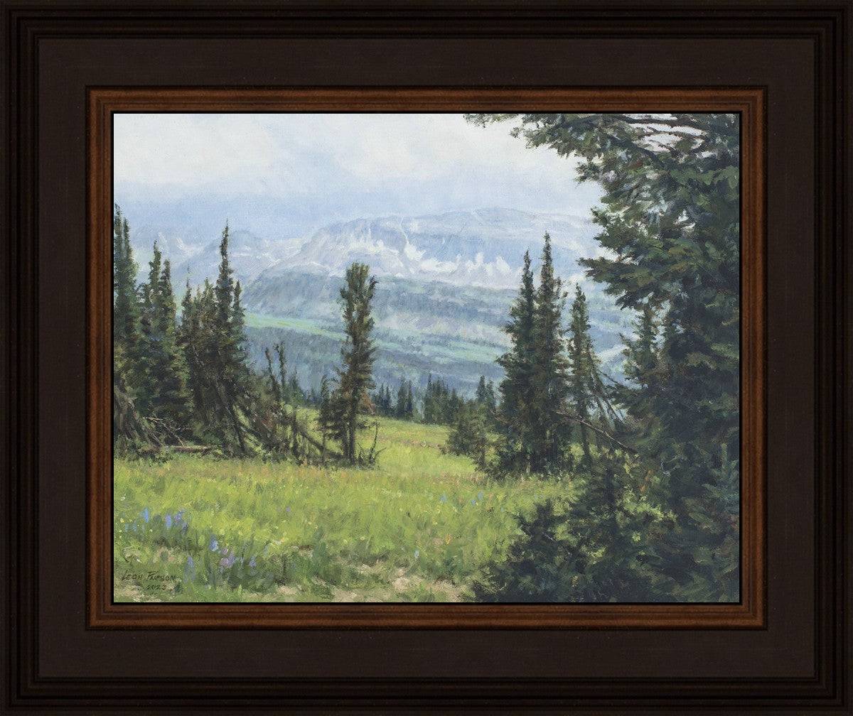 The location for this painting is from a hike up to Table Rock, near the Grand Teton Peak, when I was serving as a leader to a group of young men and young women. I enjoyed the obvious evidence of the severity of the windstorms that are ever present that high up but also loved the wonderful resilience of the stand of pines. It started as a BYUI Landscape class demo but deserved a good amount of additional studio time later.