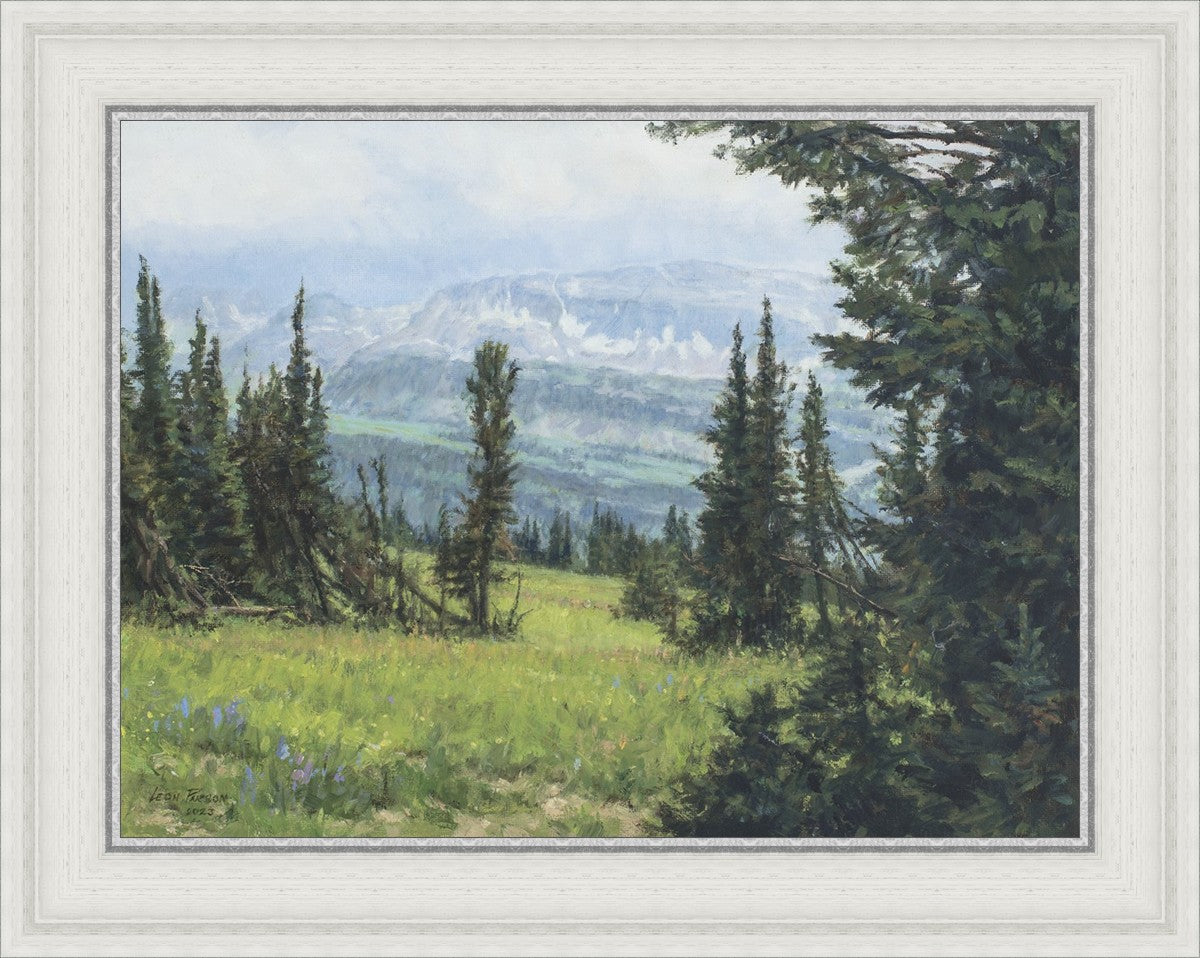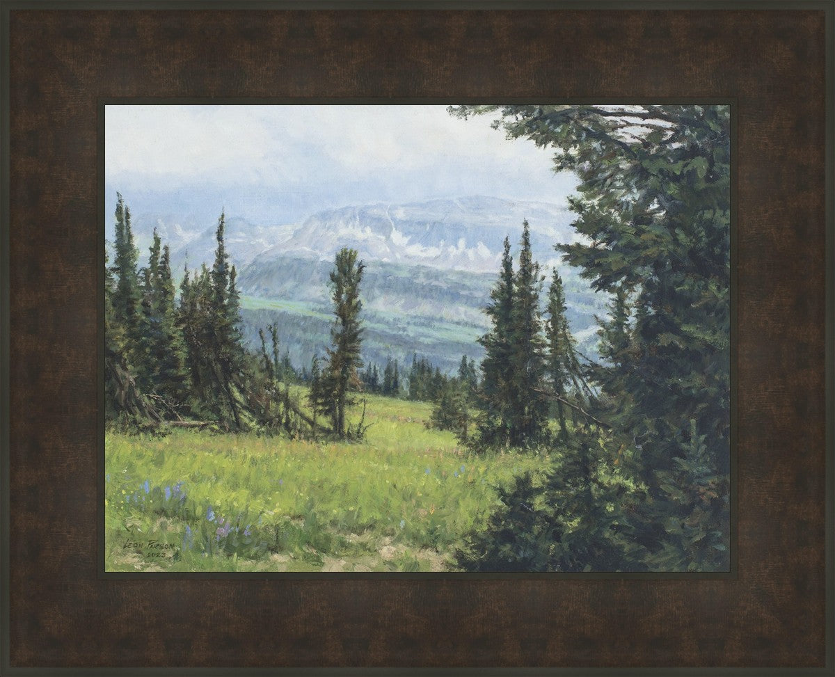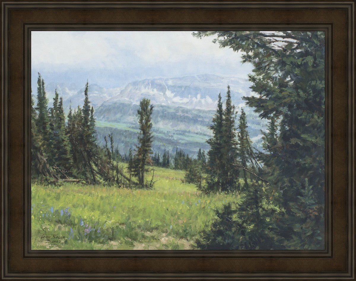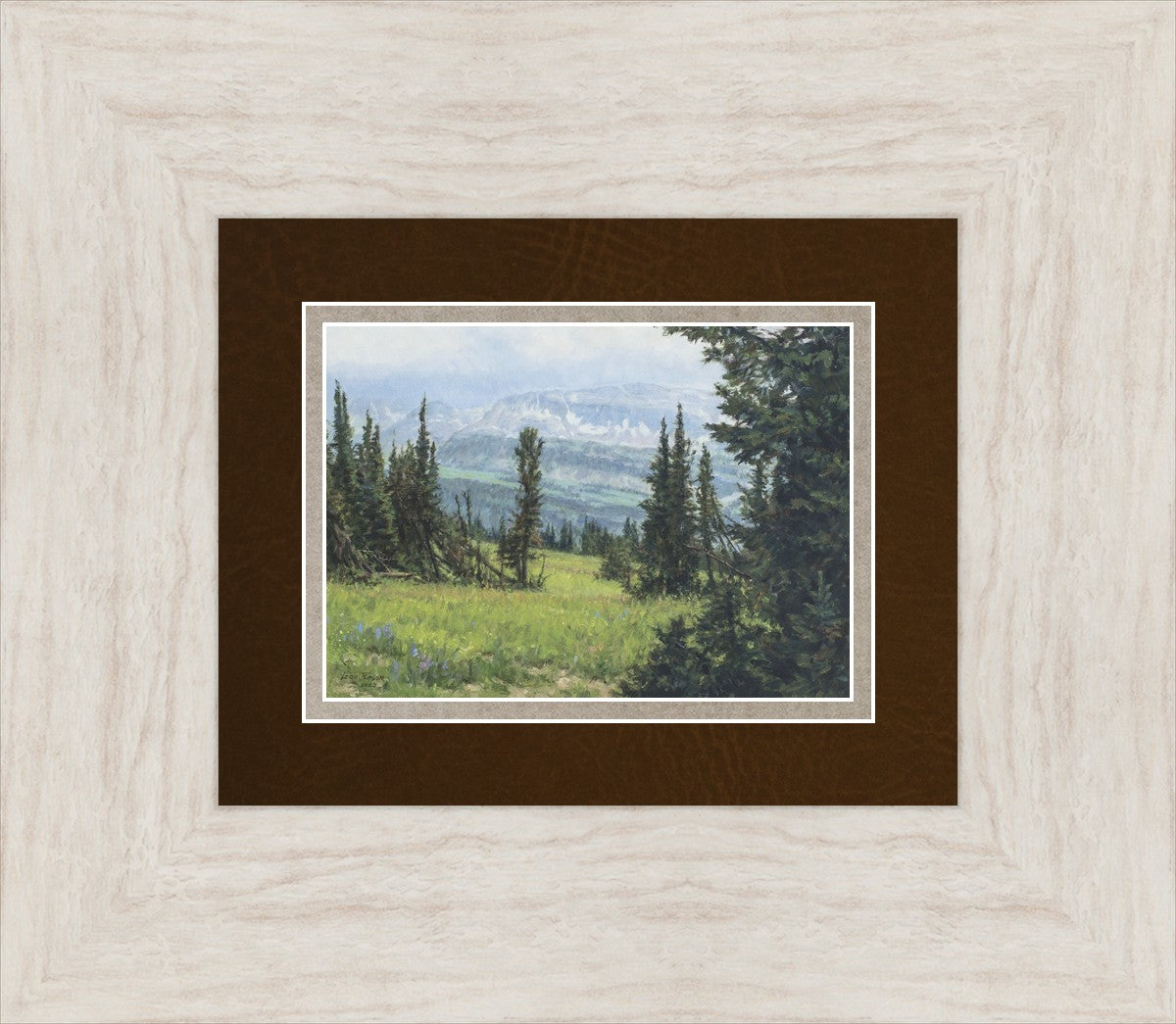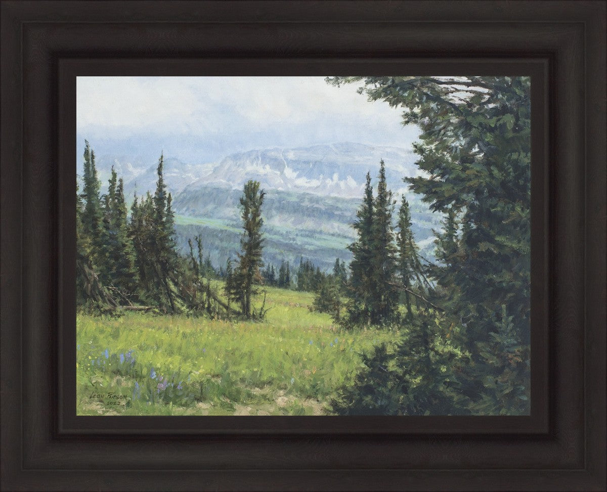 The location for this painting is from a hike up to Table Rock, near the Grand Teton Peak, when I was serving as a leader to a group of young men and young women. I enjoyed the obvious evidence of the severity of the windstorms that are ever present that high up but also loved the wonderful resilience of the stand of pines. It started as a BYUI Landscape class demo but deserved a good amount of additional studio time later.