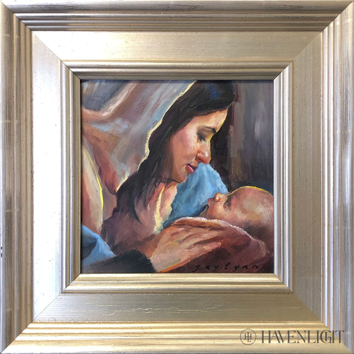 After the miraculous conception, and the humble delivery of the Son of God, Mary beholds her child, the Savior of the world, with wondrous awe.